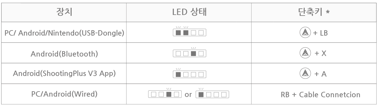 PC 또는 안드로이드 폰과 전용동글을 통해서 연결할 경우 위와 같이 LED가 표시된다. 중앙의 샥스 로고가 있는 전원 버튼과 LB 버튼을 누르면 전용동 글과 연결이 된다.