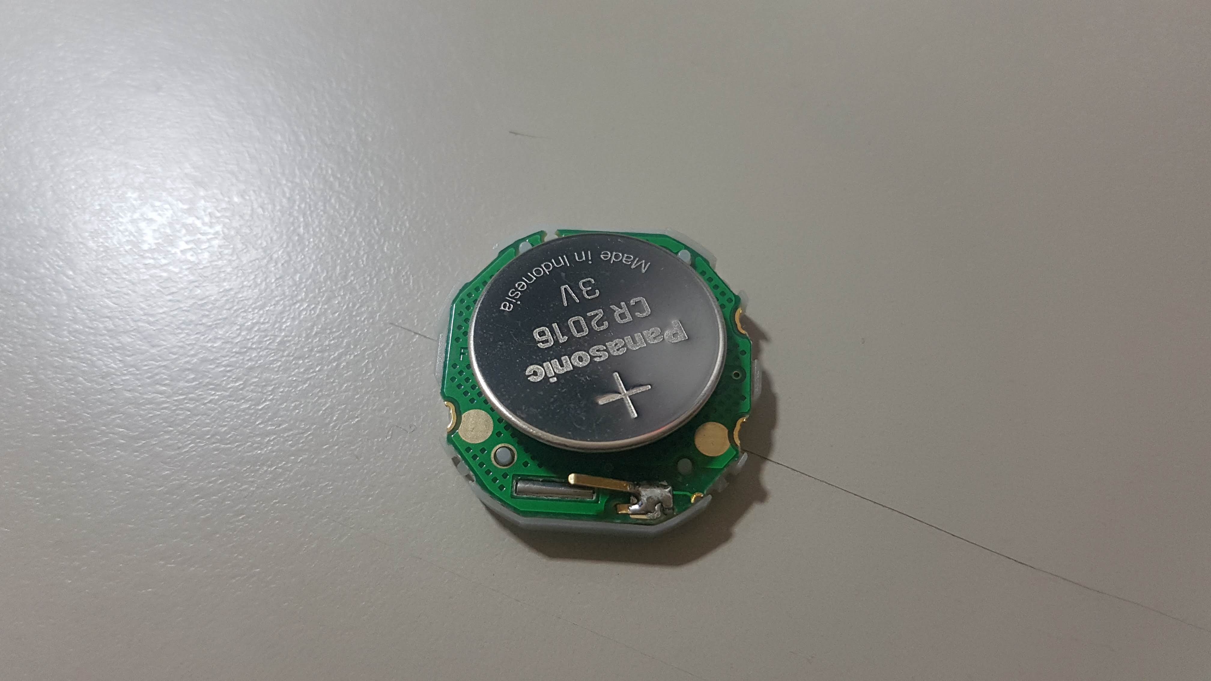 걸쇠를 모두 풀면 커버가 벗겨지고 드디어 배터리가 보인다. 파나소닉 CR2016이 들어있다. 건전지는 3V짜리인데 멀티 테스터로 전압을 재어보니 1.4V 밖에 나오지 않는다. 역시나 배터리가 다 된 것이다. 새 배터리로 교체해주고 스테인리스 커버를 다시 걸쇠에 걸어서 덮어준다.