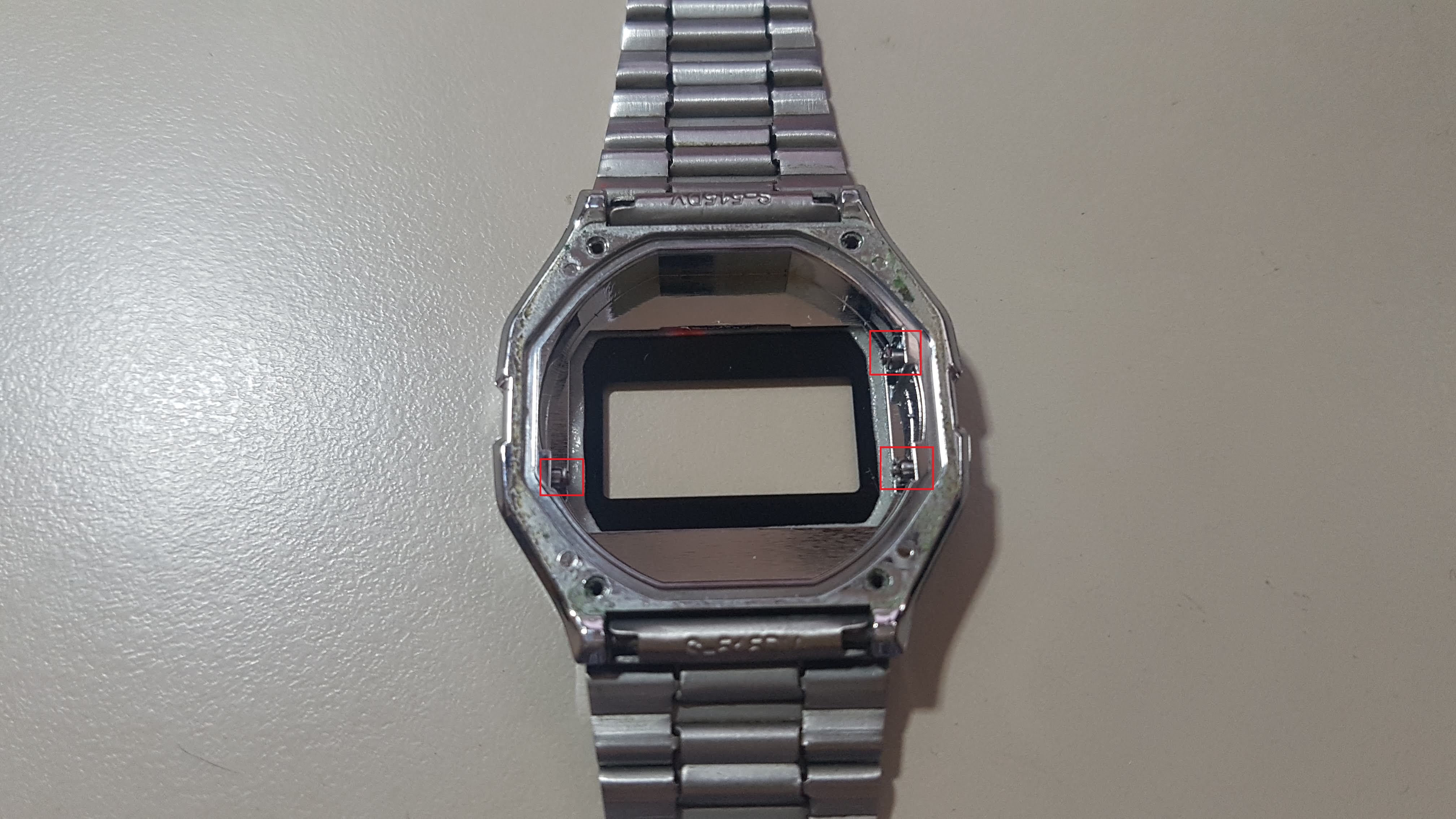 무브먼트 재조립을 위해서는 시계 하우징에 달려있는 버튼들을 바깥쪽으로 밀어주어야 한다. 이걸 안밀어주고 억지로 쑤셔 넣을 경우 망가질 우려가 있다. 밀어주어야 할 버튼들을 빨간색으로 표시해 놓았다.