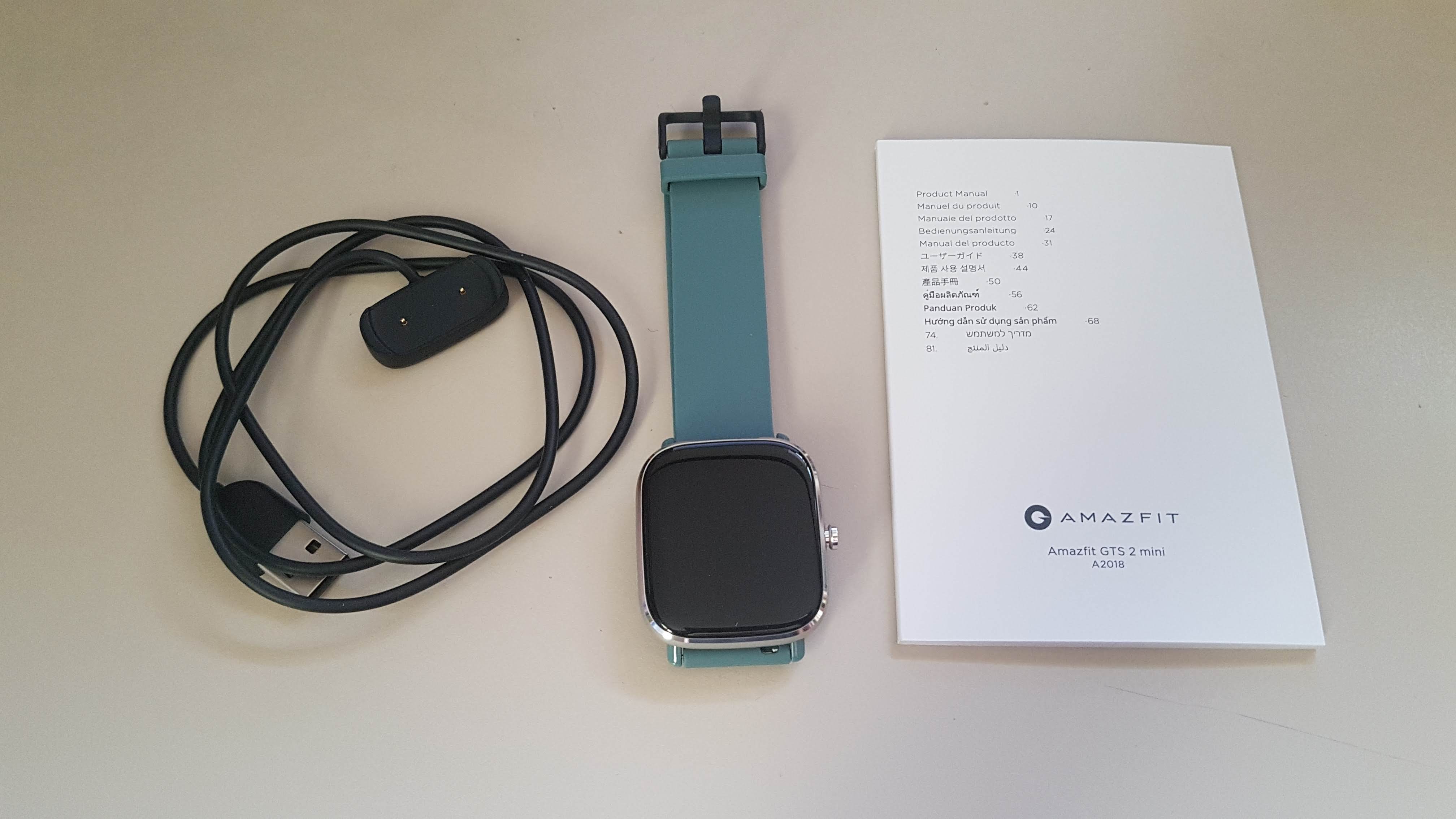 구성품은 본체, 충전케이블, 설명서로 이루어져 있다. 설명서에는 한글도 포함되어 있다. 워치 무게가 매우 가볍다.(19.5g) 미밴드와 같이 들어보니 거의 차이를 알 수 없을 정도의 가벼움을 가지고 있다. 크기도 이름에 걸맞게 스마트워치 치고는 작은 사이즈여서 여성들도 부담없이 차고 다닐 수 있을 것 같다. 색상은 그린을 선택했는데 좀 칙칙한 그린이라고 해야하나 좀 어두운 그린 색상이다. 그냥 블랙 살걸 이라는 생각이 들긴 했다. 핑크도 있다.