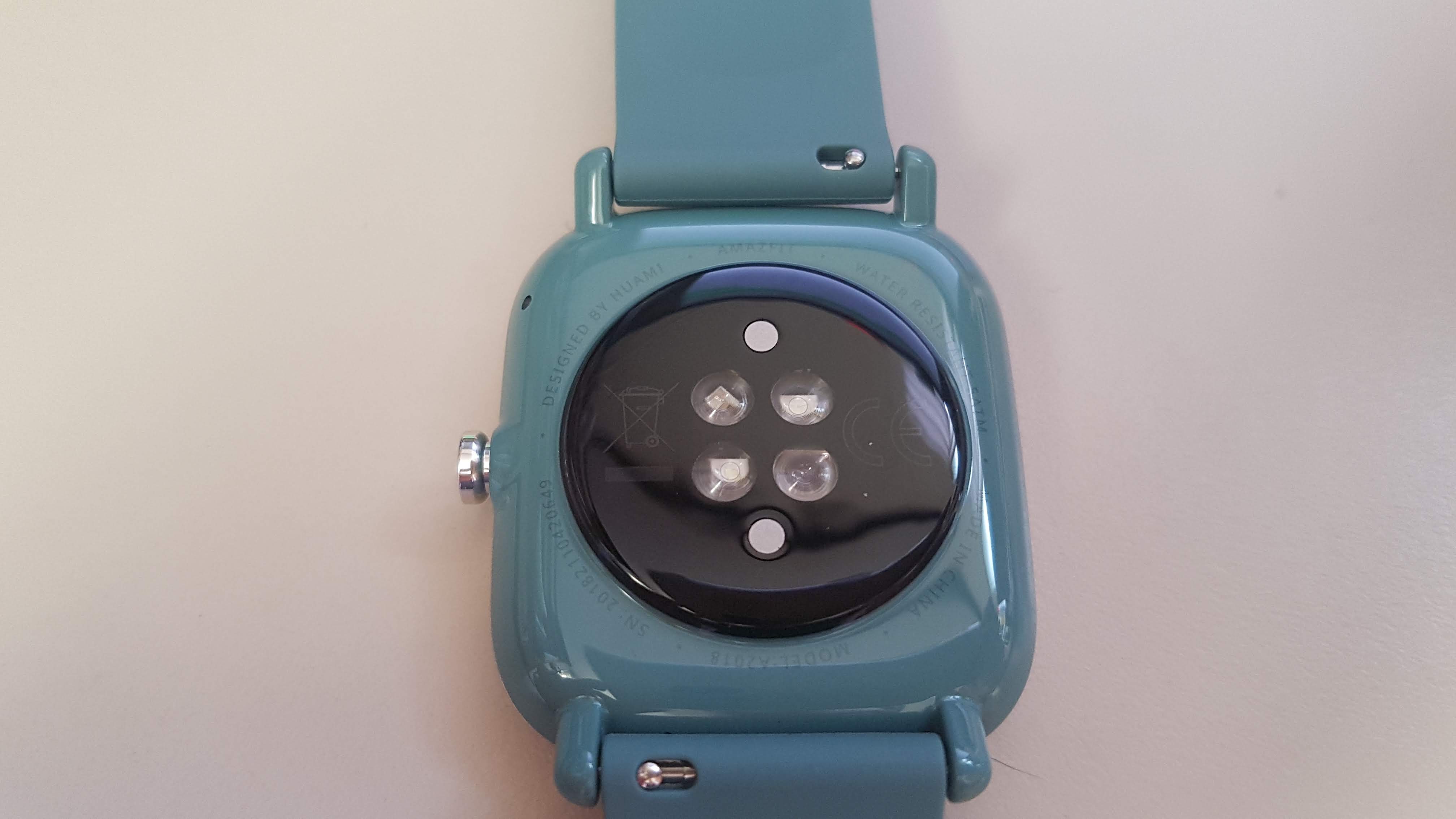 뒷면에는 각종 센서와 충전단자가 있다. 하이그로시 마감으로 뒷면도 광택이 난다. 글씨가 작게 쓰여 있는데 어메이즈 핏은 HUAMI라는 회사에서 만들었다고 쓰여있다. 아마도 샤오미 생태계에 속해 있는 회사로 생각이 된다.