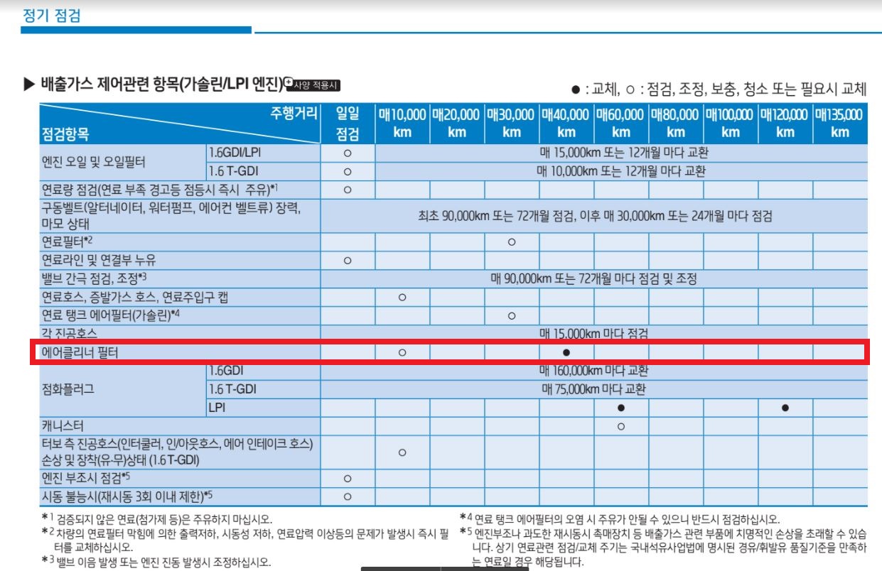 많은 사람들이 엔진오일을 교체할 때 같이 교환하는 필터로 엔진오일 필터와 에어클리너 필터를 갈아주는 것으로 알고 있다. 예전에 정비소에서 엔진오일을 갈 때도 그렇게 했던 것으로 알고 있어서 나도 DIY로 엔진오일 교체 시 엔진오일 필터와 에어클리너 필터를 같이 갈아주었다. 그런데 그럴때마다 느끼는 것이 1만 KM를 사용한 에어클리너 필터가 생각 외로 깨끗했다는 것이다. 궁금증이 생겨서 오늘 매뉴얼을 찾아보니 아래와 같았다.