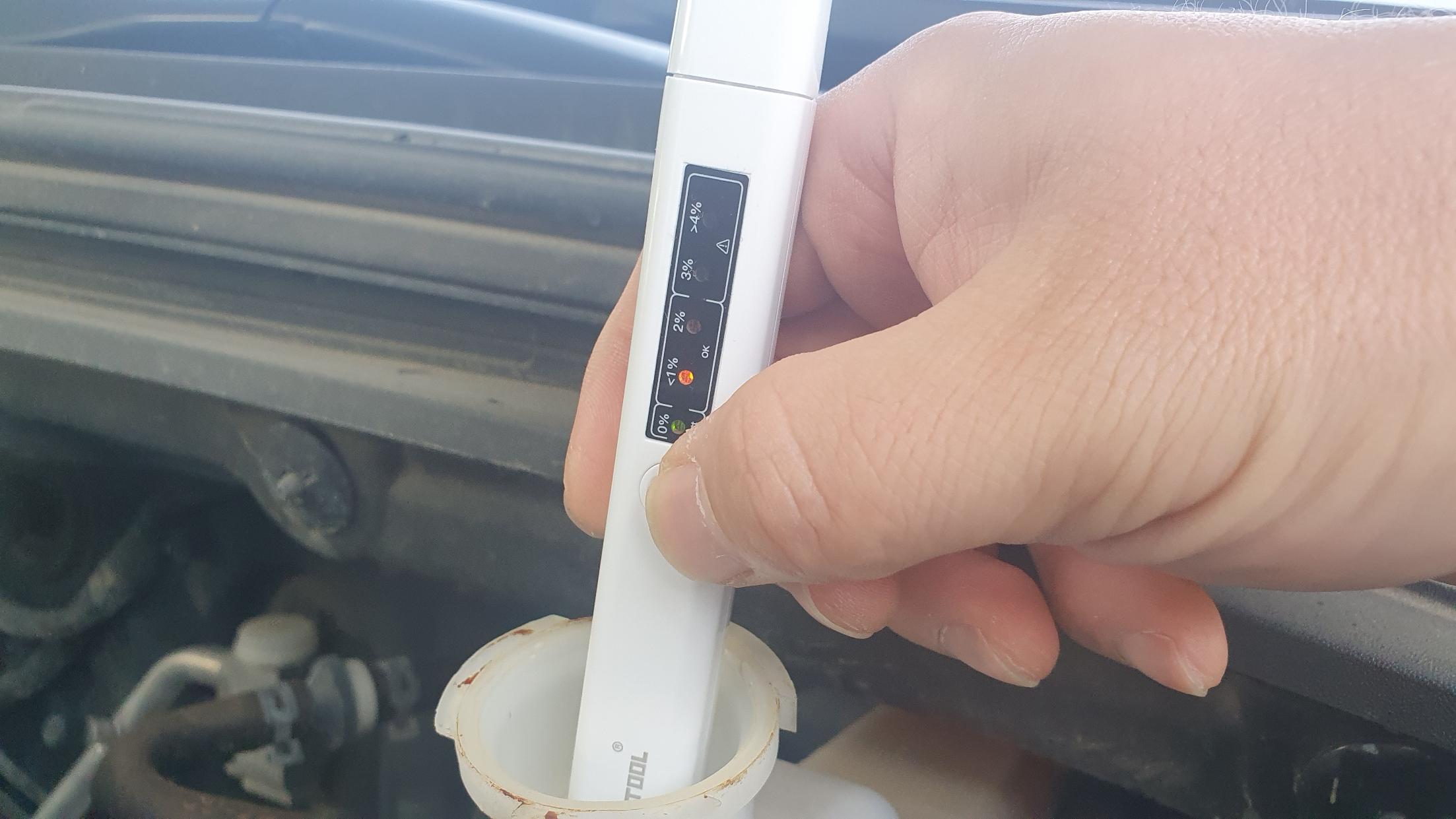 테스터기의 전원을 눌러주면 0%에 녹색불이 들어오고 브레이크액에 담그면 수분을 측정해서 알려준다. 내 차의 경우 1% 미만으로 측정되었다. 7만KM를 주행했지만 양호하며 아직 교체할 필요가 없는 것이다. 실제로 육안으로 본 브레이크액의 색깔도 옅은 식용유색으로 그리 오염되어 보이지 않았다. 당분간 브레이크에 대해서는 안심하고 탈 수 있을 것 같다.