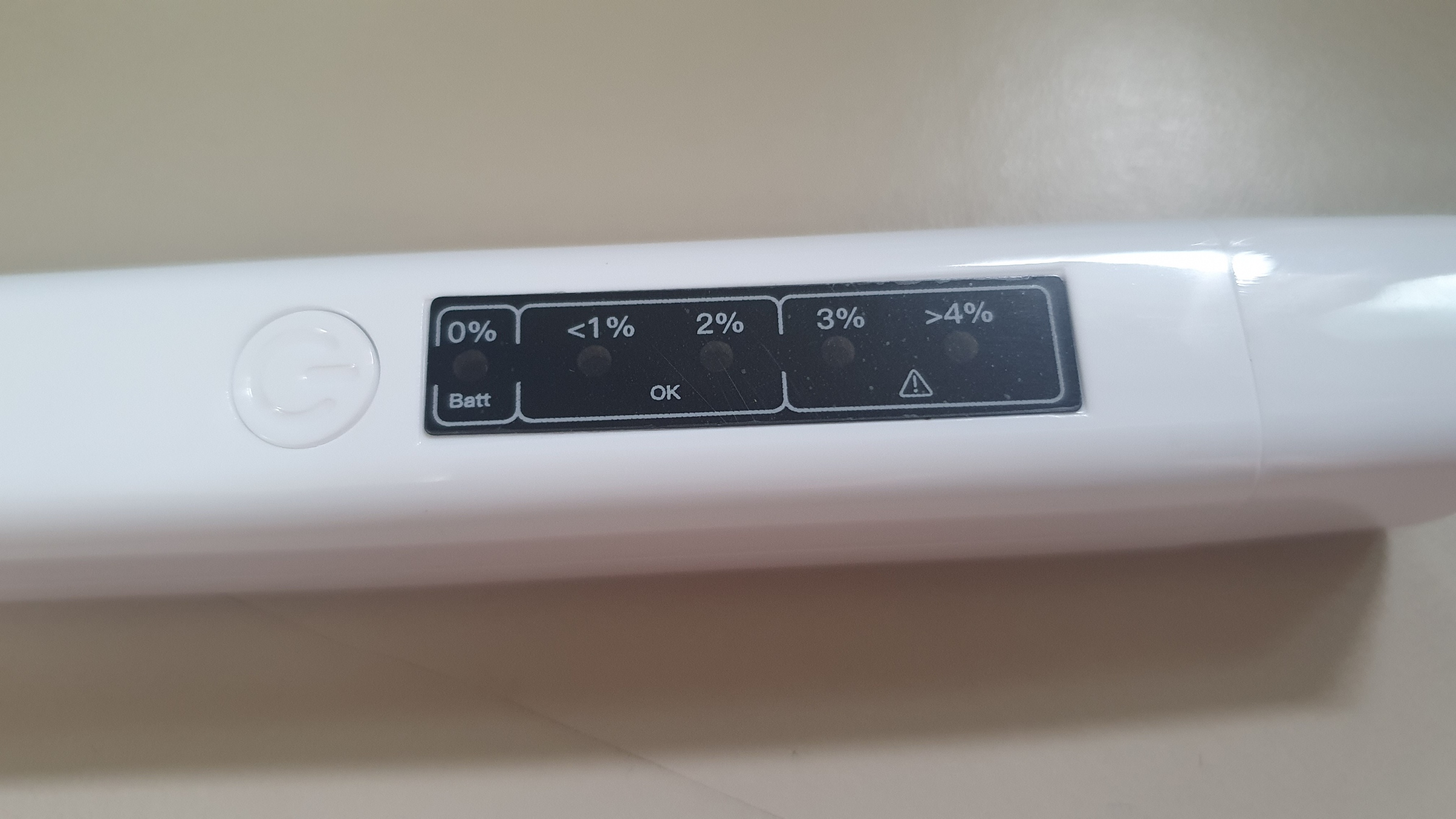 전원 버튼과 0% ~ 4% 까지 LED 지시등이 달려 있다. 0%는 전원표시부이고, <1%는 말 그대로 브레이크액의 수분함량이 1% 이하라는 말로써 안전하다는 뜻이다. 수분함량이 2%까지는 허용치인데 3%가 넘어가면 브레이크액의 교체를 요한다.