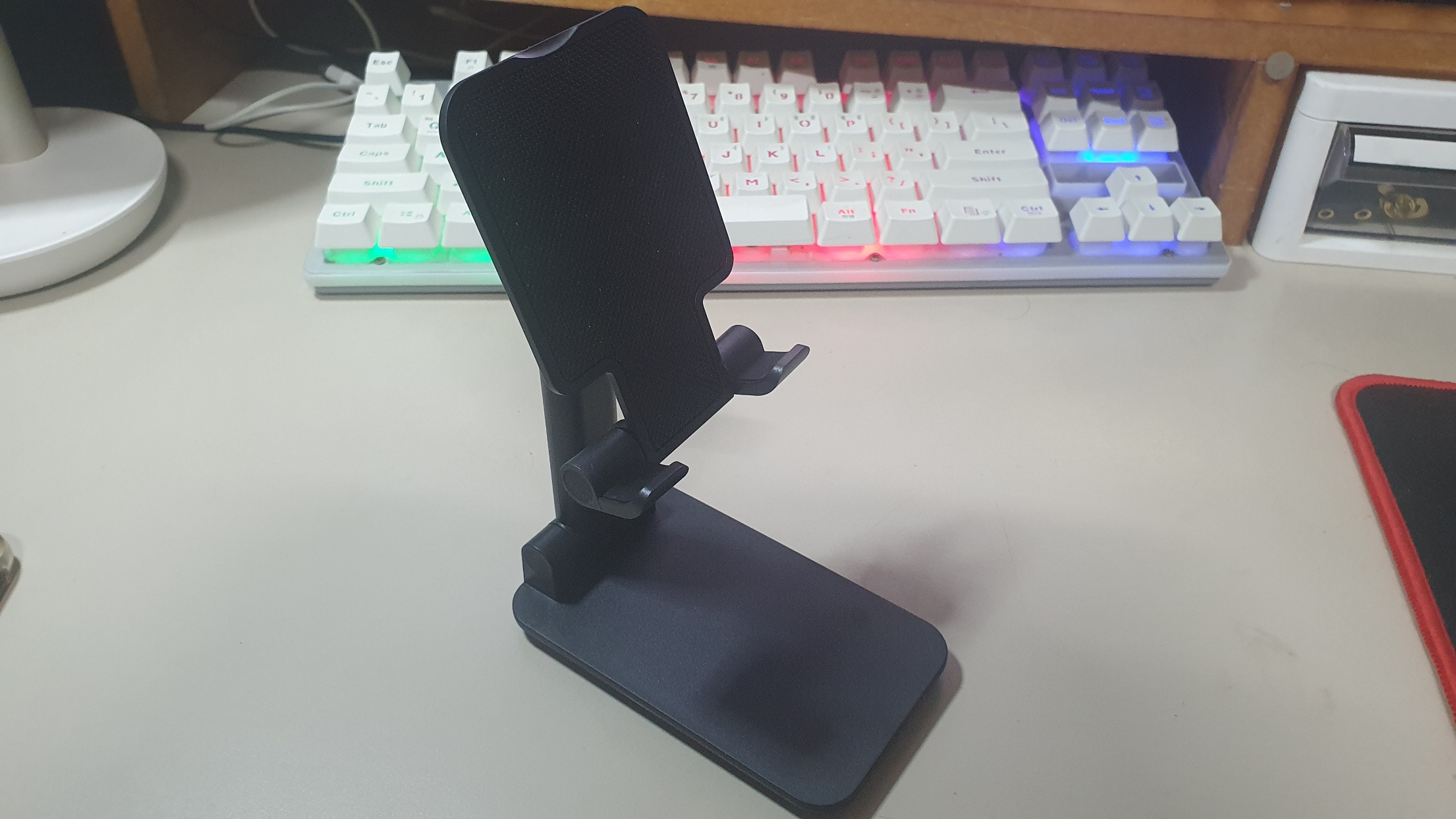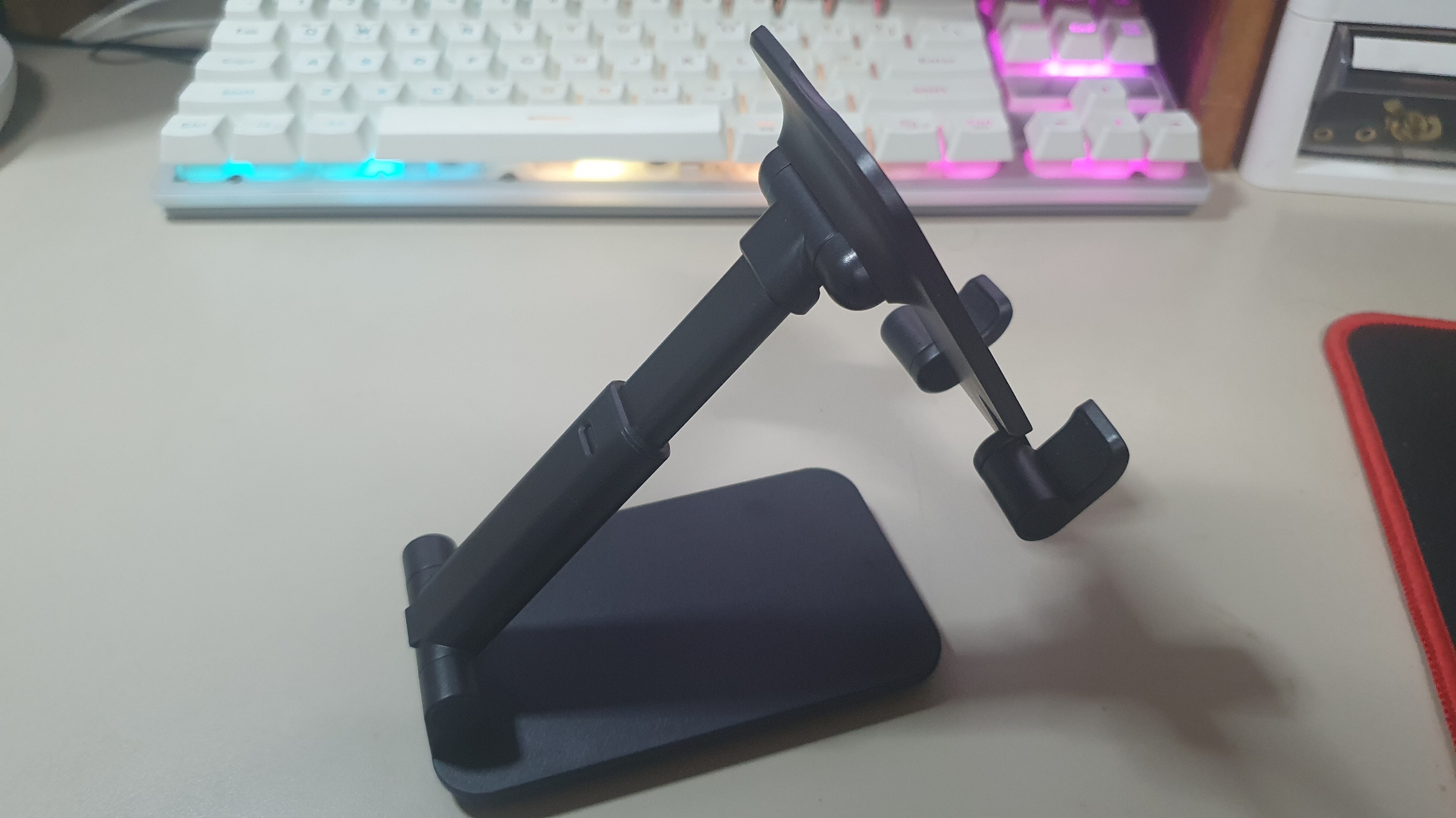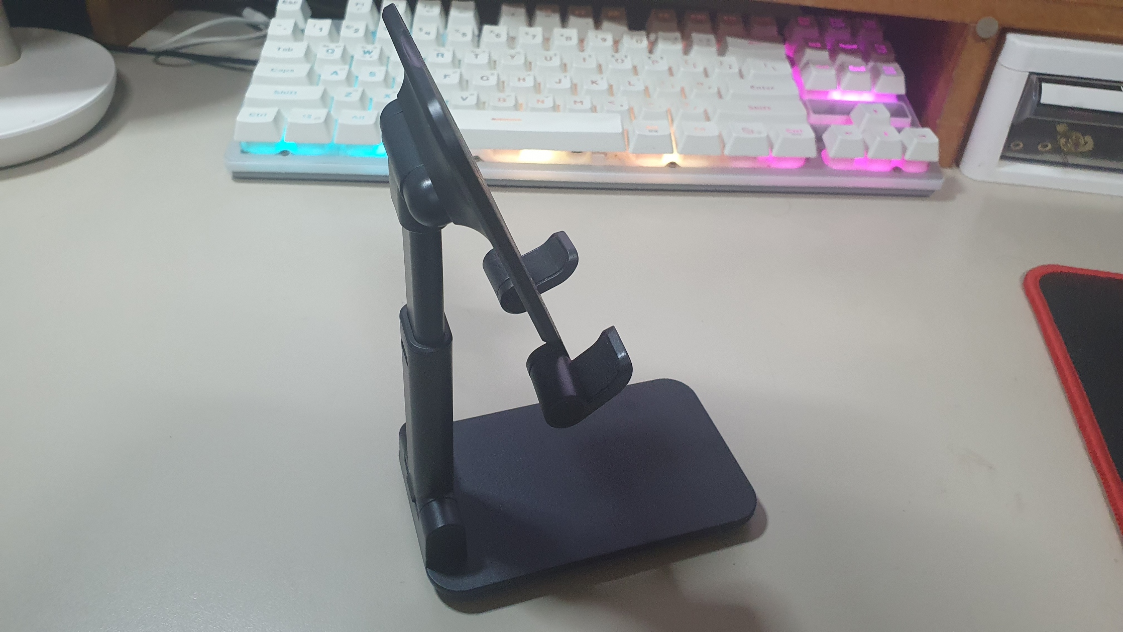 다양한 각도로 거치가 가능하다. 거치대 각도 조절 부분은 90도 이상으로 조절이 가능하다. 높이도 4CM 정도 늘렸다가 줄였다가 할 수 있다. 위 사진은 최대로 높이를 늘린 모습이다.