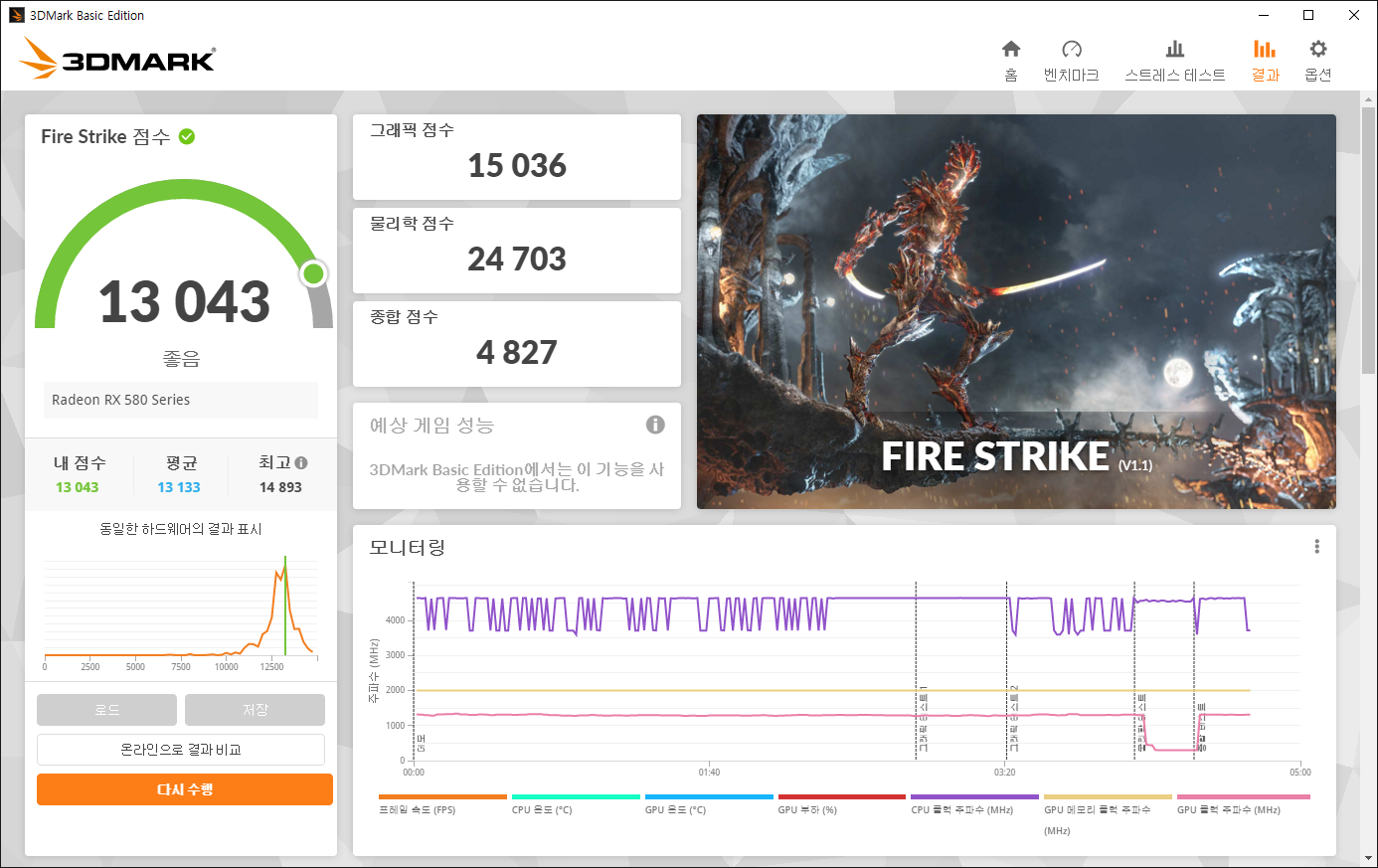 쿨러 교체 후의 FireStrike 점수이다. 개조 전보다 1000점이 올라서 13000점을 기록했고 GPU 온도는 최고온도 70도를 기록해서 개조 전과 비교해 20도나 떨어진 온도를 보여주었다.