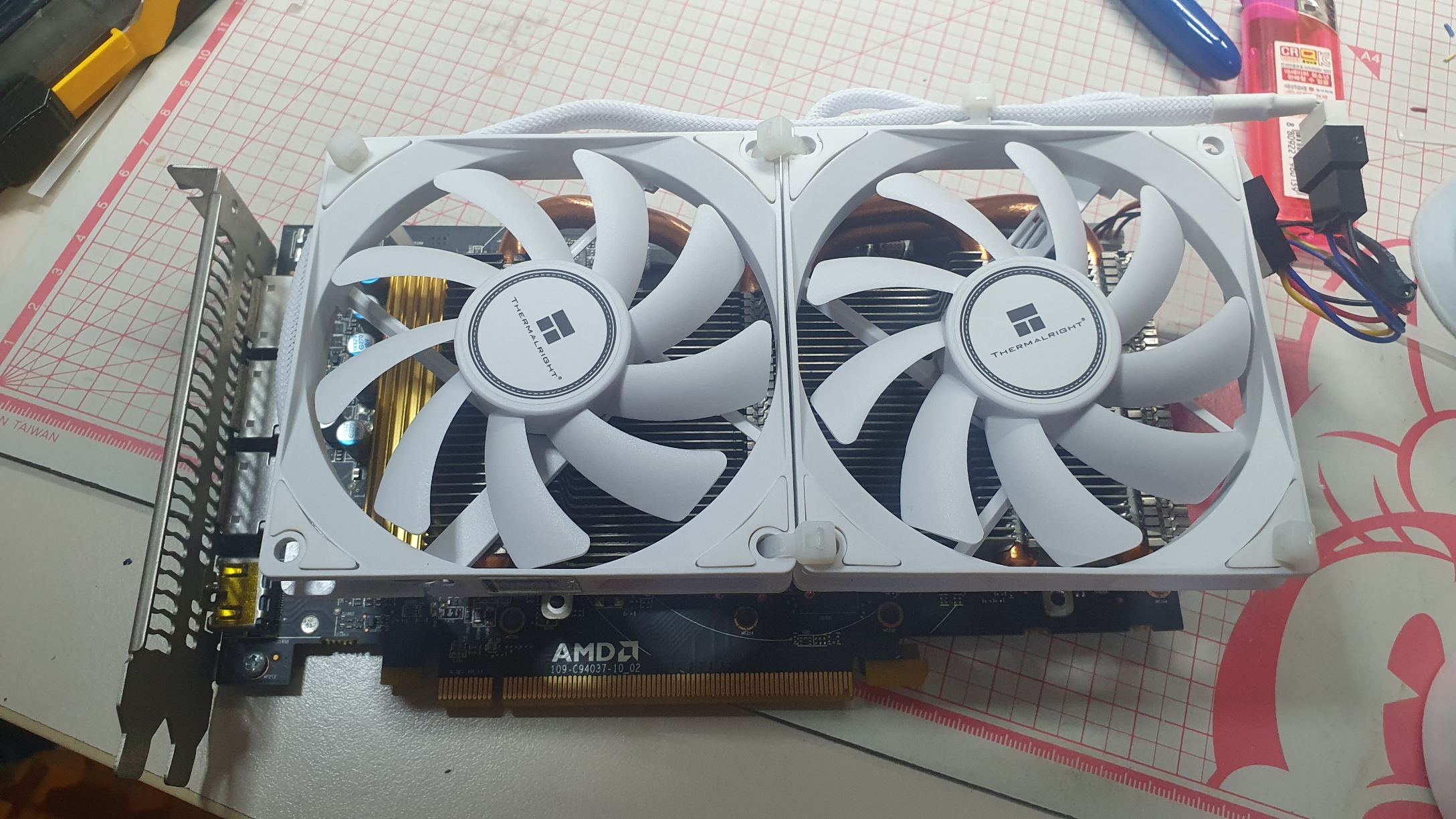 벌써 2년여 전에 7만 원에 구입했던 조텍 RX580 채굴용 그래픽카드를 펌웨어를 교체하고 시끄럽던 쿨링팬을 교체하여 지금까지 잘 쓰고 있다. 사실 그래픽카드 가격만 정상적이었으면 벌써 바꿨겠지만 일단은 이걸로 존버를 하고 있다. 아무튼 원래의 빨간색 쿨링팬을 흰색 저 RPM 팬으로 바꾸니 소음은 줄었으나 발열은 크게 줄지 않았었다. 그러던 중 이 그래픽카드에 2개의 팬을 달아 개조한 글들을 인터넷에서 보게 되었고 나도 도전해 보았다.