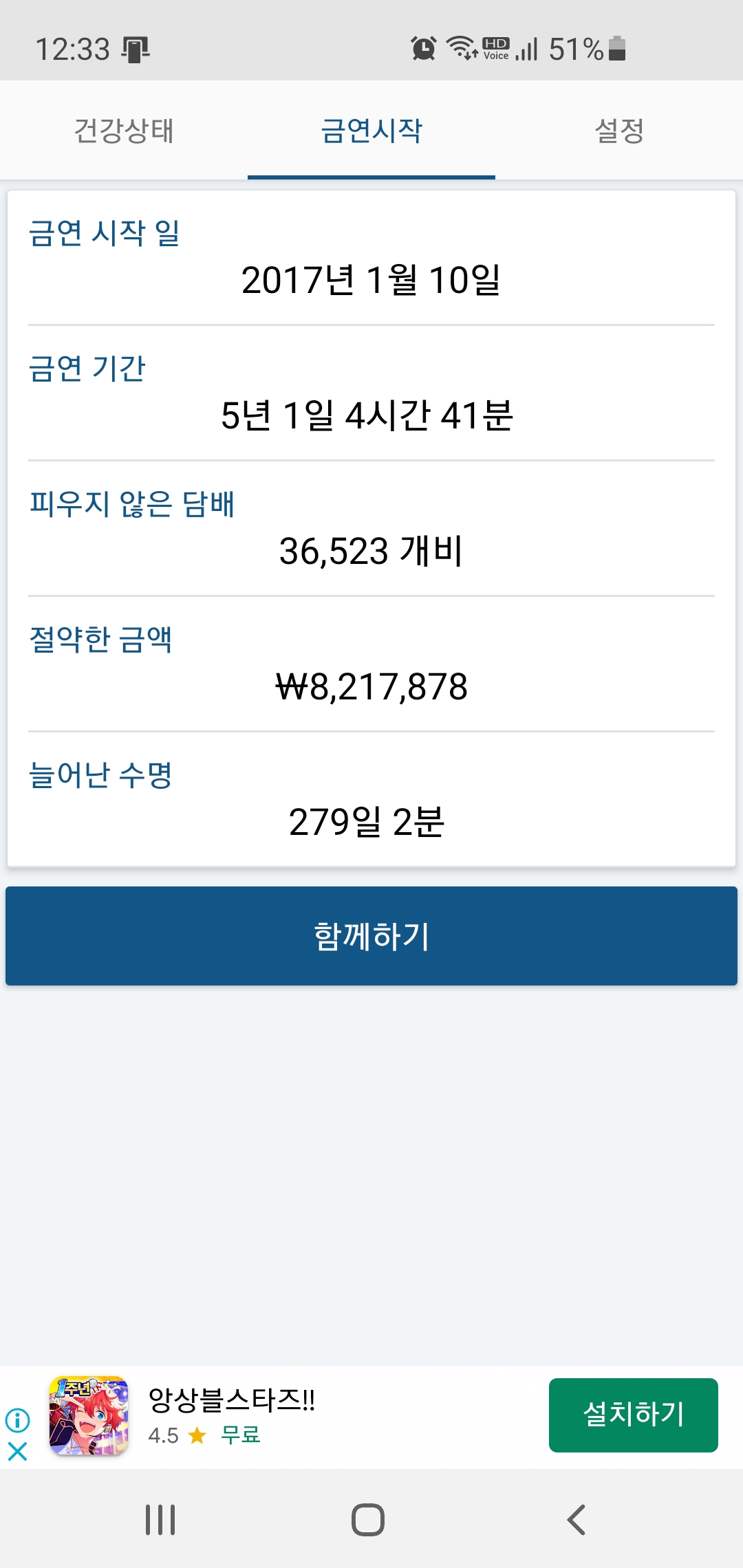 당시 핸드폰에 '금연시작' 이라는 앱을 설치하고 바탕화면에 위젯을 놓아두었었는데, 그 후 핸드폰이 몇 번이나 바뀌었지만 지금도 바탕화면에는 그 앱이 깔려 있다. 이게 그래도 가끔 담배 생각이 날 때 보면 그래도 나름 보람과 위안이 되는 것 같아 아직도 유지 중이다 (앱 광고 아님)