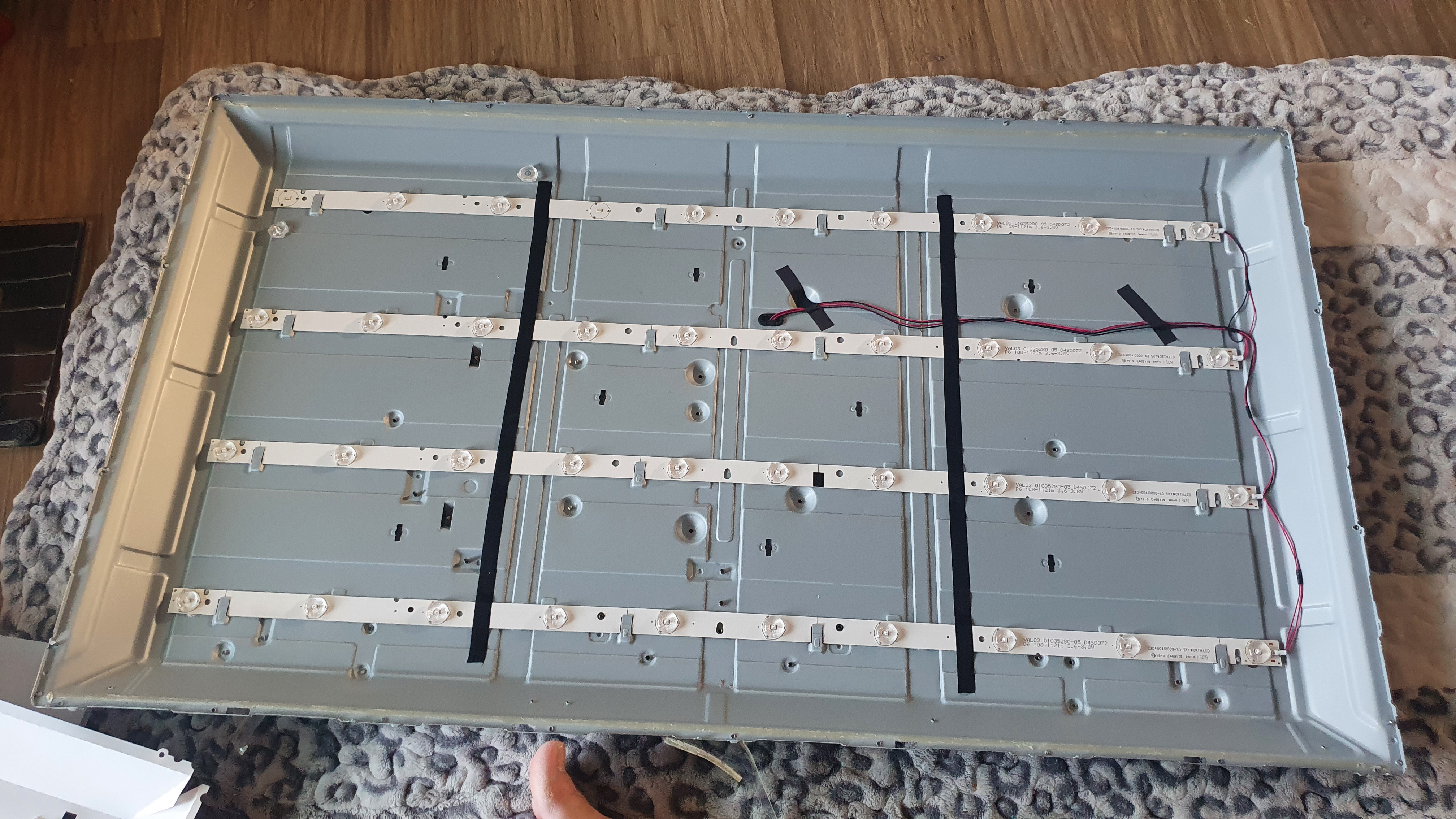 다만 앞에서 말했다시피 일치하는 백라이트가 아니기 때문에 약간의 추가작업이 필요하다. 다행히 12구나 10구나 LED의 전압은 3V 짜리로 같고 길이도 12구짜리가 약간 길지만 무리 없이 장착이 가능하다. 다만 2가지의 문제가 있는데 첫 째가 원래 장착되어 있는 LED 바와 새로 구입한 LED 바의 커넥터가 다르다는 것이고, 둘 째는 아래 사진과 같이 LED 바가 모습을 드러내기 전 나오는 하얀 비닐 재질의 반사판의 구멍이 LED가 10 구라서 10개 뚫려 있는데 신형은 구멍이 12개여야 한다는 것이다.