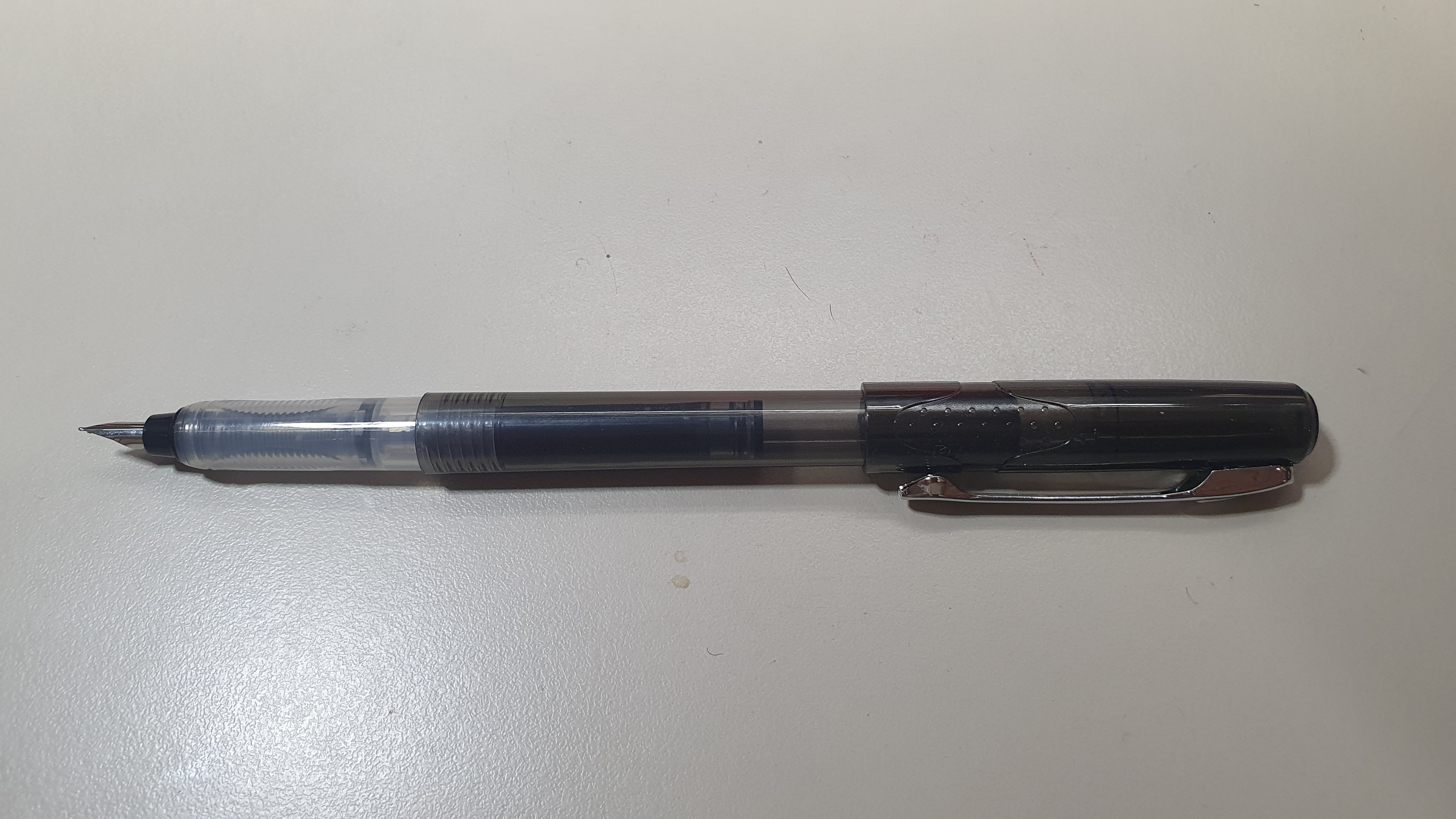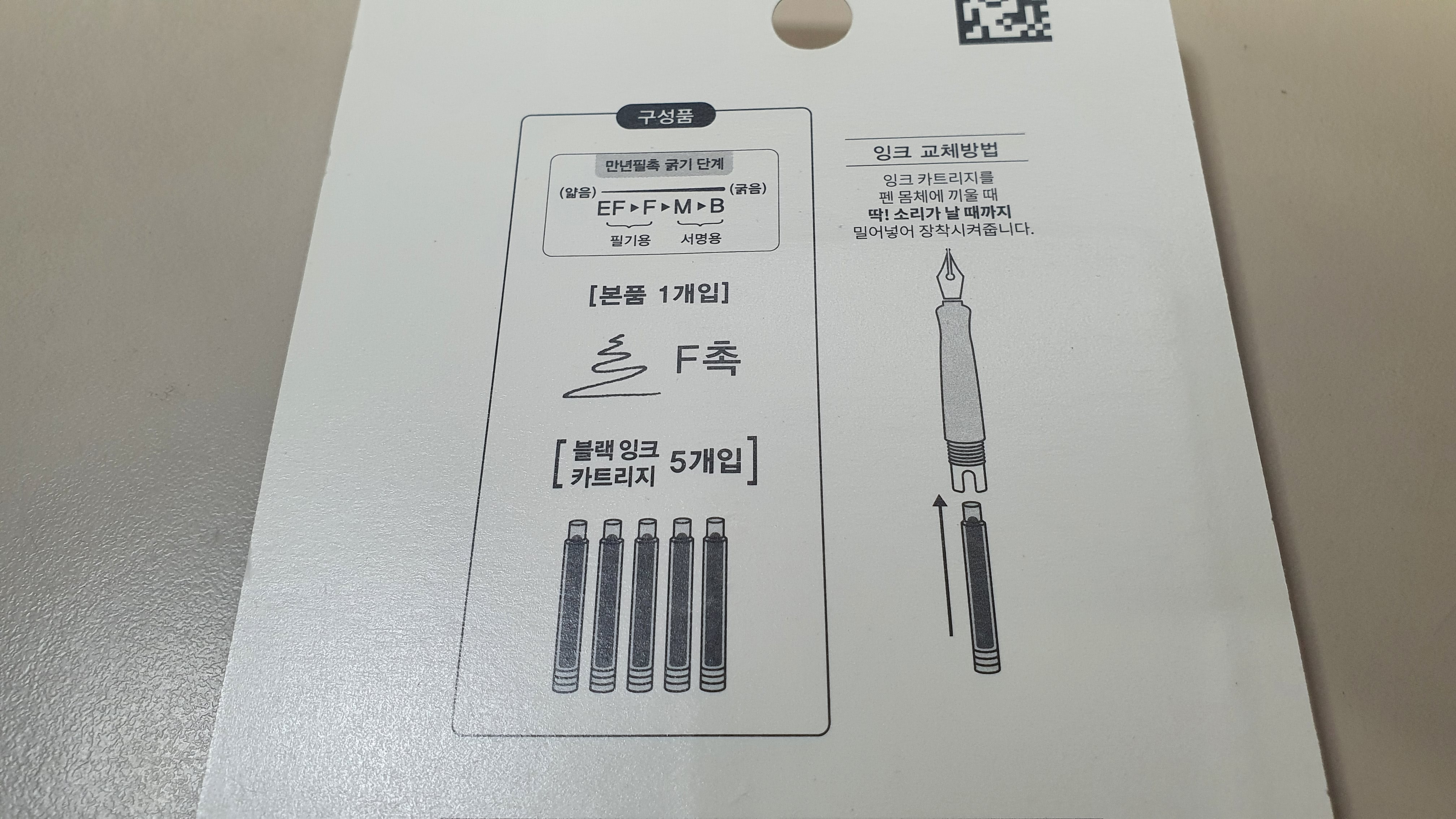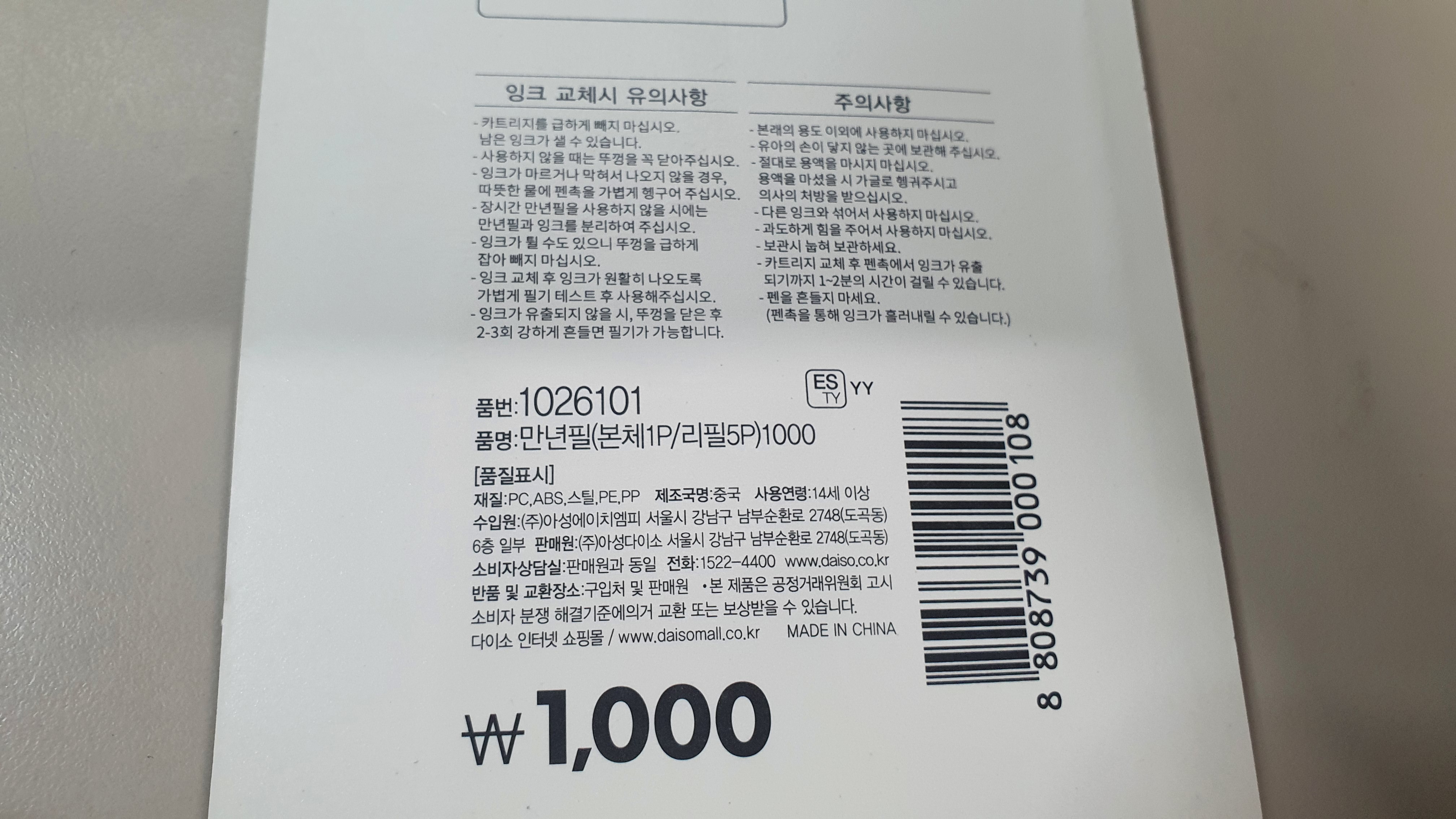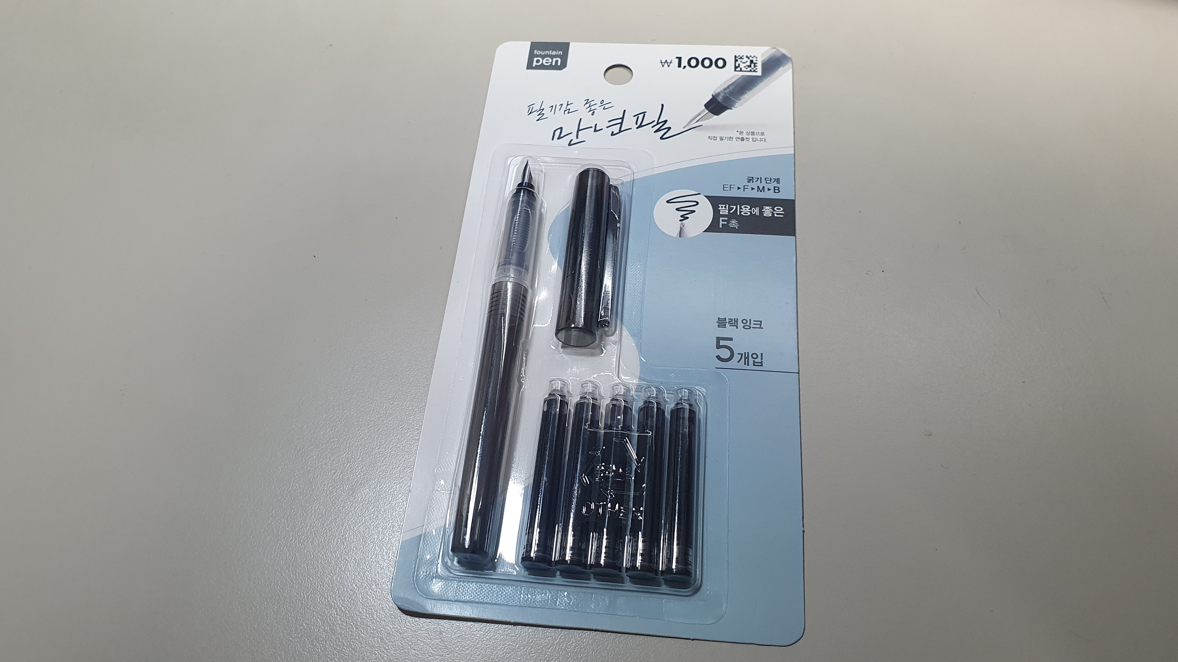 다이소 천 원짜리 답게 굉장히 실용적인 포장에 펜촉과 뚜껑쪽 걸이 부분만 빼고 ALL 플라스틱으로 만들어졌다. 잉크도 다섯 개나 준다. 필기량이 많지 않다면 몇 년은 쓸 듯하다.