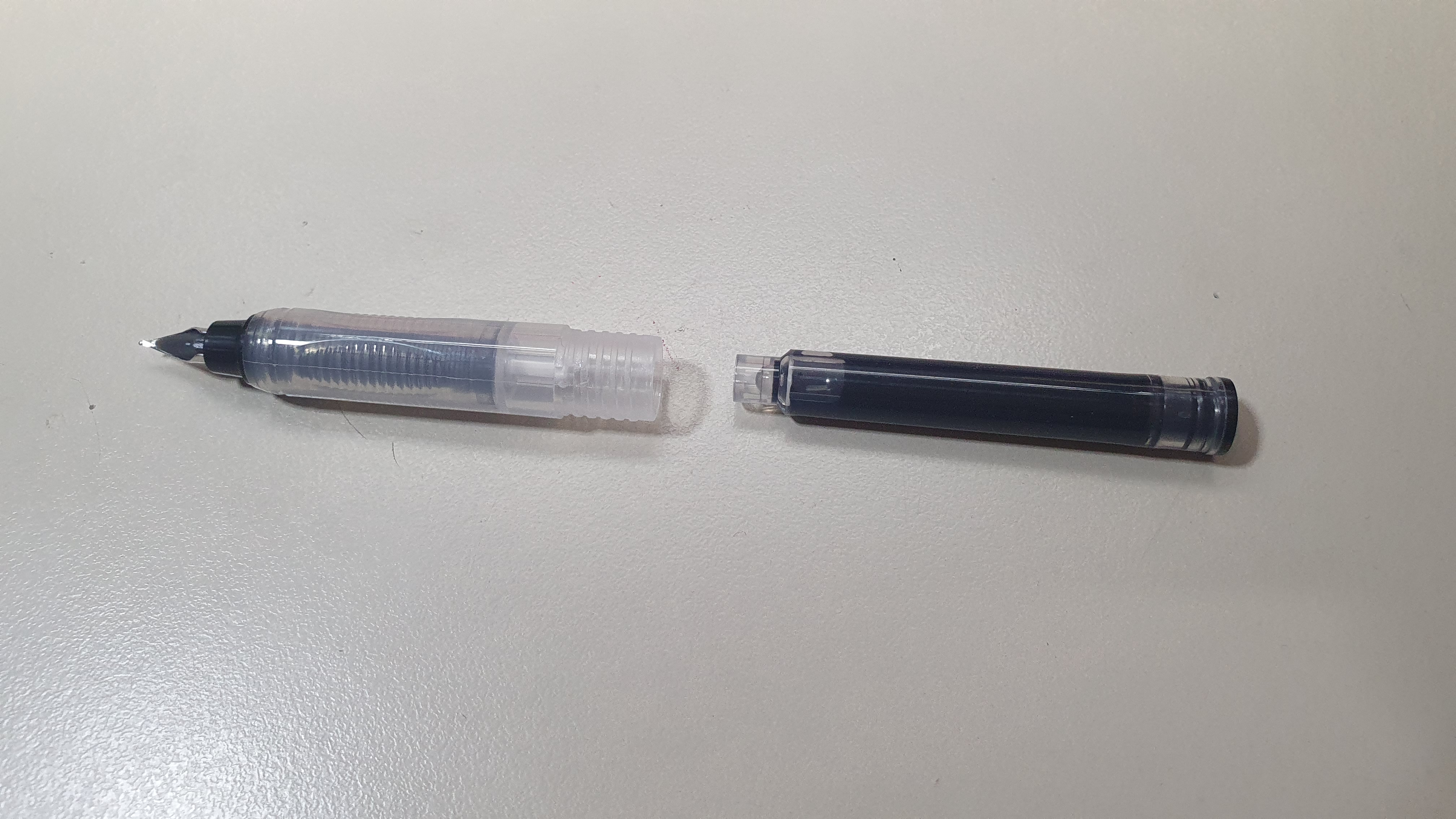 본체의 뒷부분을 빼고 위와 같이 잉크를 힘을 줘서 밀어 넣으면 딱 하고 소리가 나면서 잉크 결합이 된다. 그리고 그냥 쓰면 된다. 매우 간편하다.