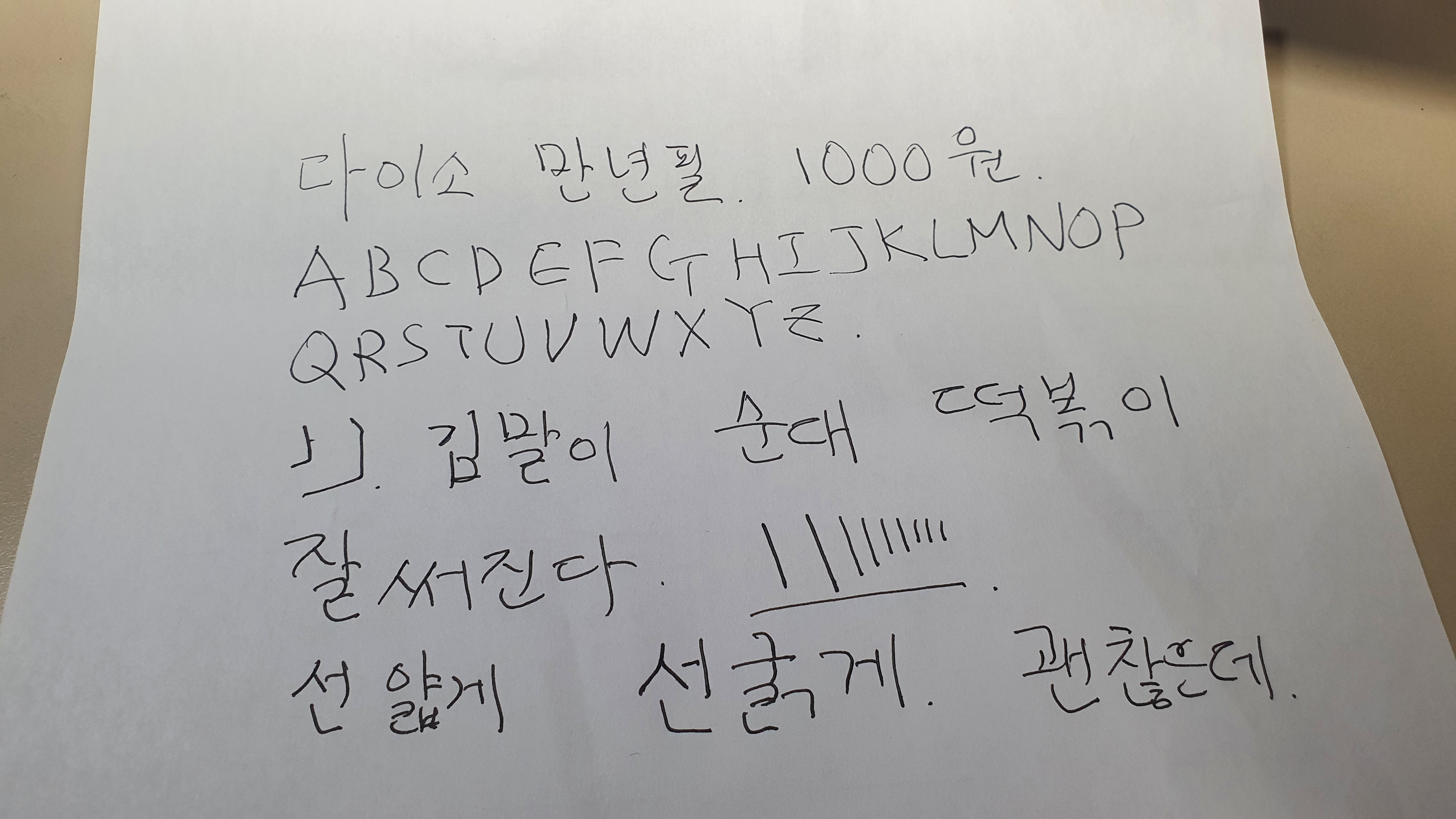 천 원짜리지만 만년필의 서걱거리는 그 느낌 그대로 느껴보고 싶은 분들이나 볼펜은 너무 질려! 하는 분들은 사서 한 번 써봐도 좋을 것 같다. 한 동안 볼펜 쓸 일은 없을 것 같다. 싸지만 좋은 펜 같다.