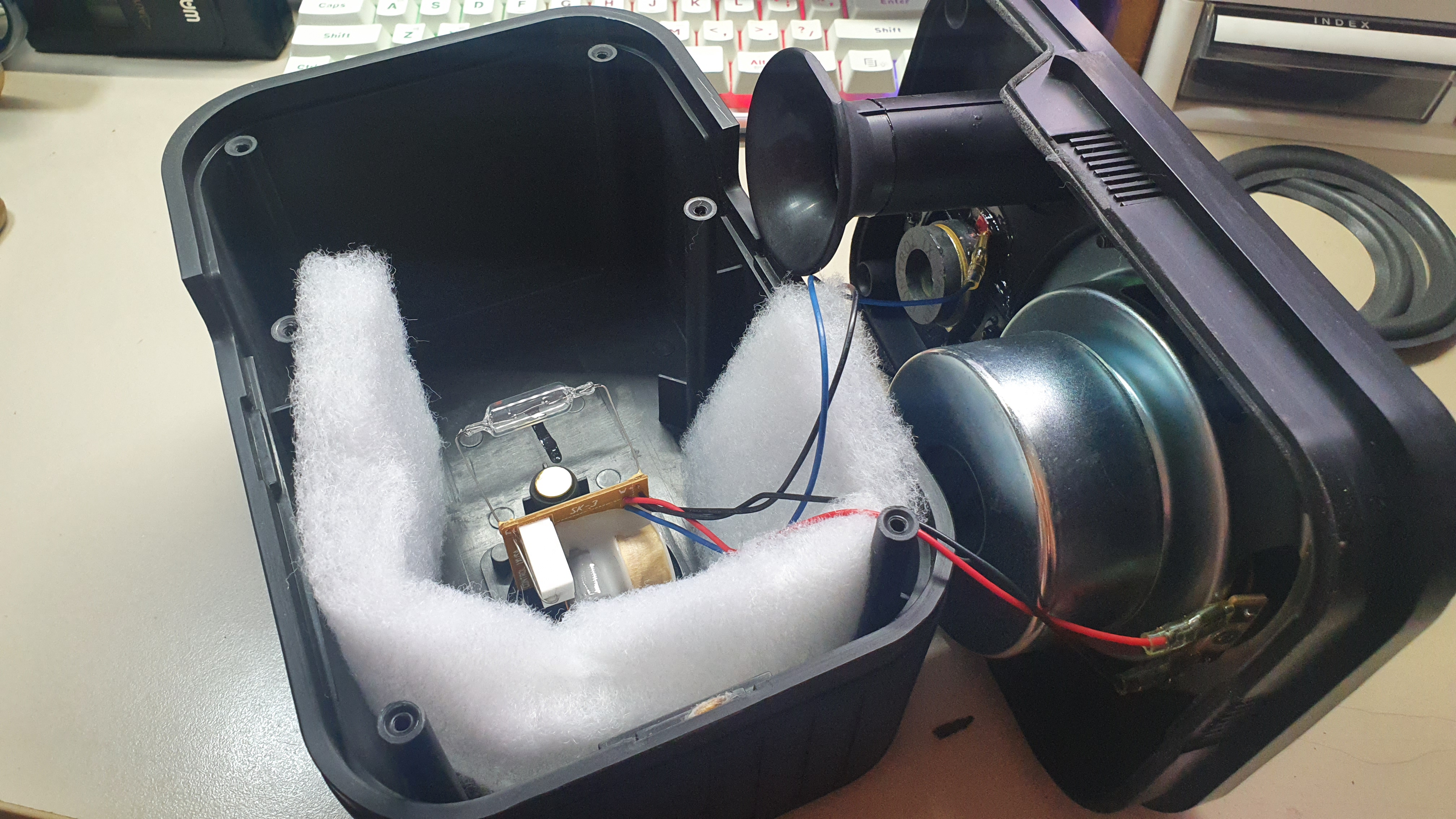 육각 나사를 풀어 전면판을 분리하니 네트워크 회로와 트위터, 스피커가 보인다. 네트워크 회로와 연결된 전선은 납땜이 아닌 커넥터로 연결되어 있으므로 롱노우즈로 집어서 당기면 빠진다.