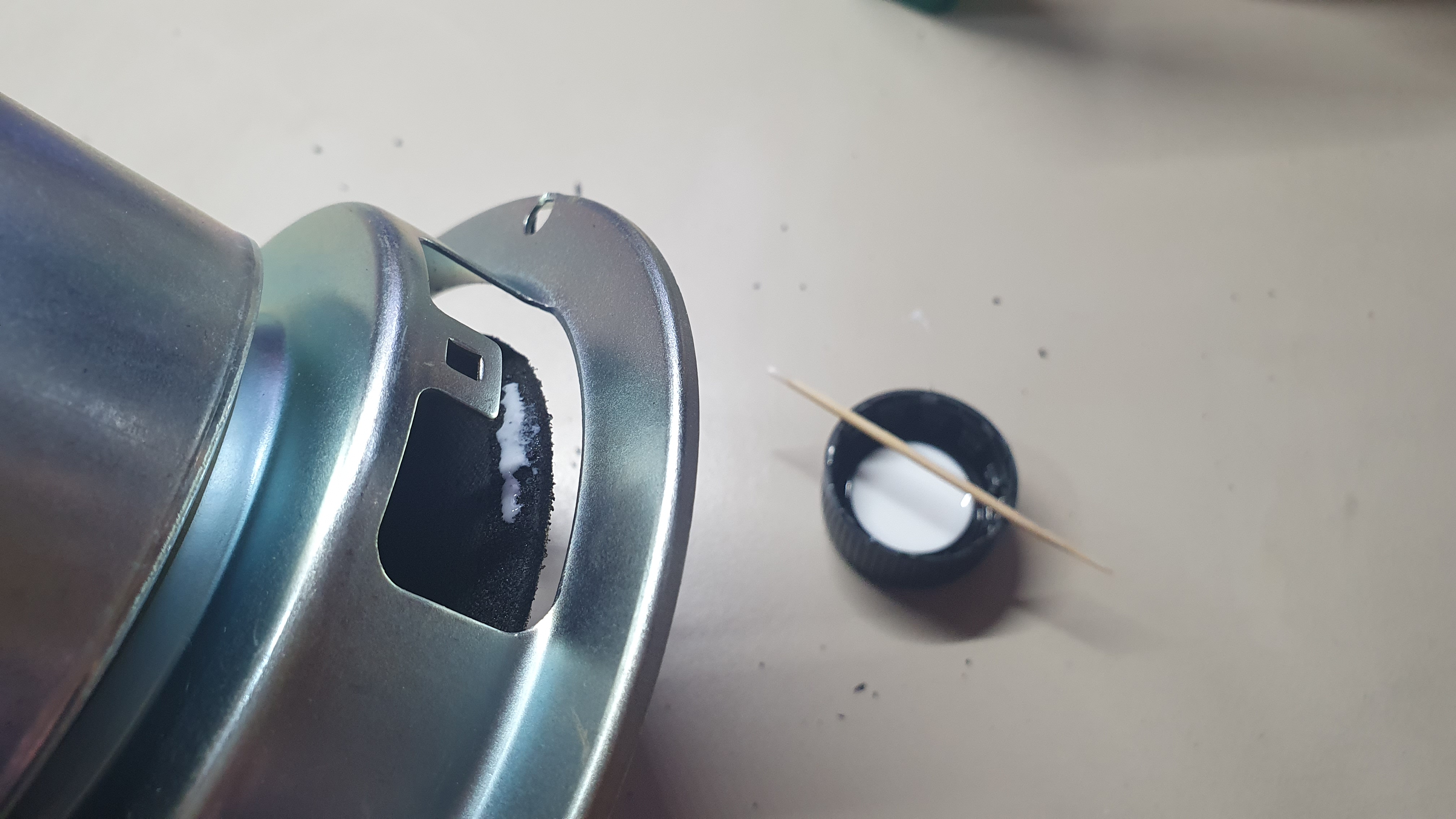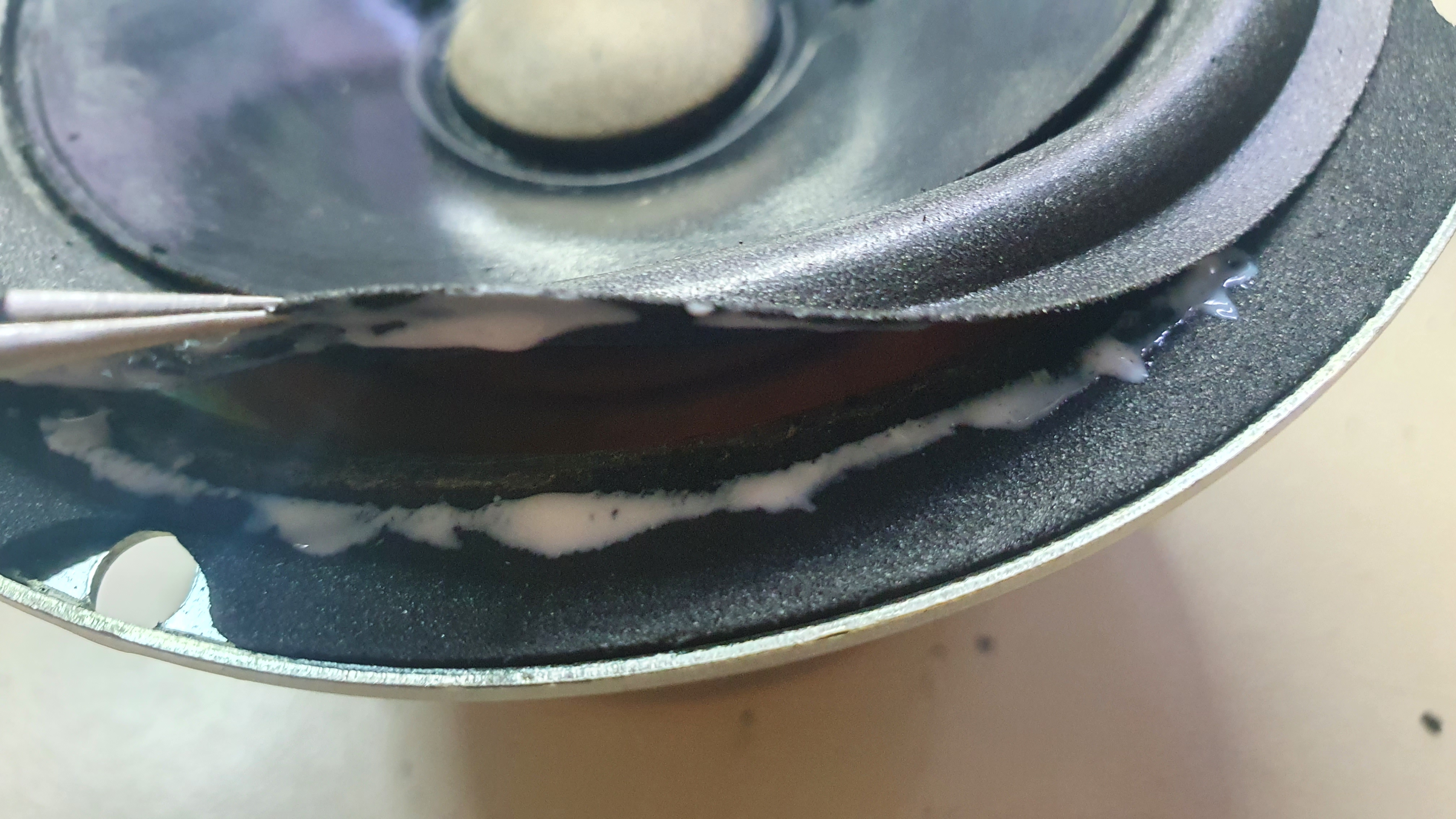 새 엣지를 붙이기 위해 목공 본드를 이쑤시개에 묻혀서 스피커 콘(Cone) 뒷부분 둘레에 발라준다. 깔끔하게 접착하려면 적당량을 발라주는 게 제일 중요한 것 같다. 목공 본드는 다이소에서 쉽게 구할 수 있다.