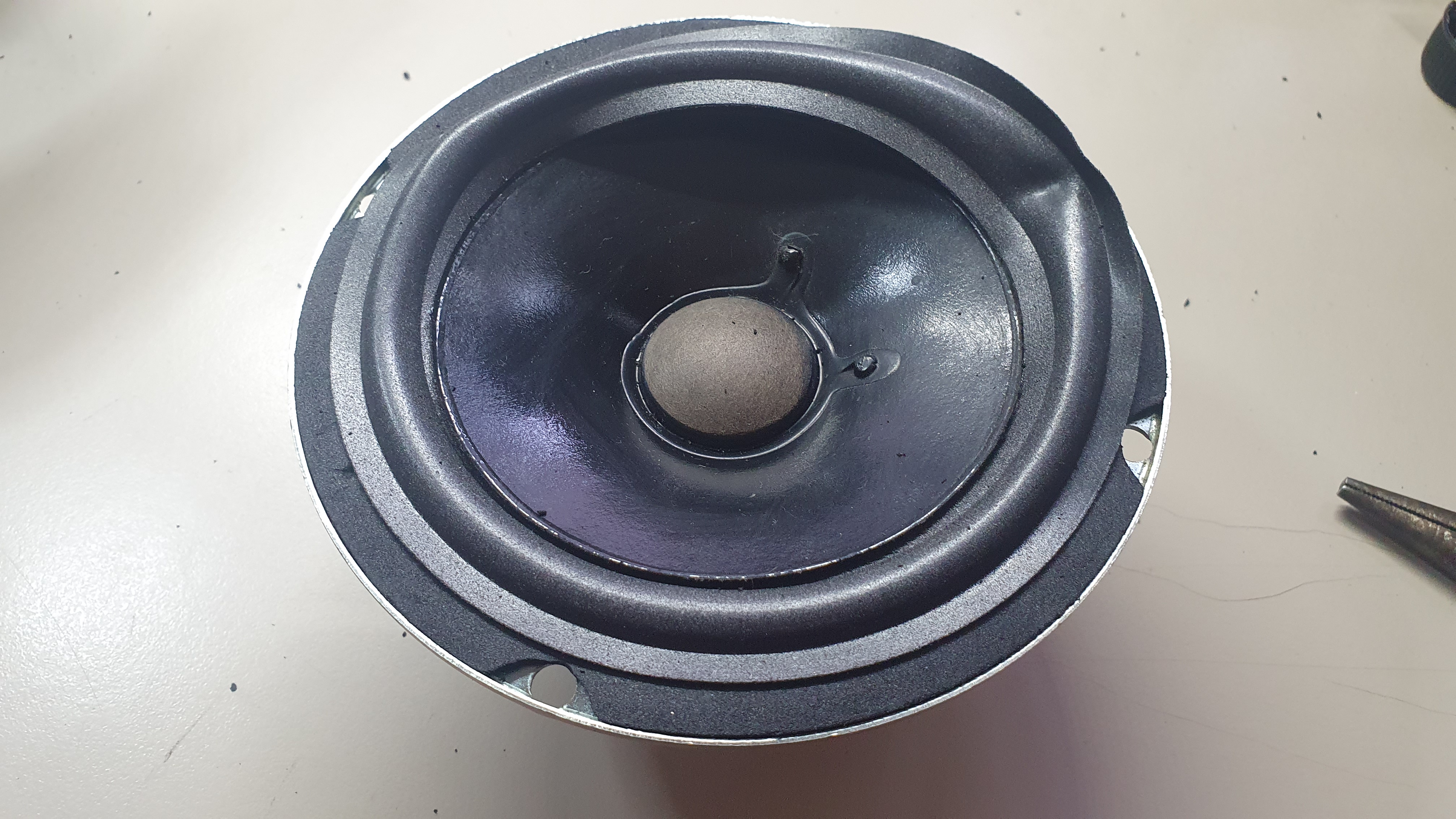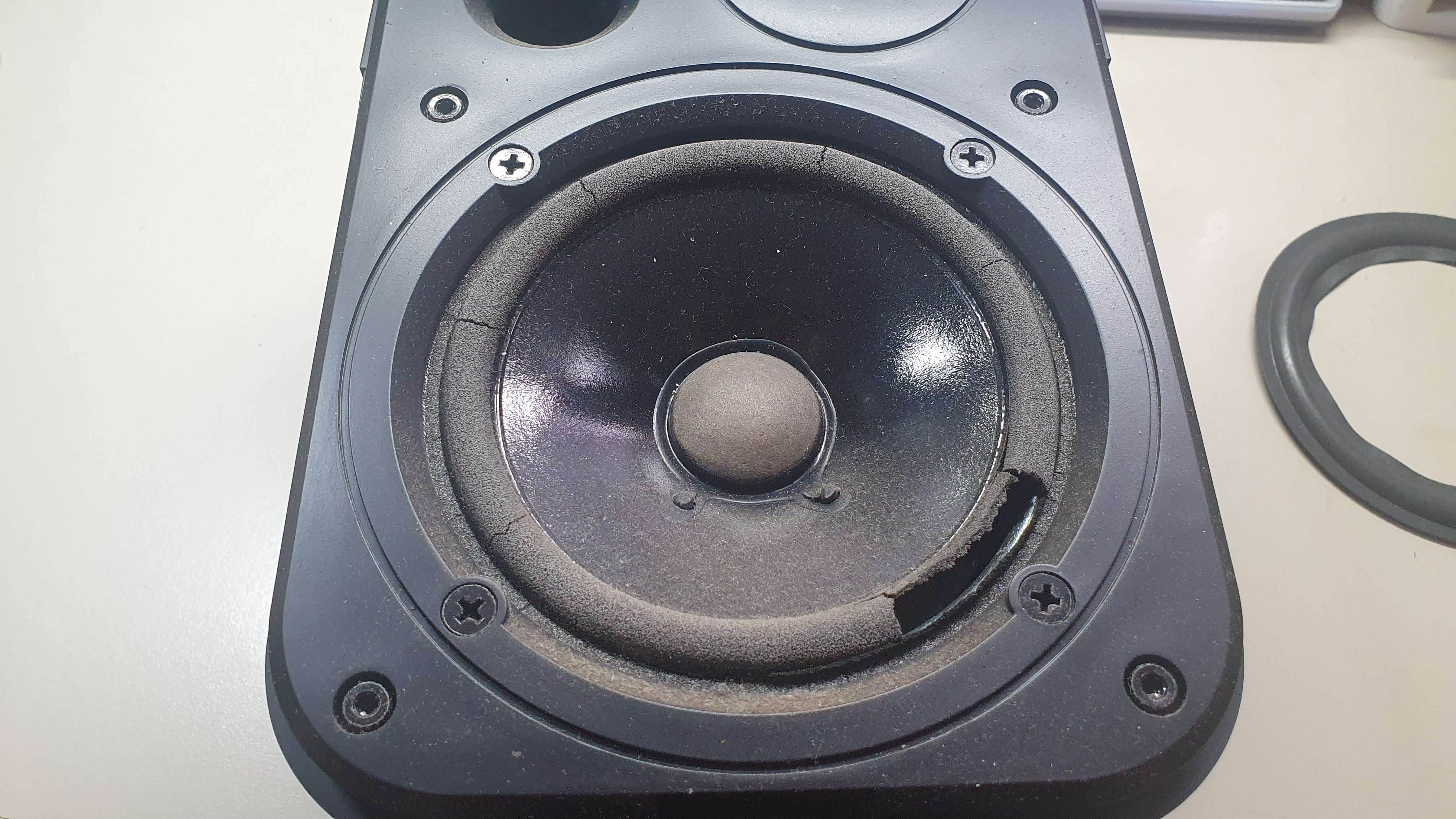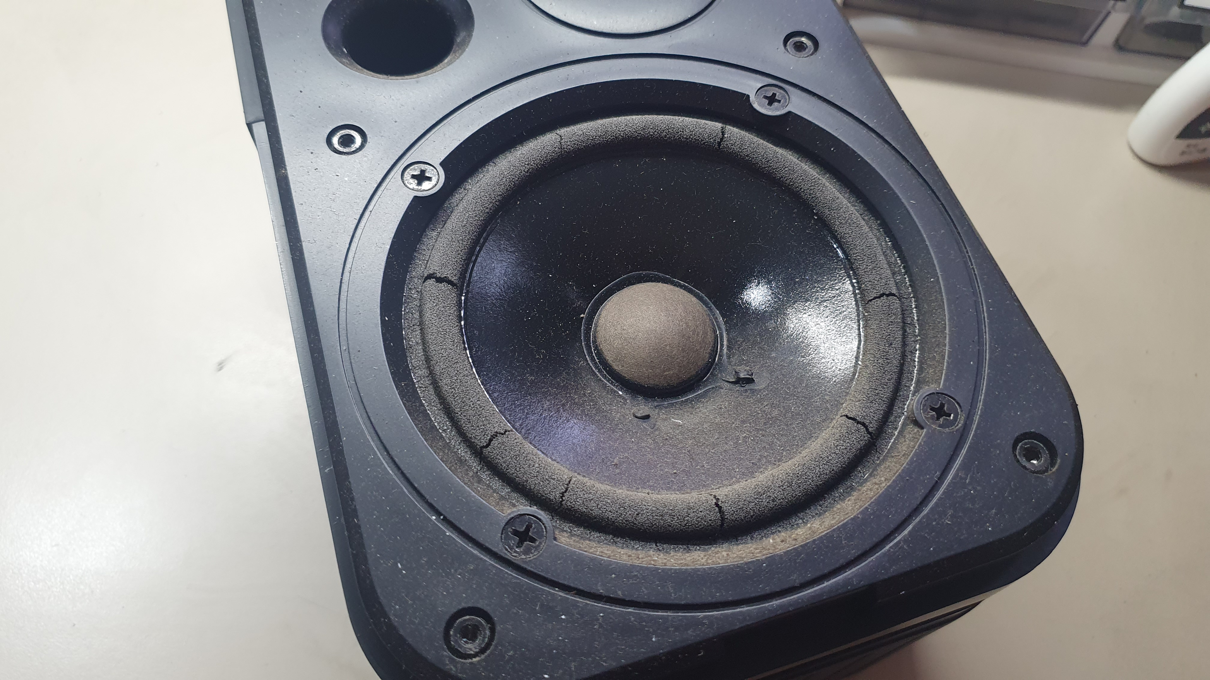 앞의 그릴을 떼어보니 스피커 엣지가 많이 삭아서 떨어지고 있다. 검색해보면 이런 문제가 많이 나온다. 아마도 이 스피커의 고질병인 듯싶다.
