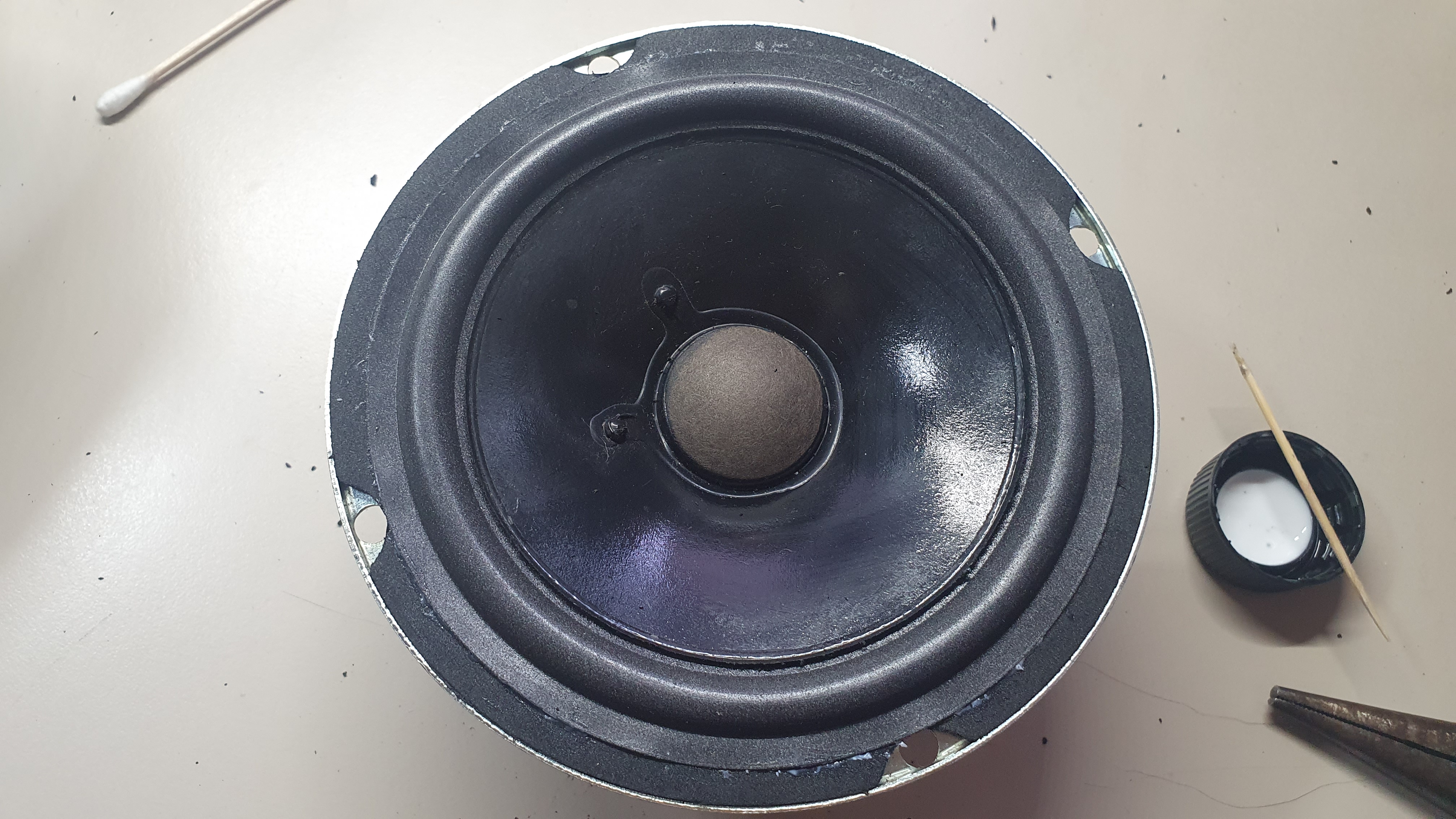 엣지교체가 마무리된 스피커 유닛. 처음이지만 그럭저럭 깔끔하게 잘 된 것 같다 ^^ 이대로 장착해도 되지만 반나절 정도 잘 접착되도록 말려주고 잘 붙었는지 확인 후 조립하였다.