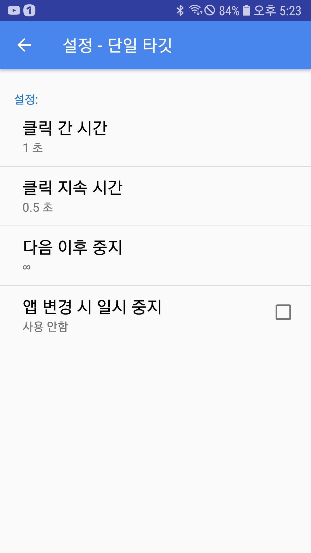 처음 설정에 들어가면 단위가 밀리초로 되어 있는데 초로 바꾸어준다. '클릭 간 시간'은 클릭 간격이며 '클릭 지속시간'은 클릭하고 있는 시간을 말한다. '다음 이후 중지' 설정으로 끝나는 시간도 설정할 수 있다.