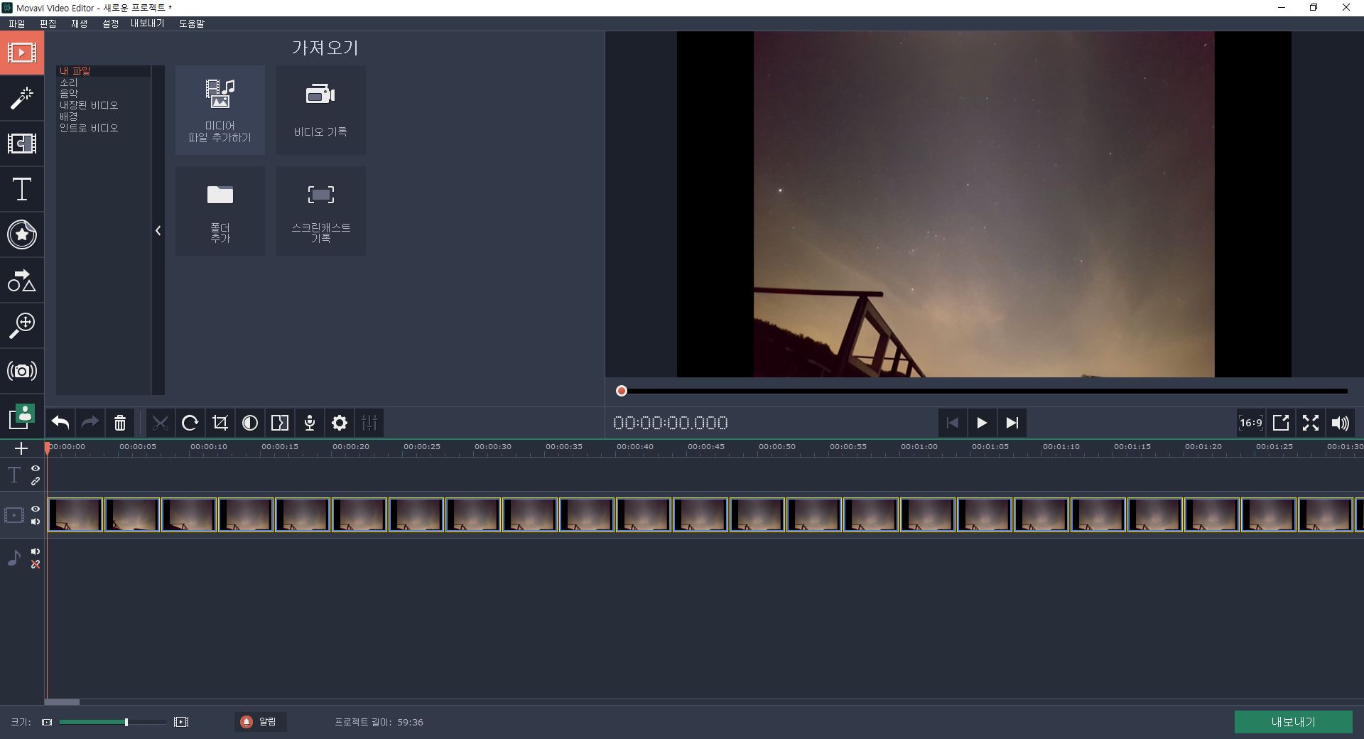 Movavi Video Editor를 사용하였다. 실행하고 미디어 파일 추가하기 버튼을 클릭해서 찍은 사진들을 모두 불러온다. 이 에디터가 아니더라도 어떤 동영상 에디터도 사용이 가능하다.