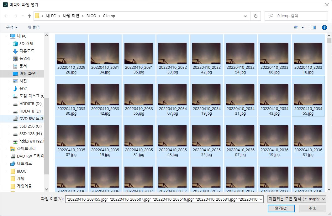 파일명 순으로 자동정렬이 되어 위와 같이 나온다. 그냥 이렇게 놓고 플레이를 해보면 사진 하나 당 4초의 시간이 주어지므로 이를 타입랩스 영상으로 만들기 위해 압축해야 한다.