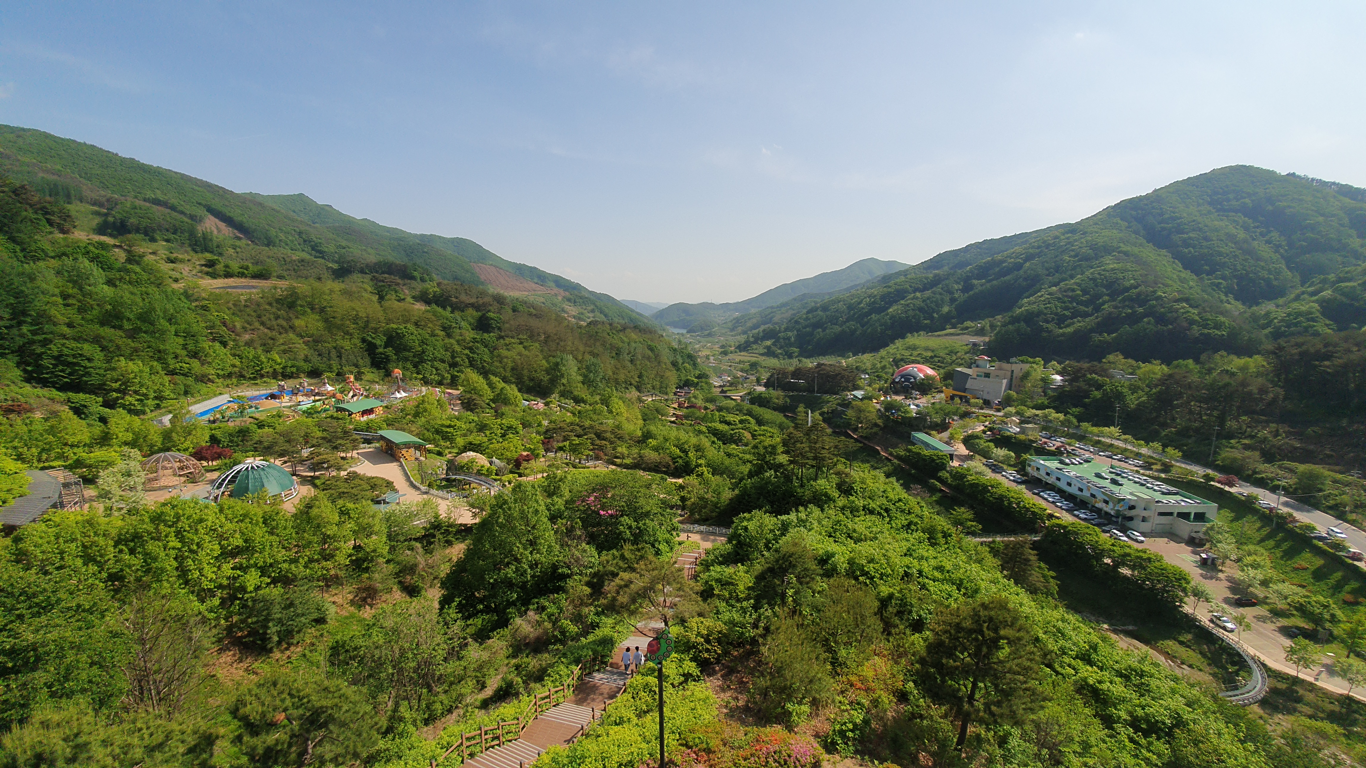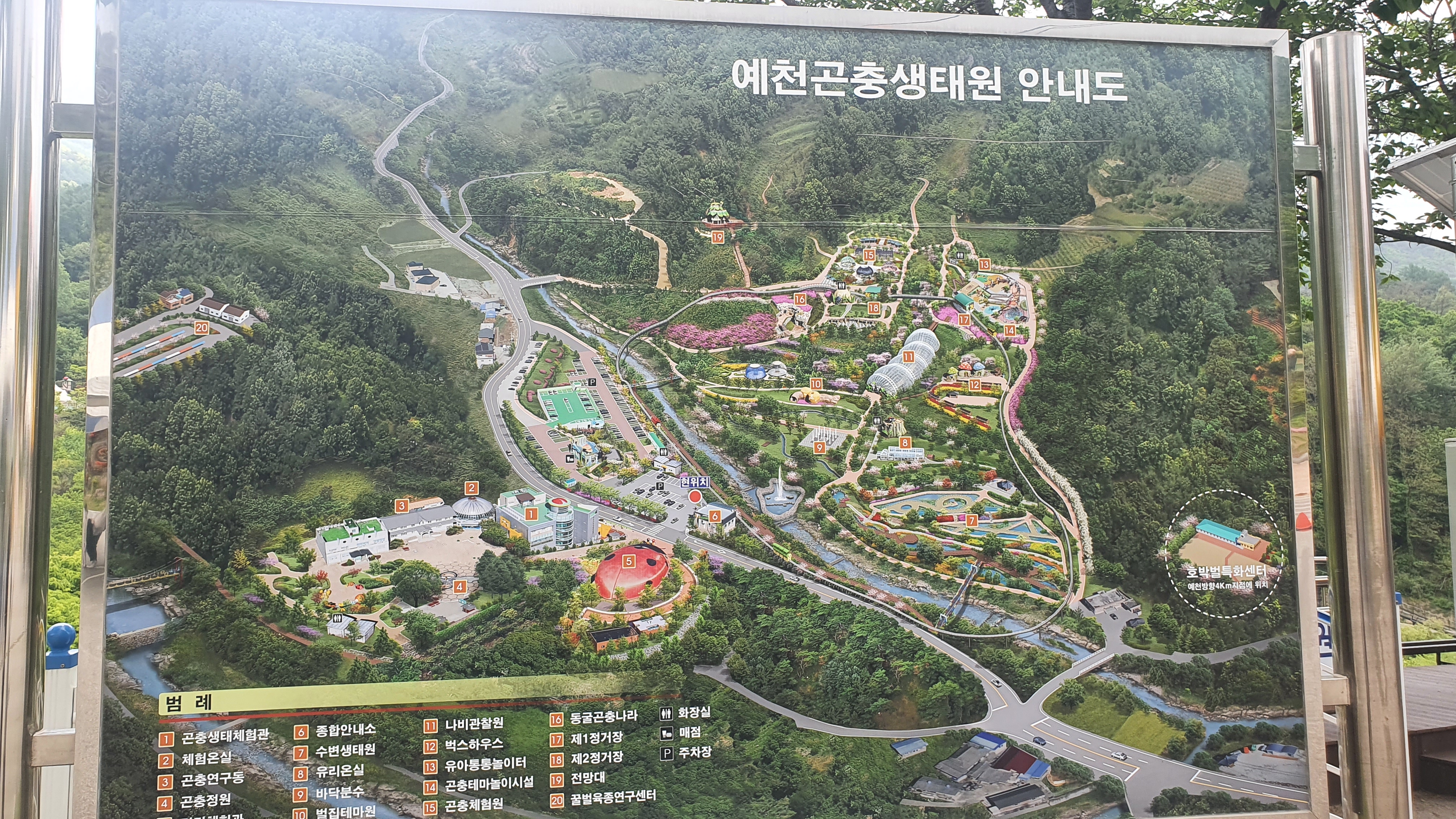 곤충 생태원 전망대에 올라서 한눈에 생태원을 담아 보았다. 가운데 하천을 기준으로 우측은 주차장, 메인 전시관 좌측은 숲 속 공원, 전시관, 산책로, 놀이터가 있다.