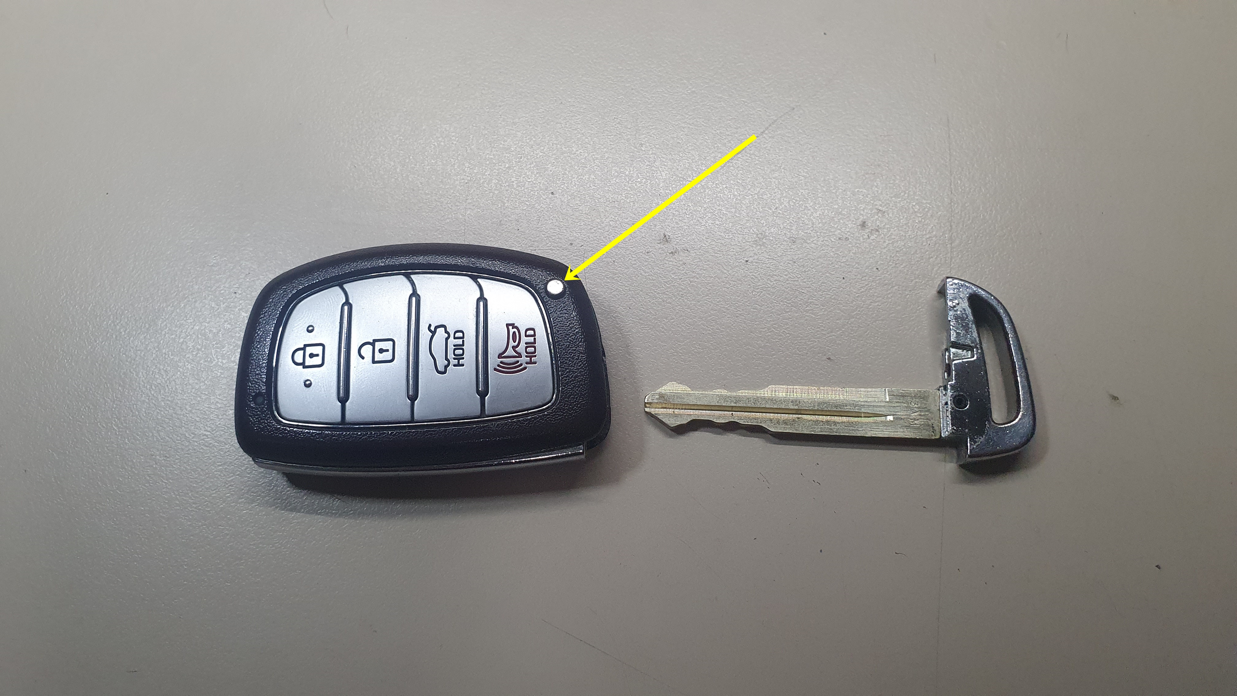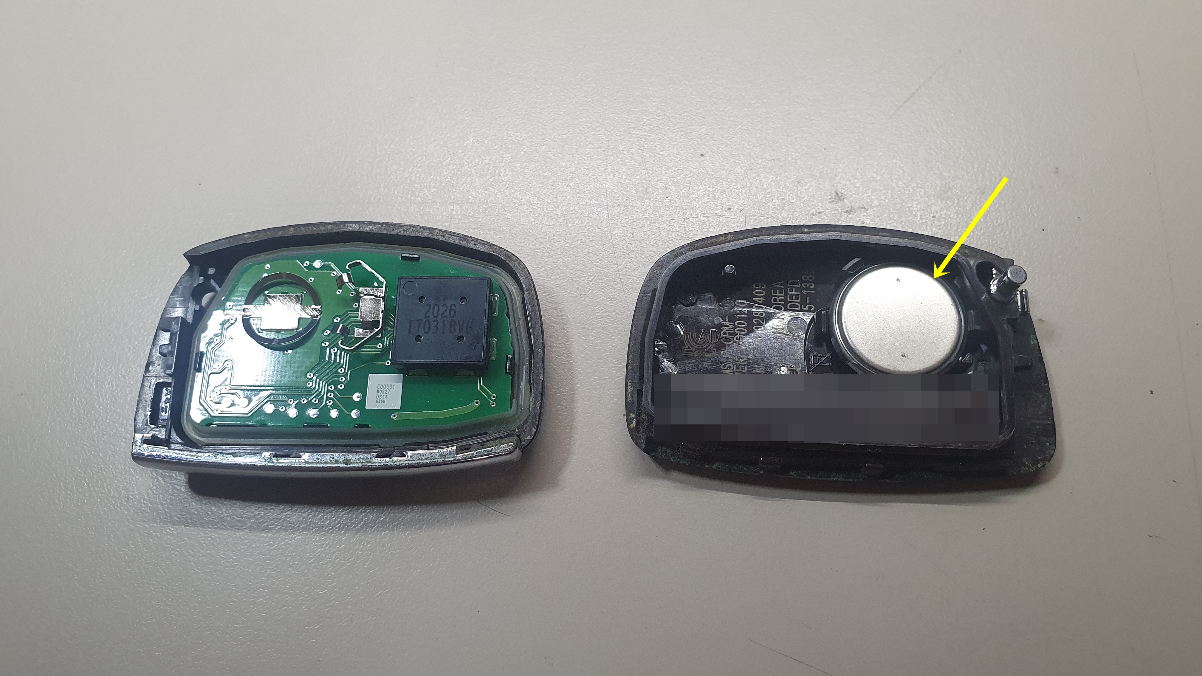 앞판과 뒤판으로 분해가 되는데 뒤판에 배터리가 있다. 작은 드라이버로 살살 움직이니 빠진다. 배터리 빼기 전에 배터리 극성을 잘 기억해둔다. 이 스마트키의 경우는 + 가 아래로 안 보이게 장착된다. 고로 보이는 쪽이 -이다.