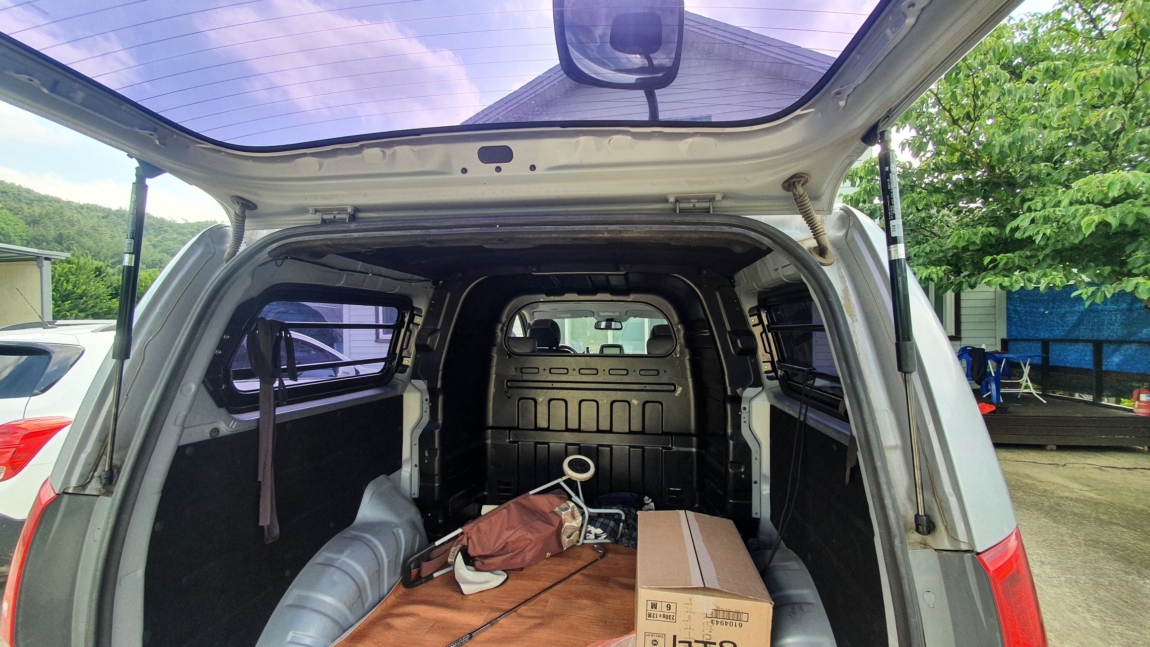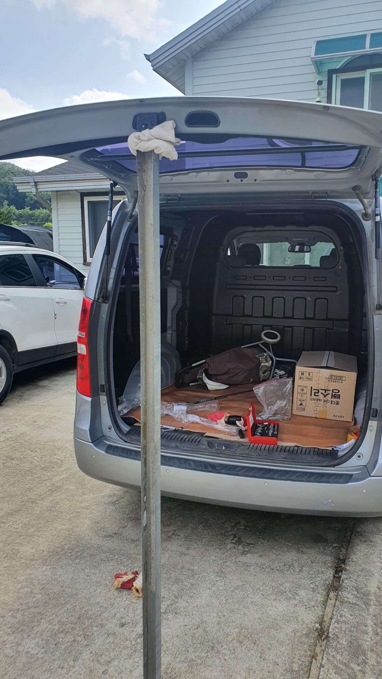 뒷문을 열고 작업해야 하는데 혼자 작업하려면 사진과 같이 문짝이 내려오지 않게 받쳐줄 파이프 같은 것이 필요하다. 둘이 있다면 한 명이 문짝을 들고 있으면 된다. 마침 적당한 길이의 쇠파이프가 있어서 받치고 작업했다.