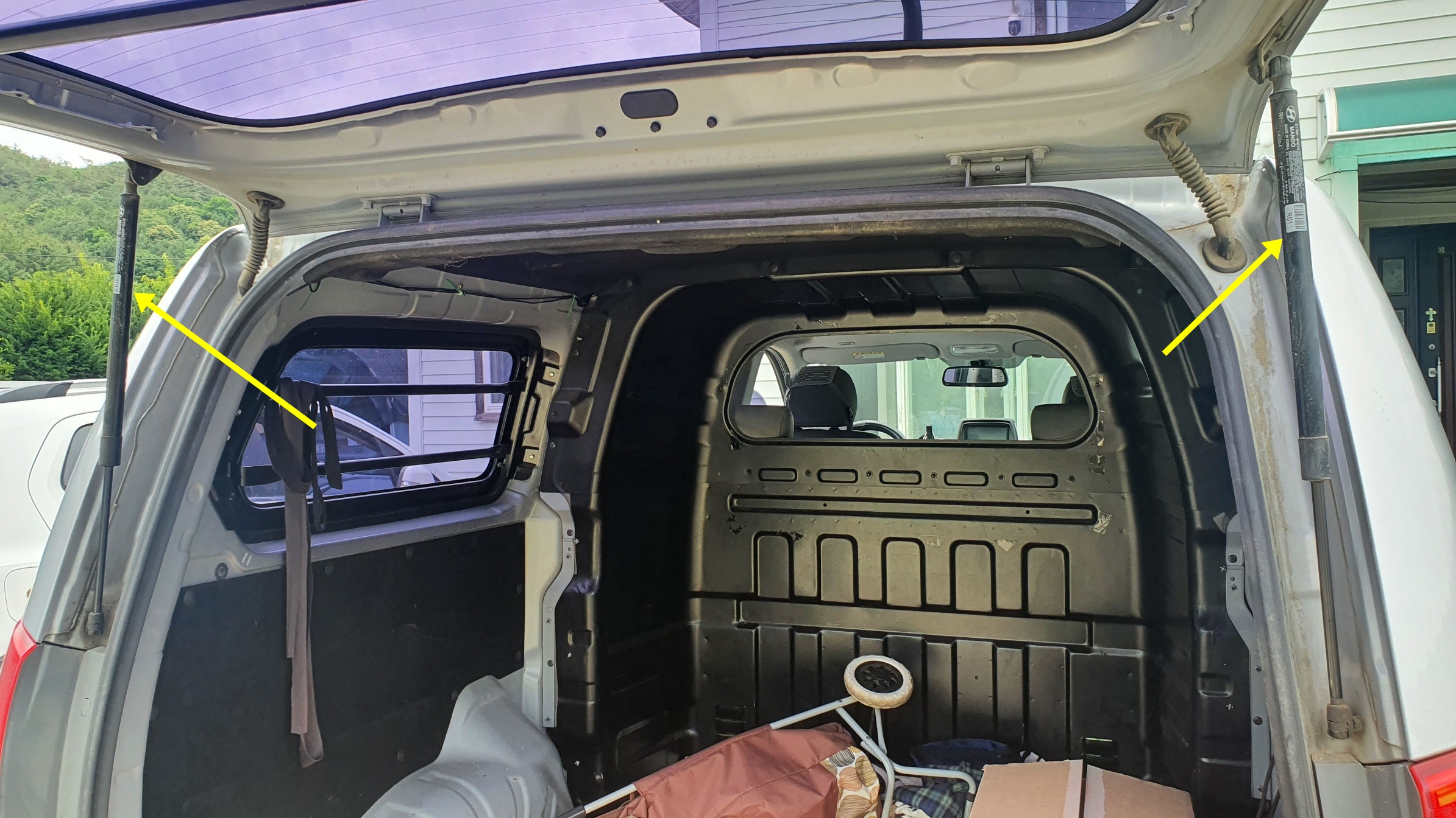 스타렉스 뒷문짝에는 2개의 쇼바가 있다. 확률상 아마도 두 개가 동시에 고장 나지는 않았을 것이고 둘 중 하나가 제 역할을 못하는 것으로 생각되지만 예방정비 차원에서 그냥 두 개 모두 교체해 주기로 했다. 혹시 이 글을 보고 DIY 하실 분들은 먼저 양쪽의 부품을 모두 탈거하여 어느 쪽이 고장 났는지 체크 후 필요한 쪽의 부품만 구입하여 교체하면 돈을 절약할 수 있을 것이다. 고장 난 쇼바는 손으로 눌러봐서 버티는 힘 없이 쑥쑥 잘 들어가면 고장 난 것이다.