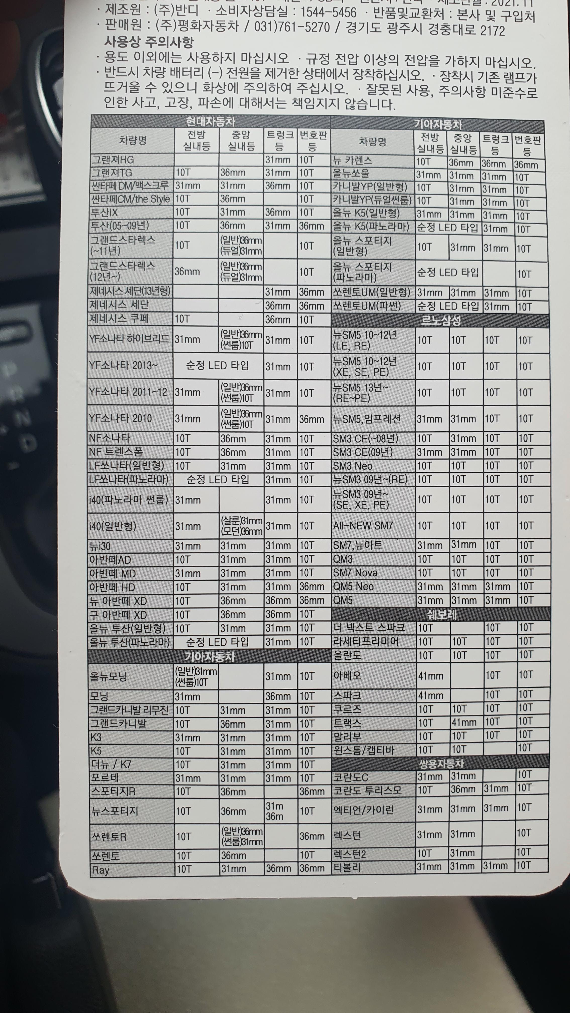 LED 포장의 뒷면을 보니 차량별로 규격이 나와 있는데 아반떼AD의 경우에는 실내 앞에 있는 등은 10T를 구입하면 되고 중간 실내등은 31mm짜리를 구입하면 되었다.