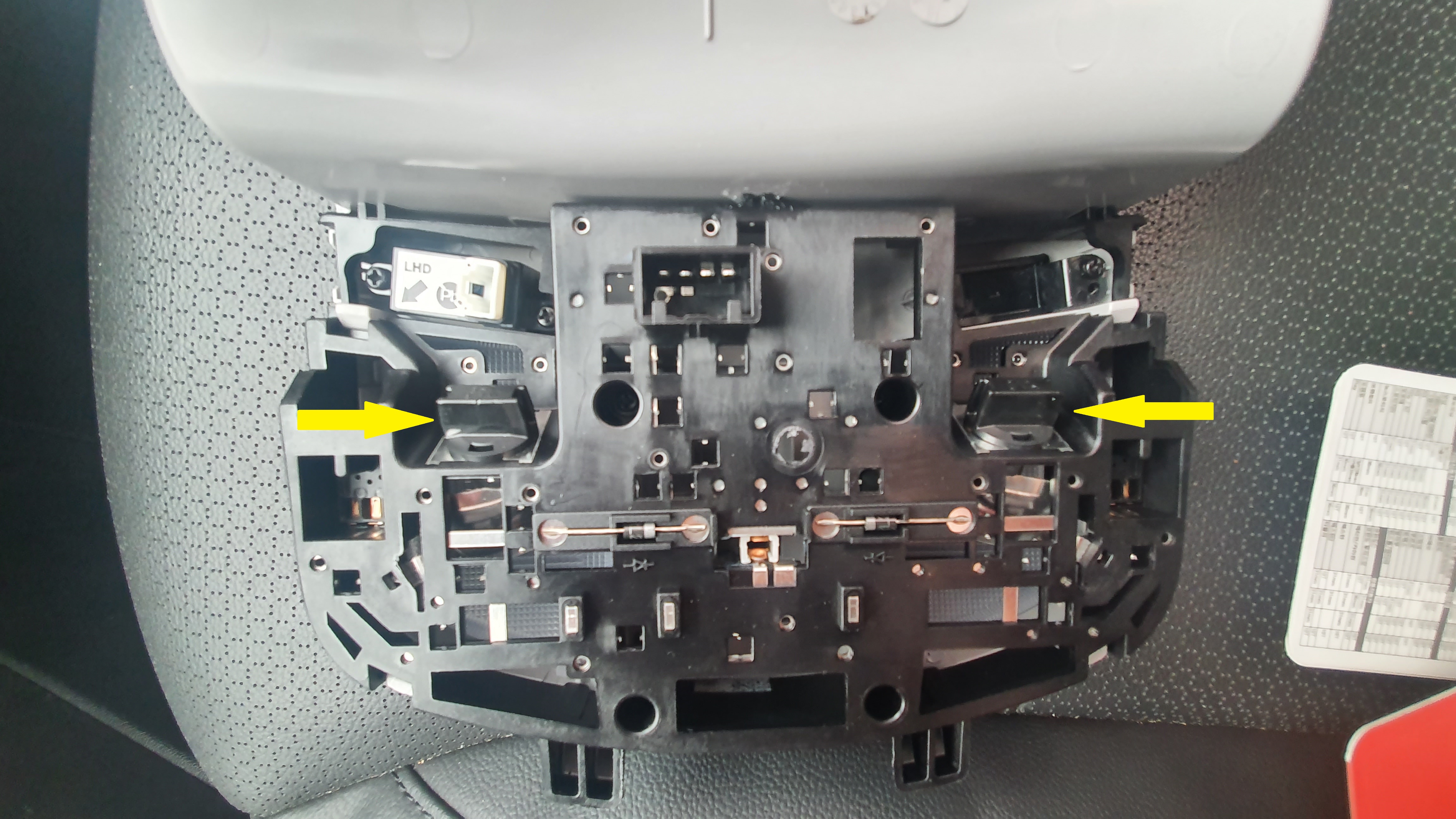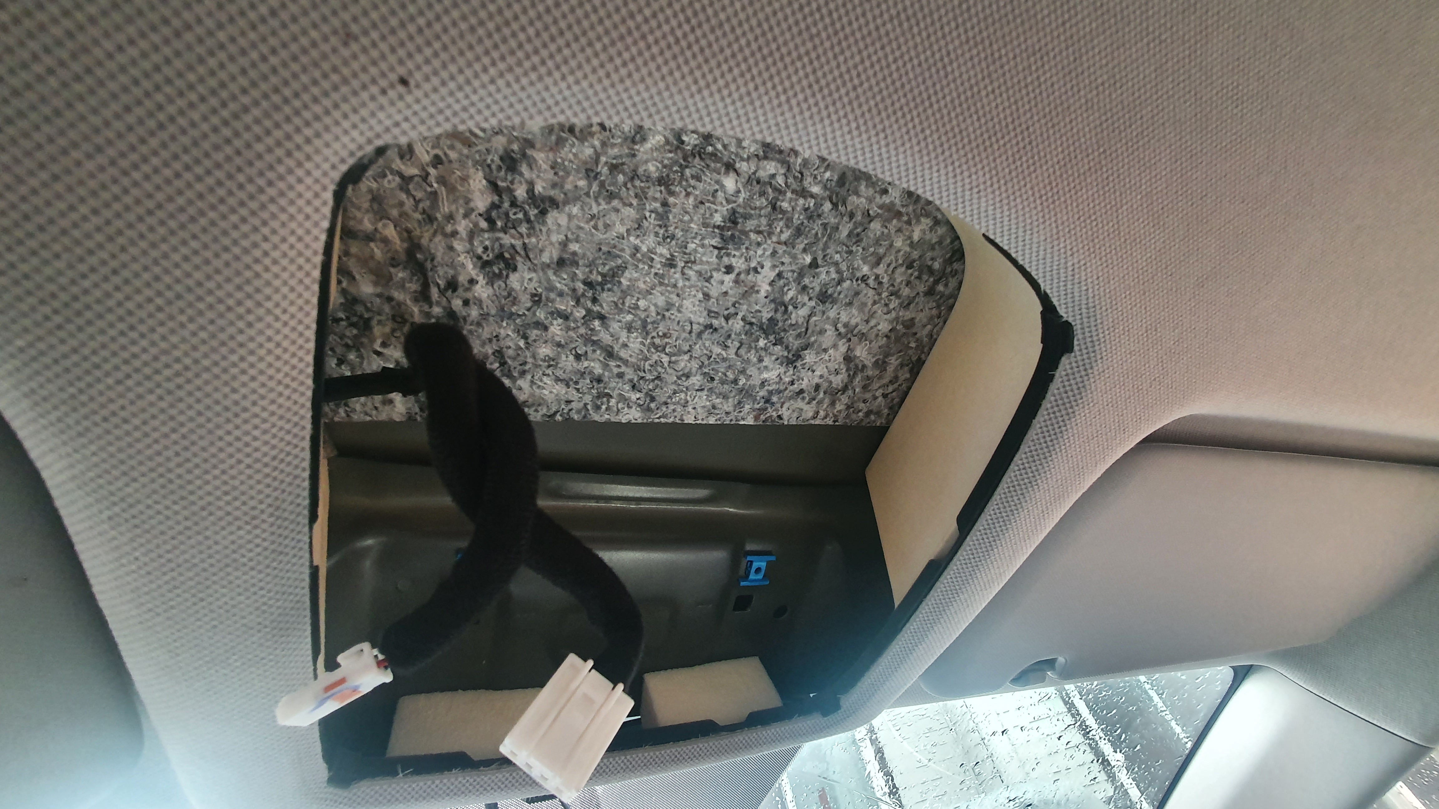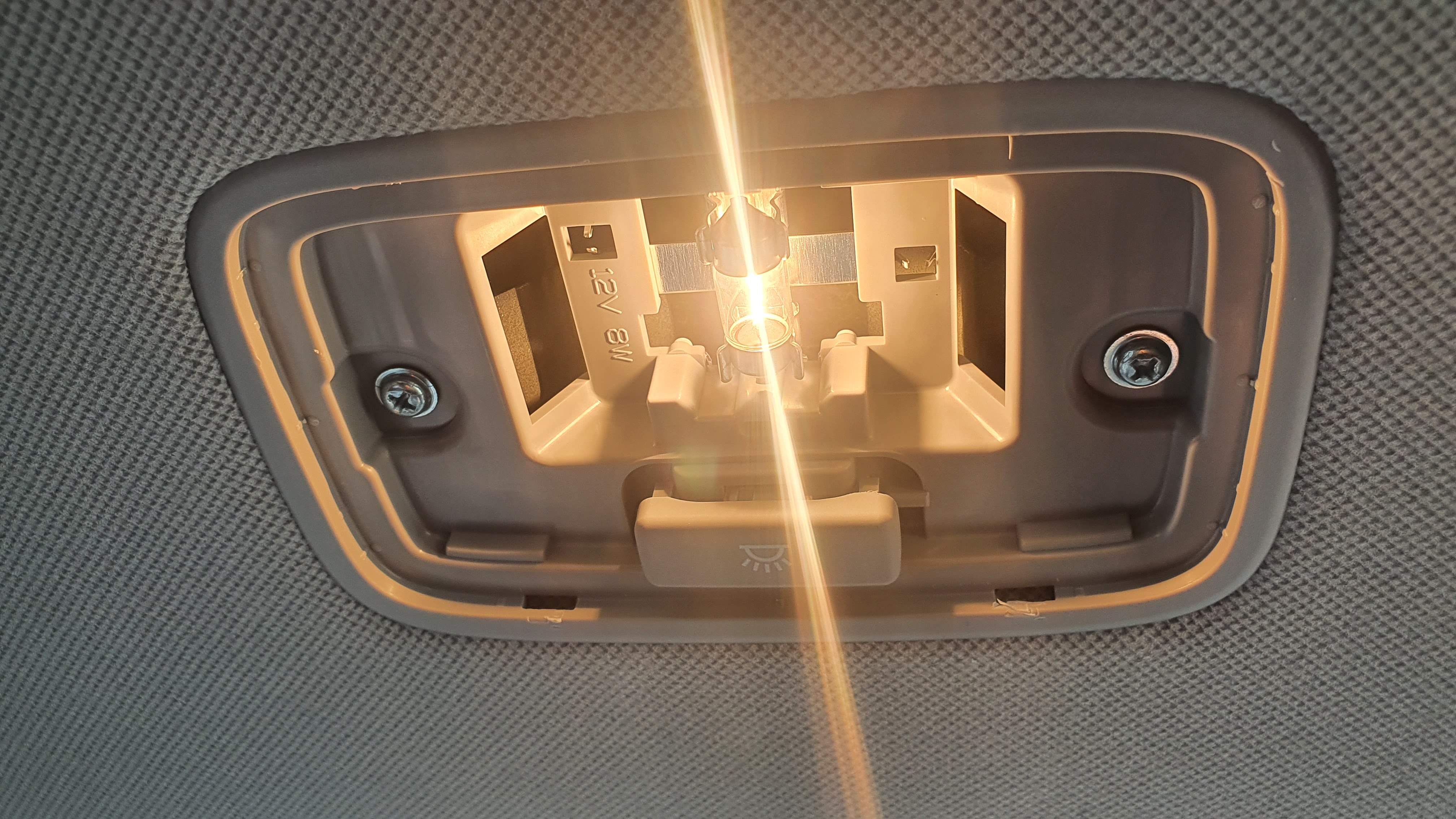 전방등의 경우 투명 커버만 제거하고 교체가 가능하다고 하는데 괜히 뜯다가 흠집이 날 수도 있을 것 같아서 그냥 분해해서 작업해 주었다. 안경 보관함을 열면 안쪽에 2개의 나사가 있는데 이것만 풀고 빼내면 빠진다. 케이블 2개도 분리해 준다.
