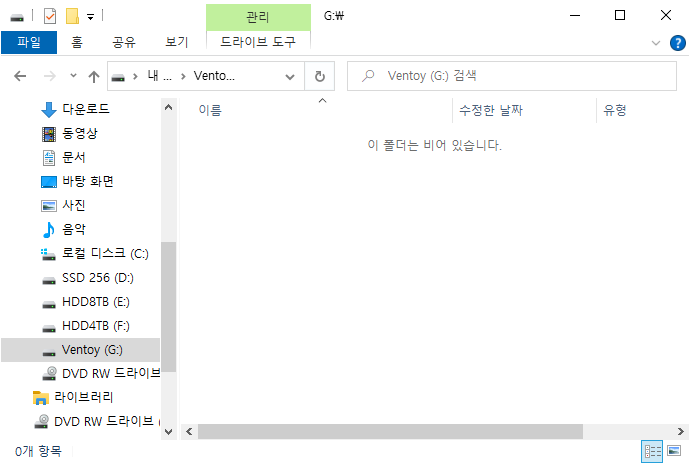 하지만 USB를 열어보면 아무런 파일도 들어있지 않다. Ventoy 프로그램은 숨겨진 파티션(EFI 시스템 파티션)에 있으므로 보이지 않는다. 위의 USB 최상위 폴더에 여러가지 OS의 ISO 이미지 파일을 복사해서 넣으면 된다.