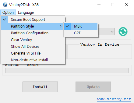 옵션이 여러가지가 있는데 윈도에서 일반적인 사용목적이라면 별로 건드릴 게 없을 것 같다. Install 버튼은 Ventoy를 USB에 설치하는 버튼이고, Update 버튼은 USB에 설치된 Ventoy 버전을 업데이트하는 버튼이다.