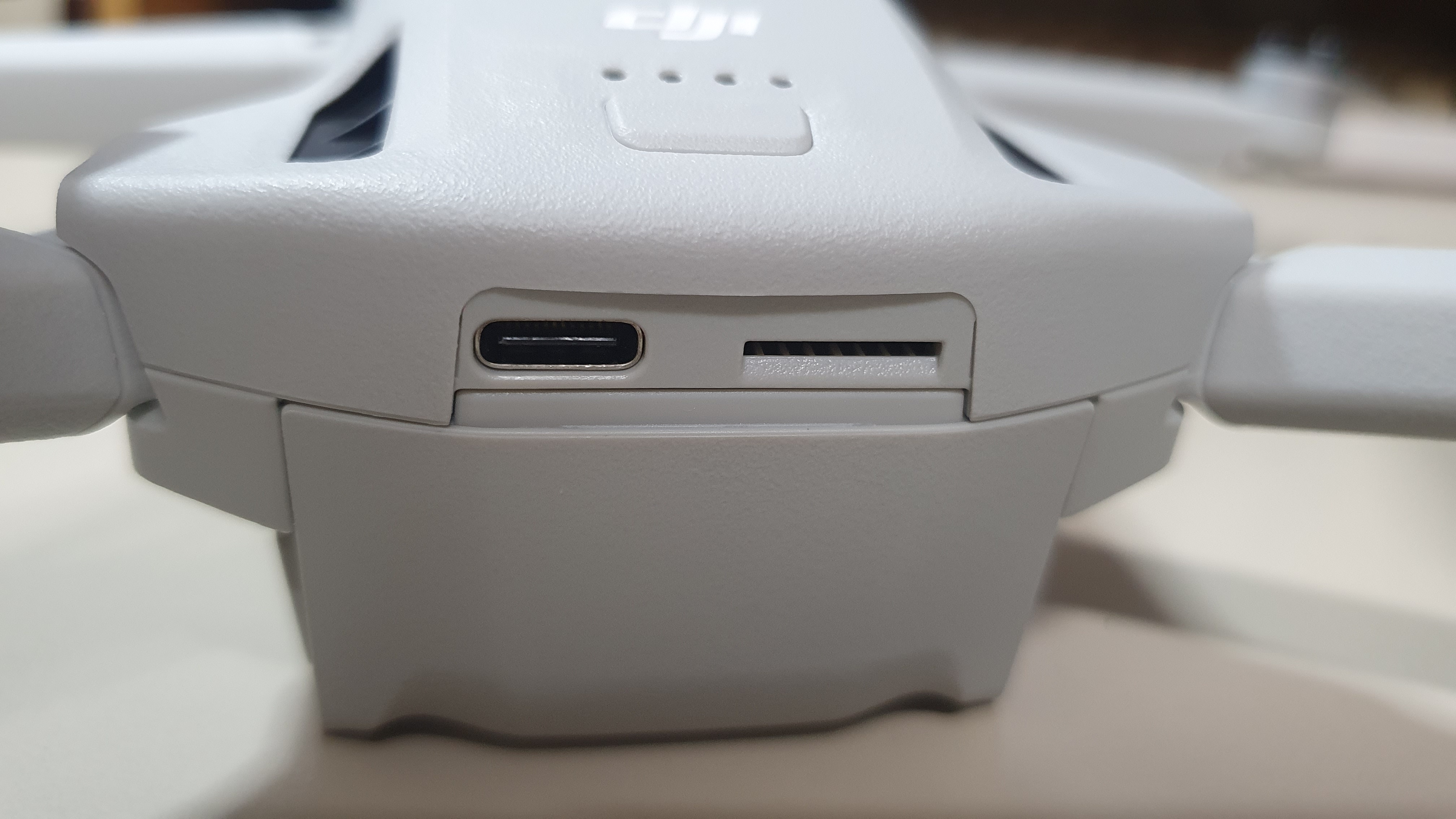 USB-C 타입 충전포트와 마이크로 SD카드 단자이다. 4K 영상을 녹화하려면 저장속도가 빠른 SD카드를 구입하는게 좋을 것 같다. 집에 있던 샌디스크 울트라라는 SD카드를 넣었더니 녹화가 되긴 되는데 DJI Fly앱에 느린 SD카드라고 뜬다.
