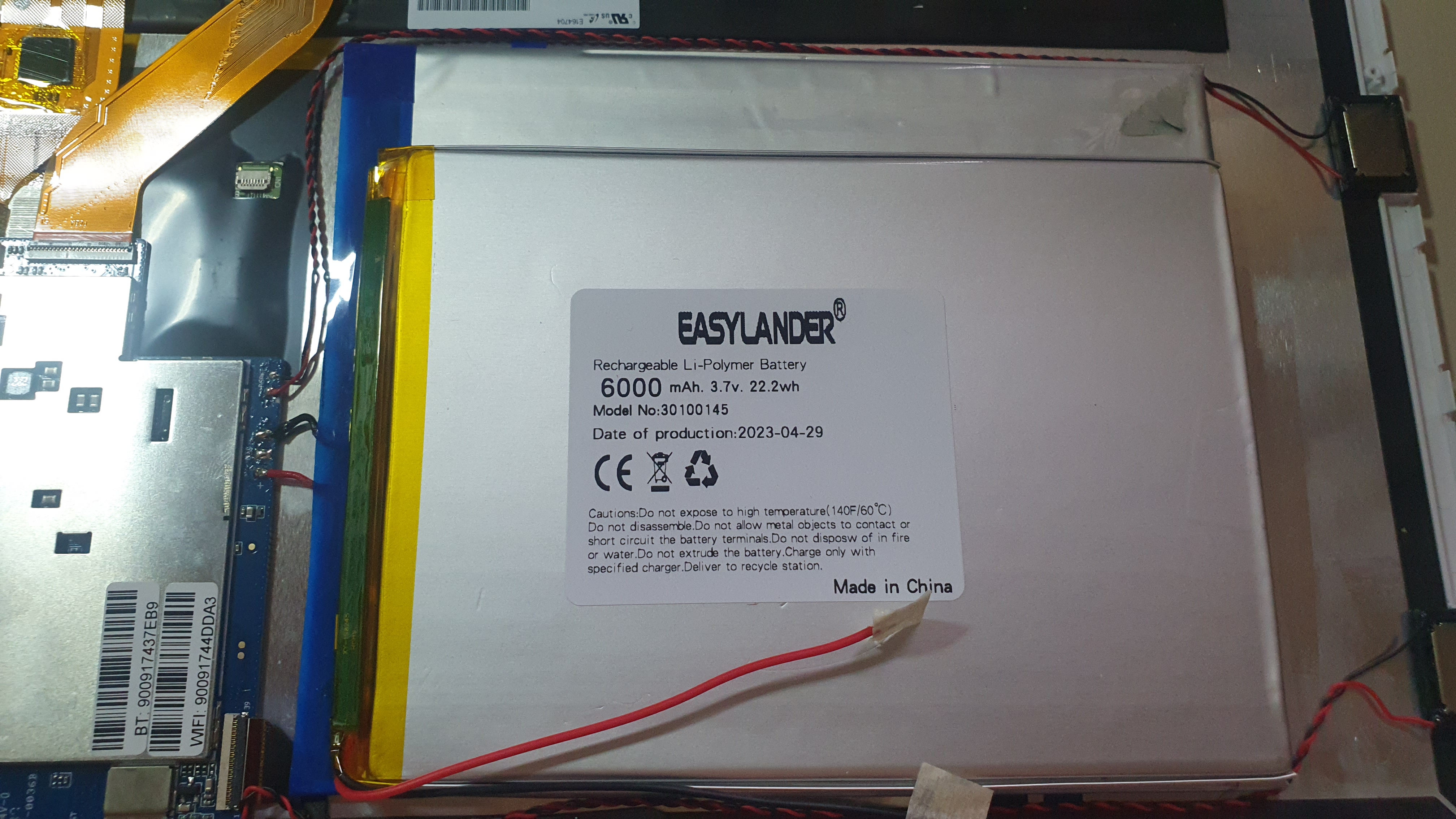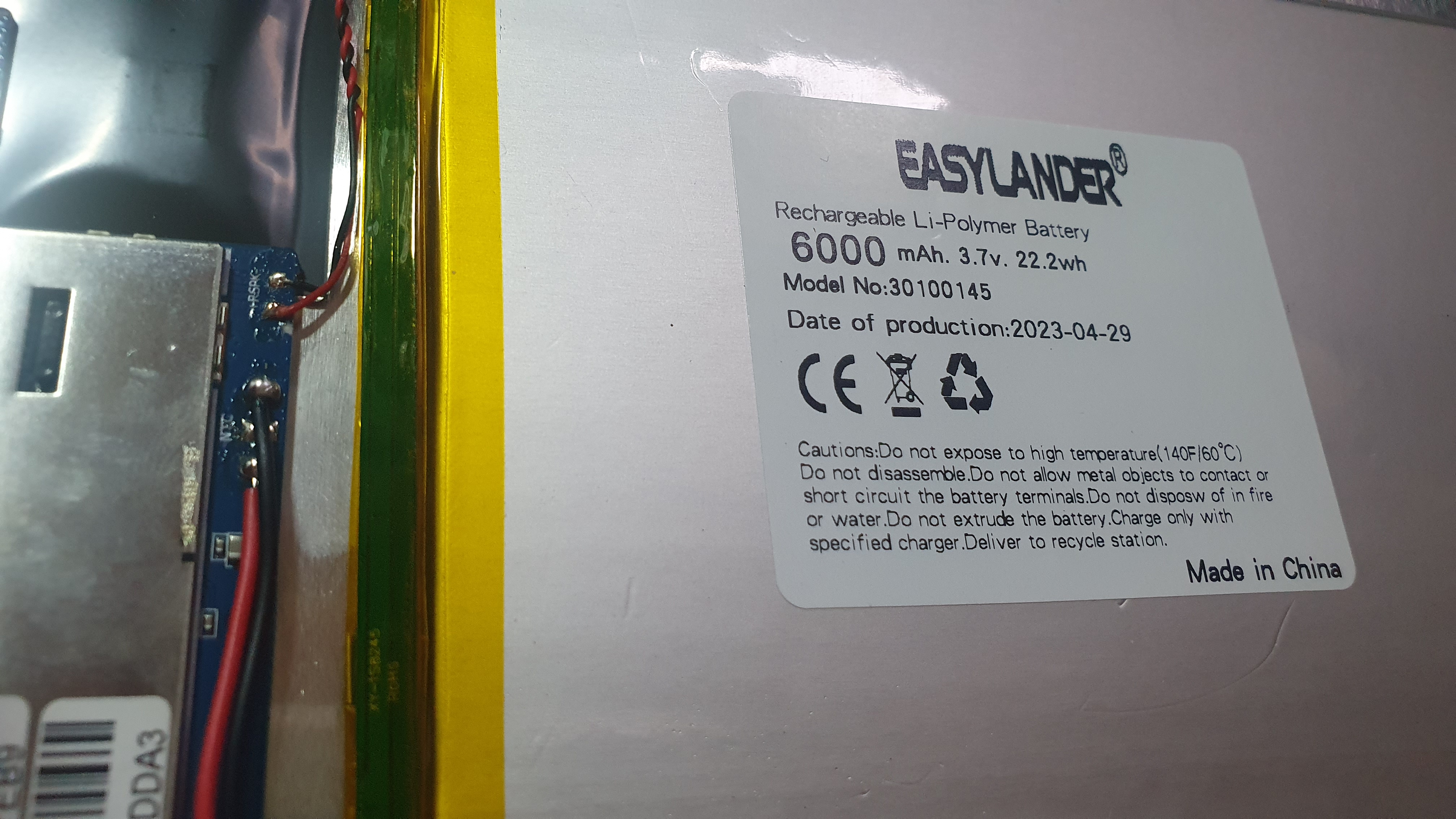 이지랜더란 메이커이다. 보호회로가 달려 있고 사이즈는 두께 3mm, 길이 100mm, 너비 145mm 이다. 오리지널 배터리 사이즈는 아래에 나오겠지만 3mm, 123mm, 147mm이다. 두께와 길이는 비슷한데 너비가 오리지널에 비해서 23mm가 작다. 그런데 표기된 용량은 6000mAh로 같다. 그동안 기술이 발전한 건가? ^^ 생산일자가 23년 4월 29일이다. 따끈따끈한 신상 배터리!