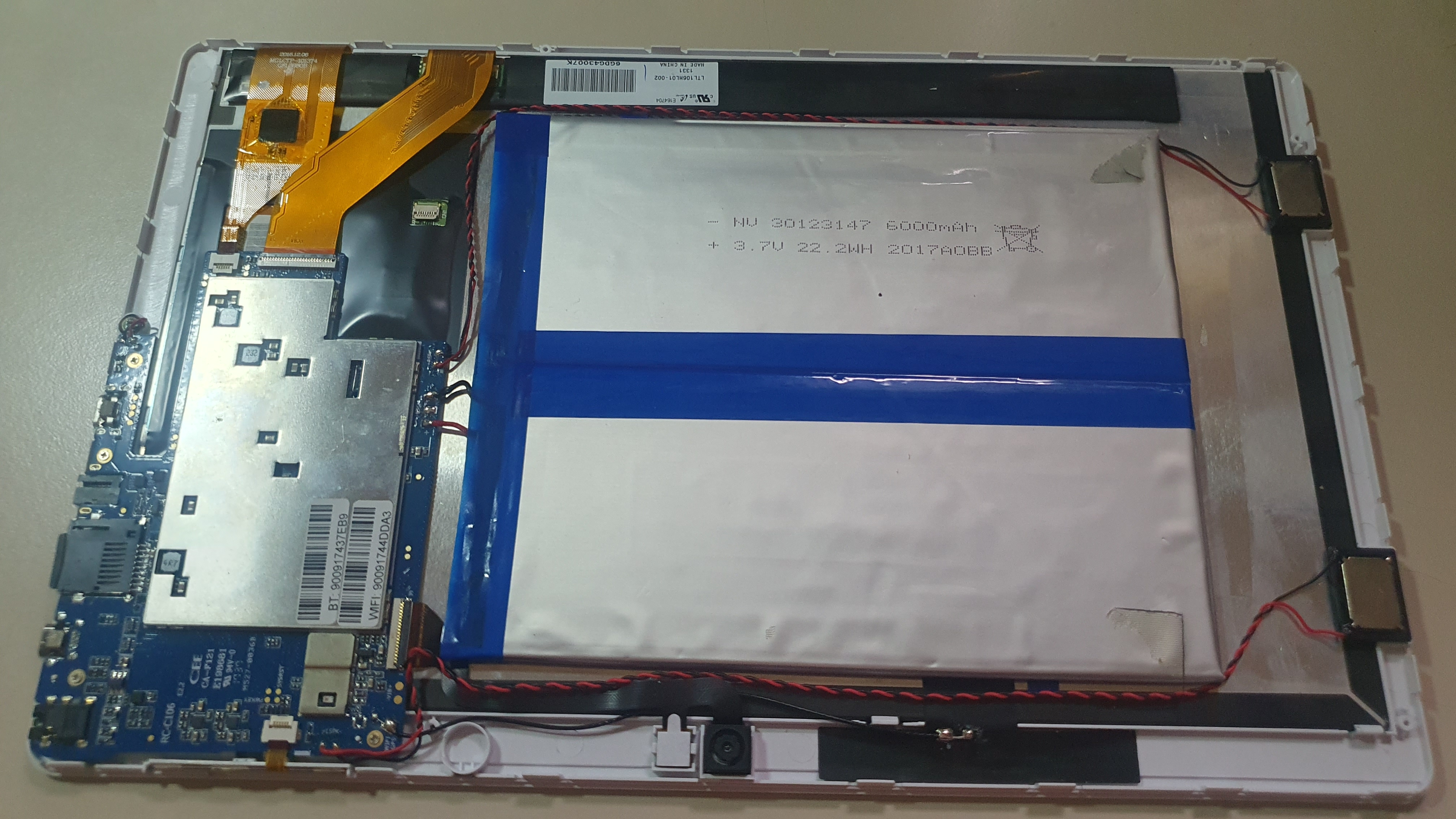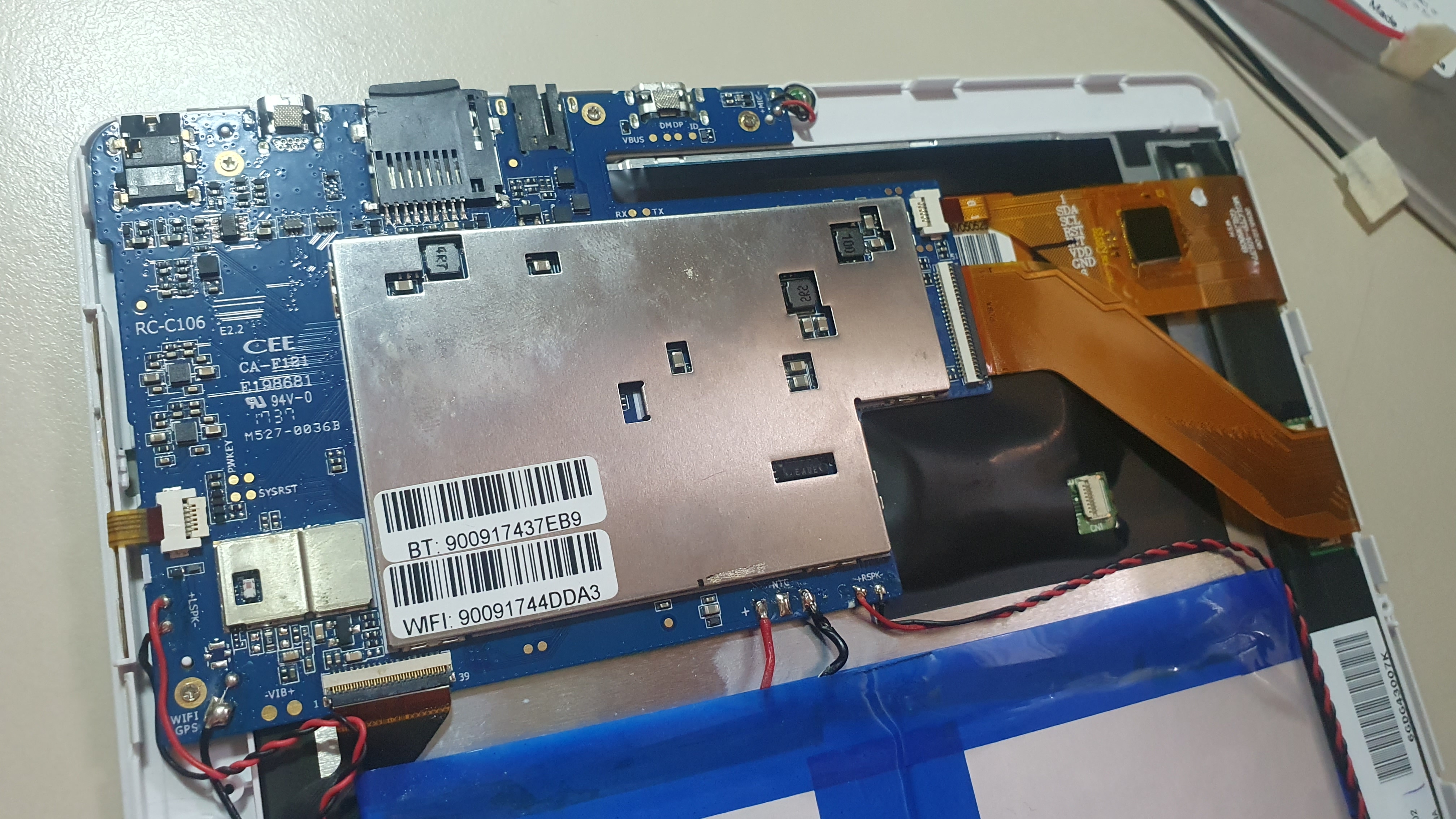 어떠한 고정나사도 없기 때문에 신용카드 같은 얇은 플라스틱 조각으로 저렇게 아래판과 윗판 사이를 벌리면 쉽게 분해가 가능하다. 저가 태블릿의 장점 아닌 장점이라고 할 수 있겠다 ^^;
