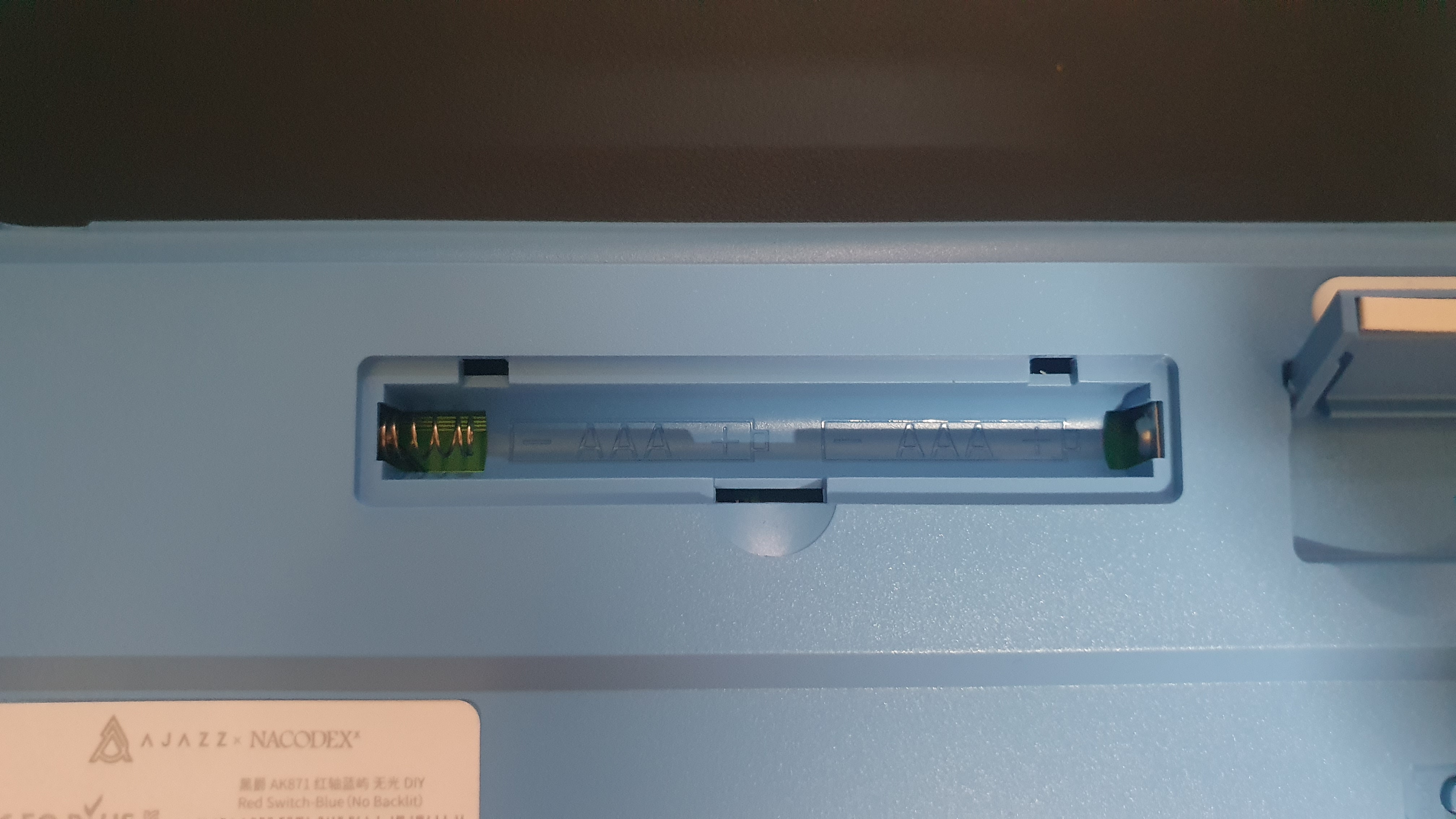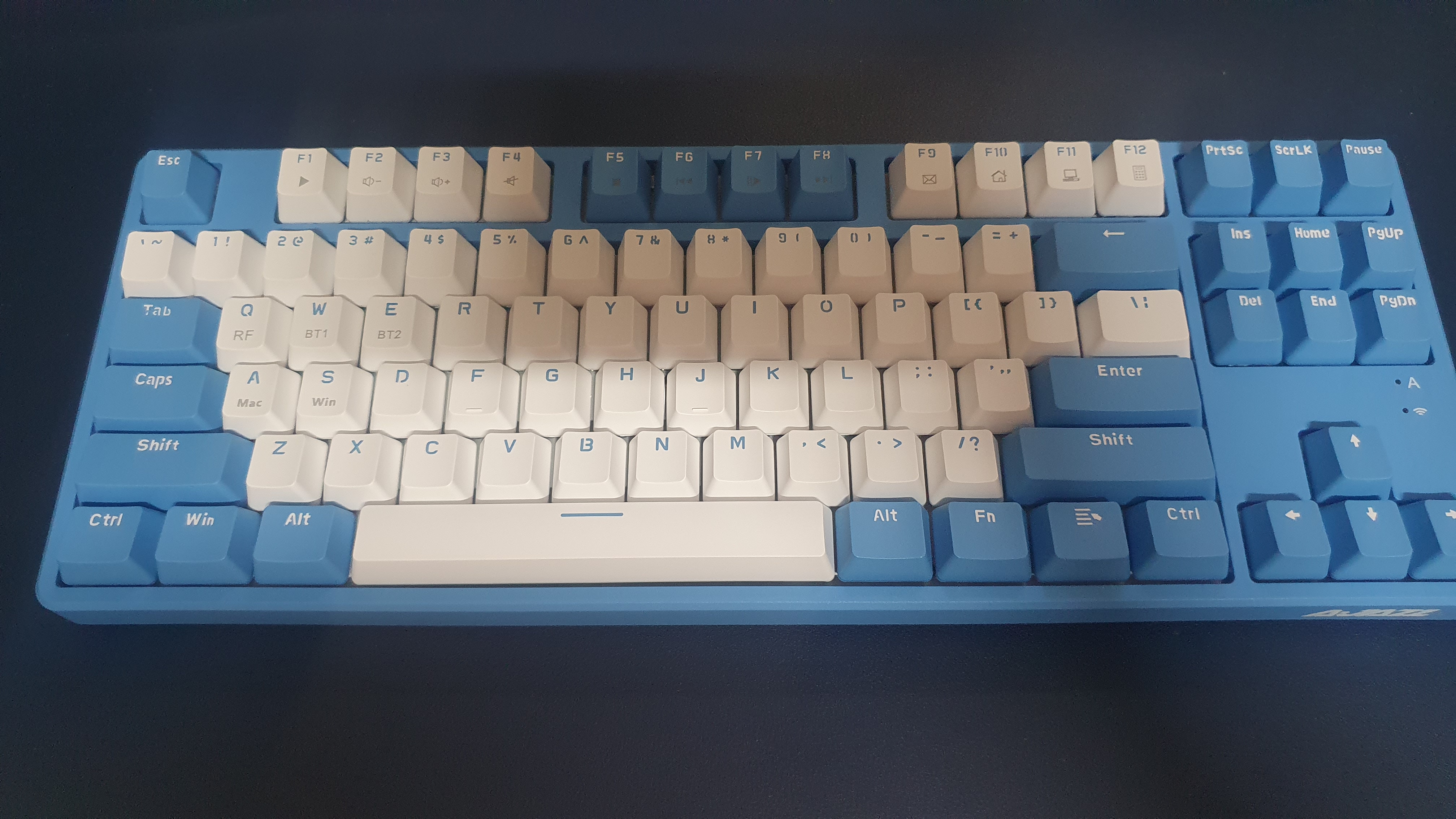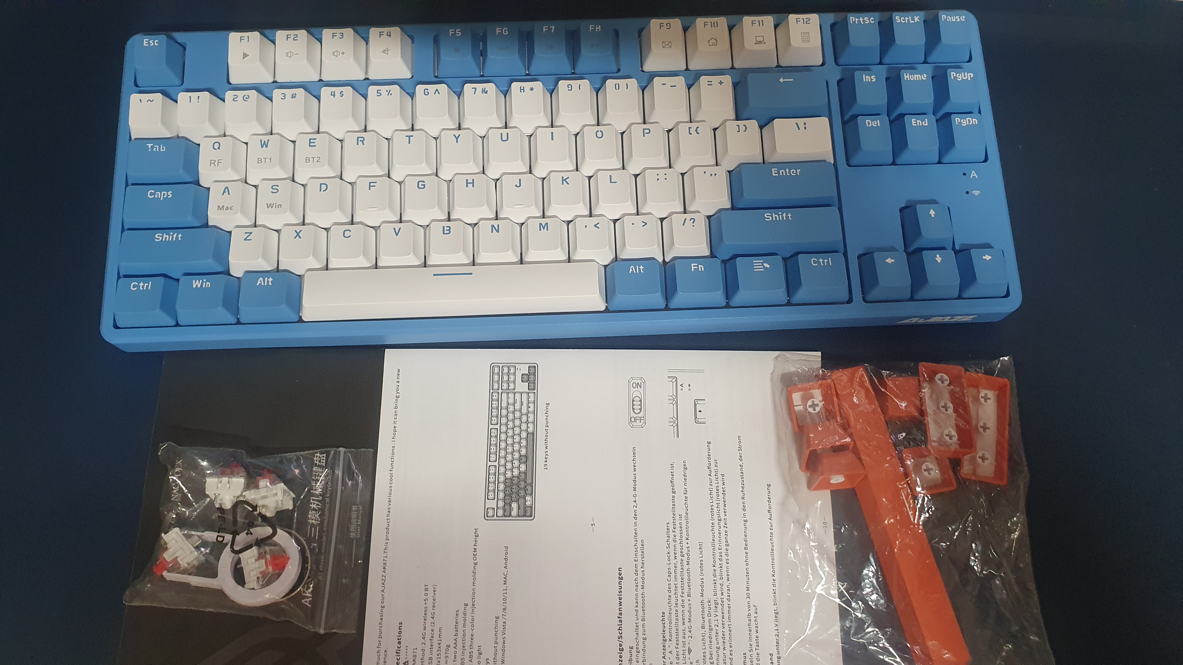 현재는 2만 원대 초반의 저렴한 가격에 구입이 가능하다. (국내 어디에서 2만 원 초반에 기계식 무선 키보드를 무료배송으로 구입할 수 있을까?) 중국 Ajazz의 AK871이라는 키보드인데 87키 텐키리스 키보드이다. 텐키리스 표준배열이니 적어도 배열 때문에 오타가 날 가망성은 없어 보인다. 큐텐인데도 2주가 넘어서 배송되었다. 주문이 많아서 그런지 발송 자체가 많이 지연되는 느낌이다. 색상은 블루 계열과 베이지 계열이 있고 축은 클릭감이 없는 적축과 클릭감이 있는 청축이 있는데 나는 좀 더 산뜻한 느낌의 블루 색상에 조용한 적축을 선택했다.