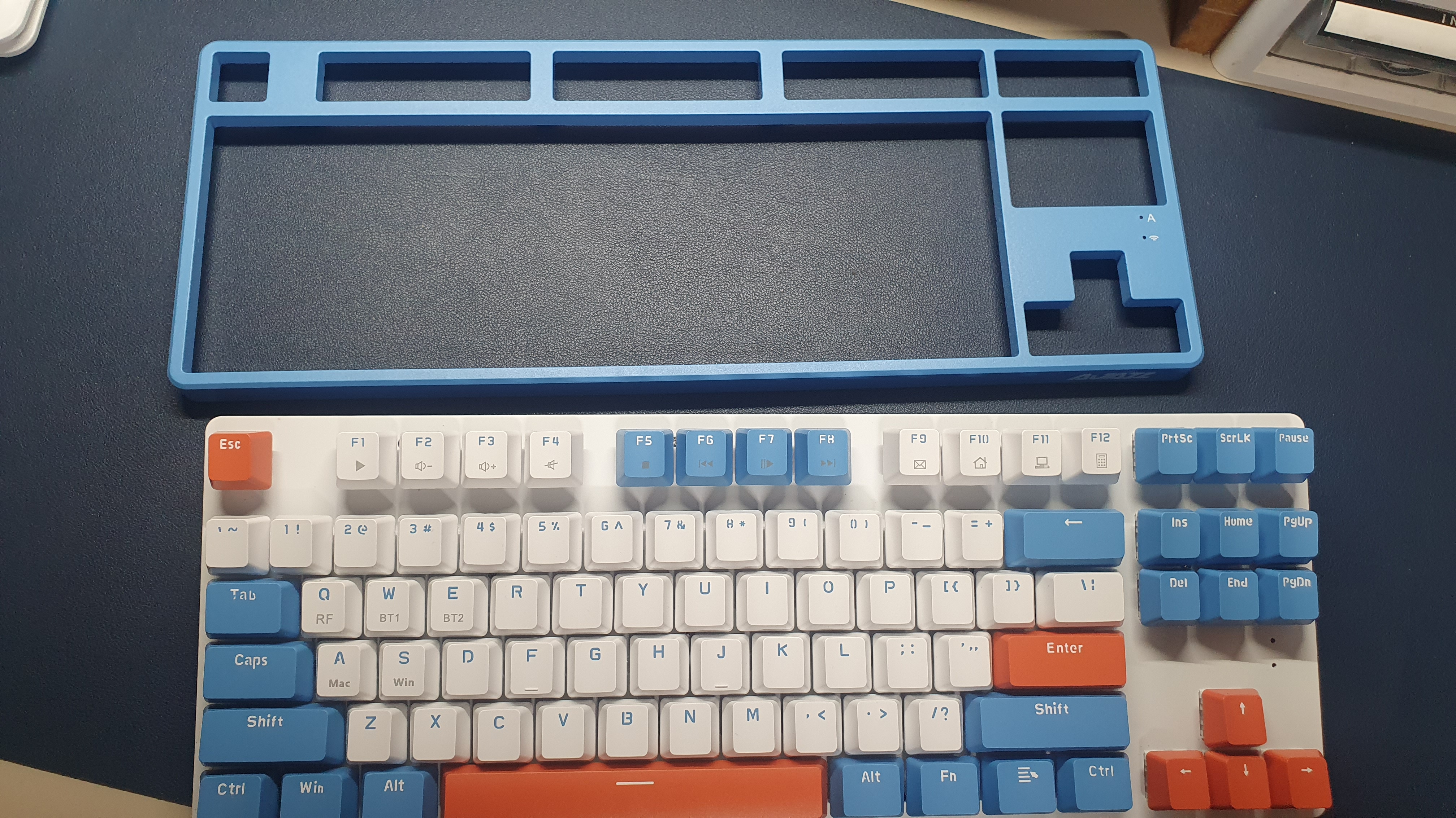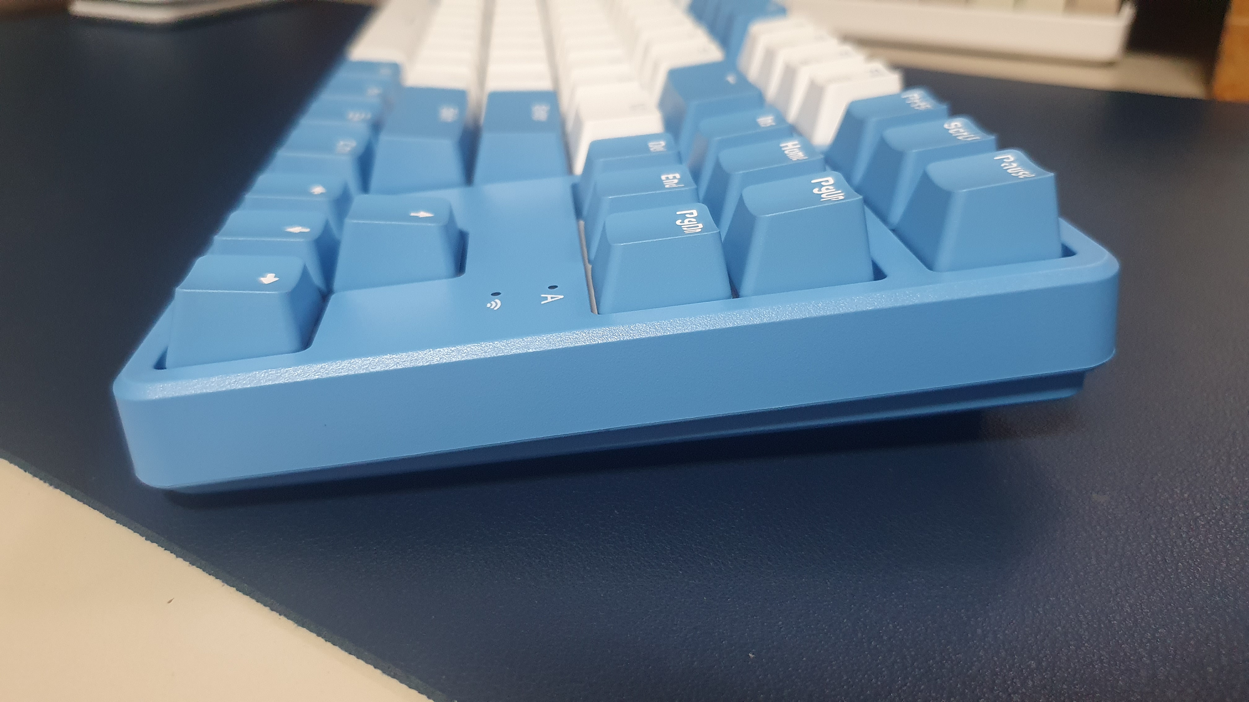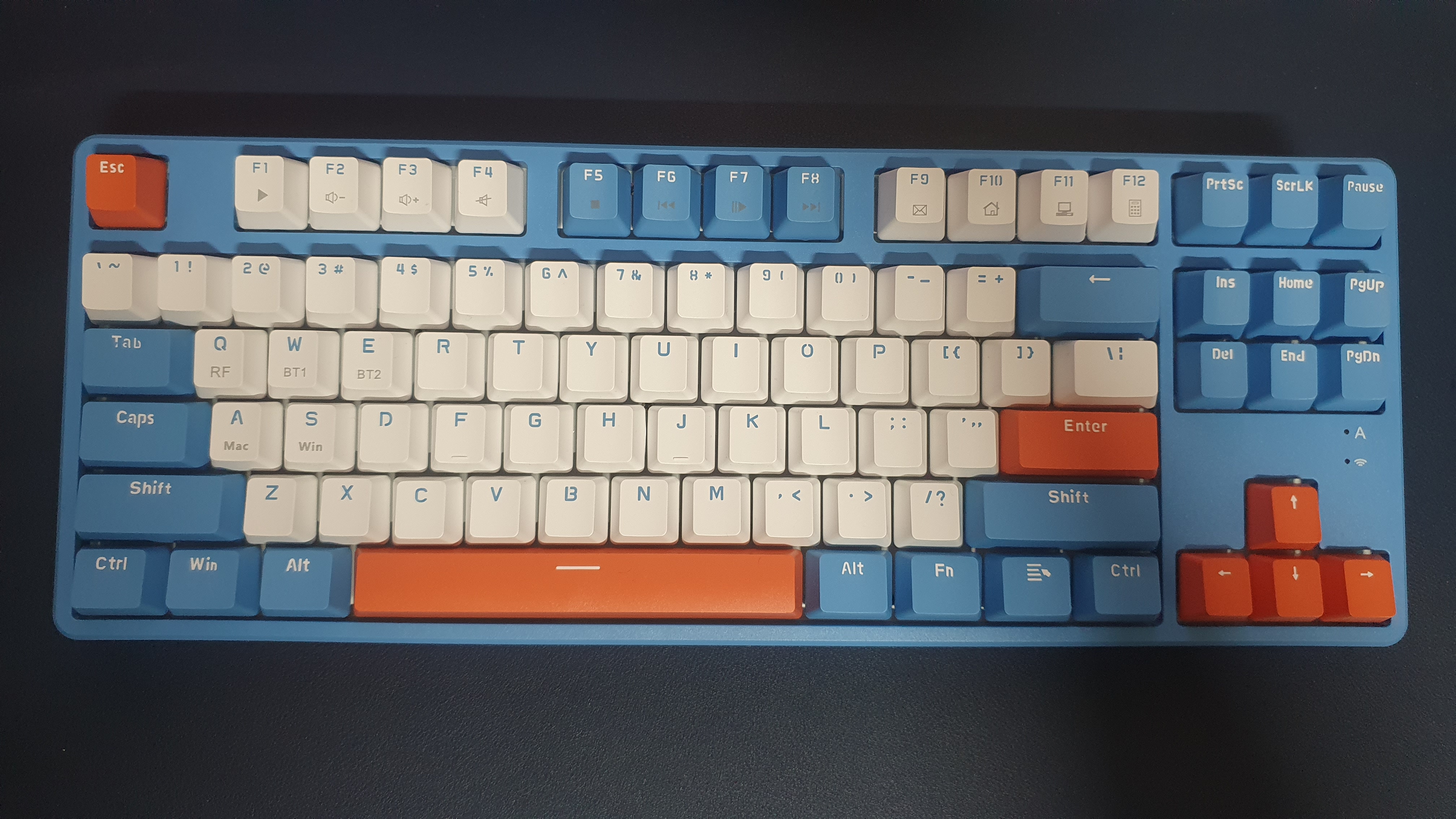 원래의 키보드 모습인데 너무 파랭이여서 기본 제공된 주황색 캡으로 교환해 주었다. Enter, Space, 방향키, ESC를 바꿔주니 나름 예쁜 키보드가 되었다.