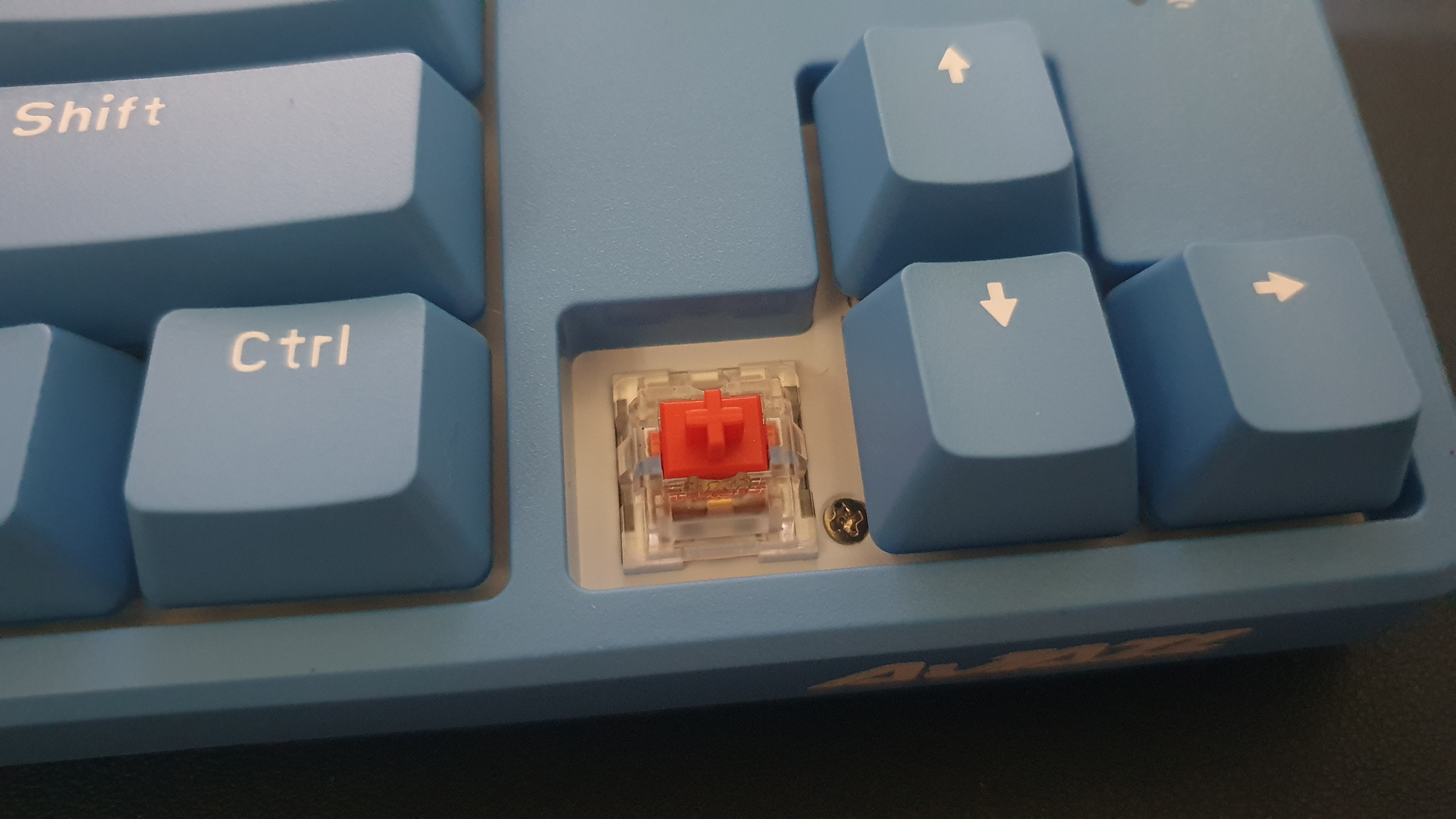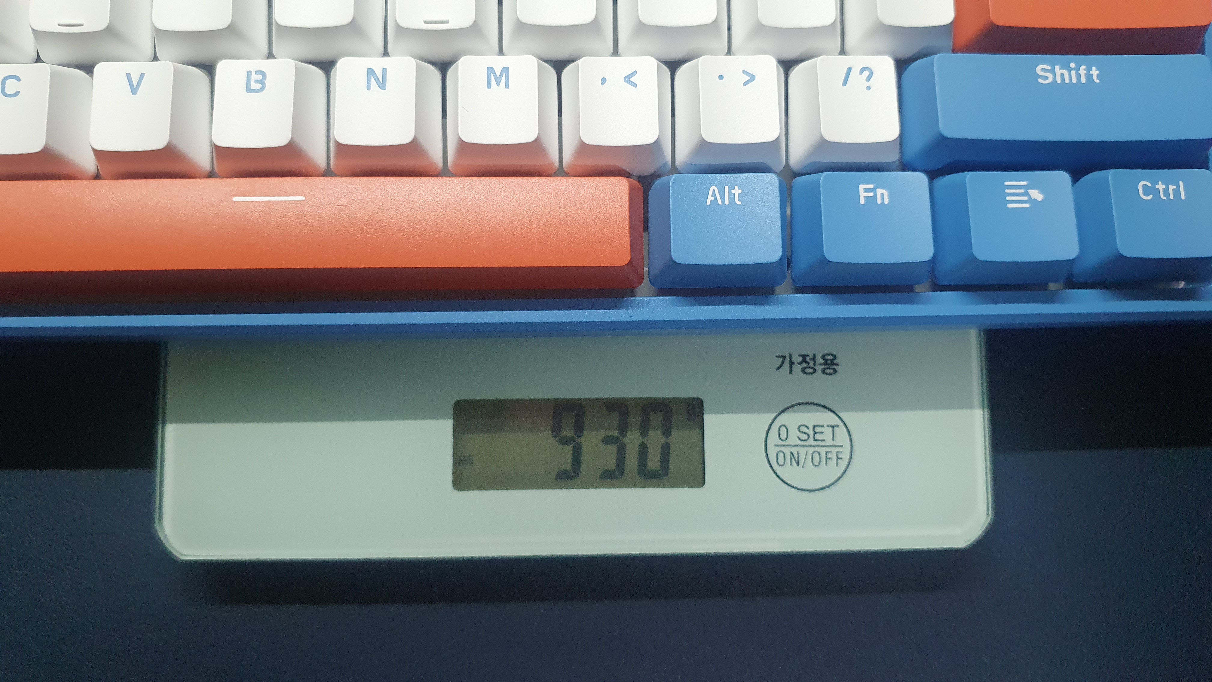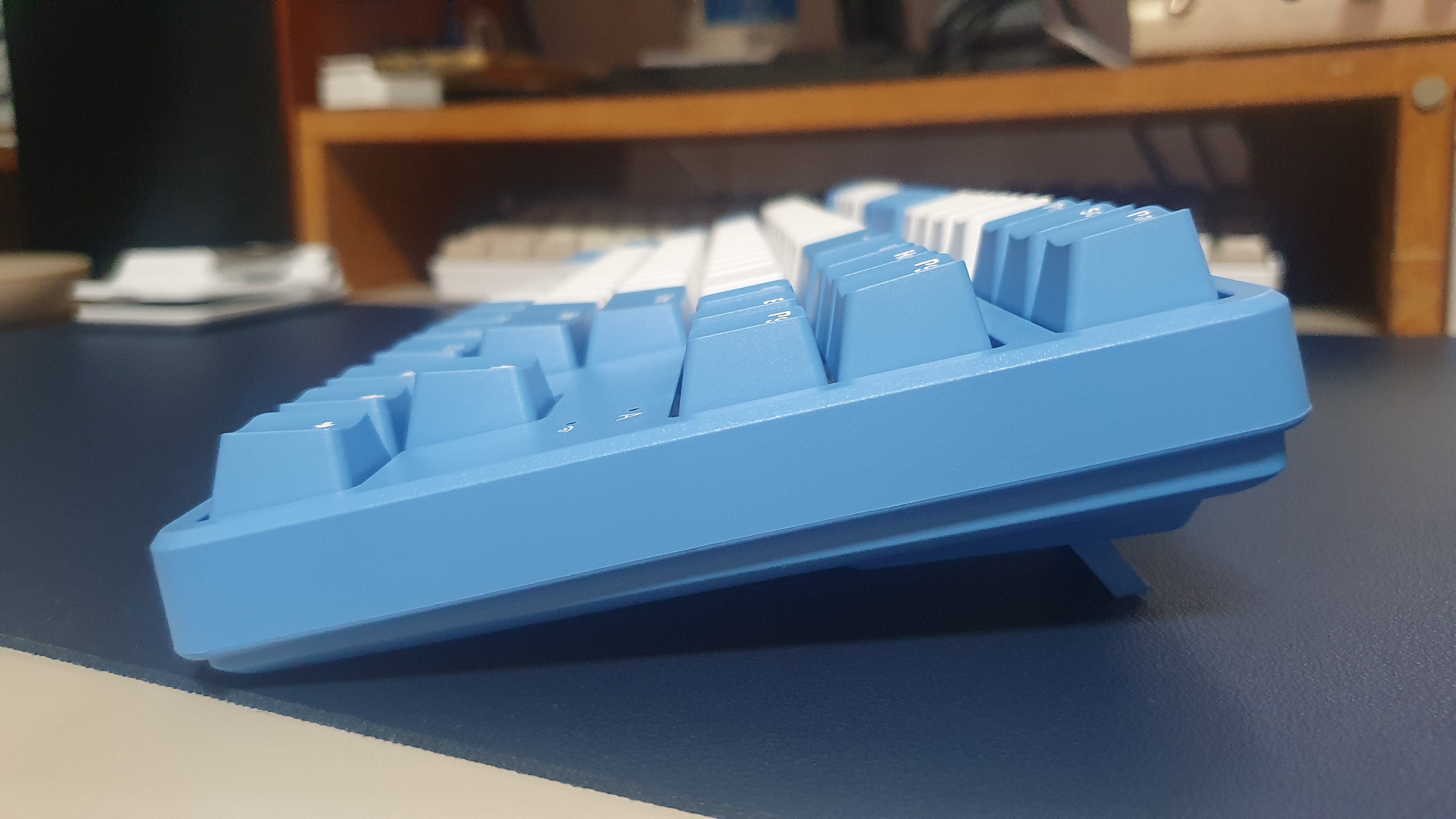 원래의 키보드 모습인데 너무 파랭이여서 기본 제공된 주황색 캡으로 교환해 주었다. Enter, Space, 방향키, ESC를 바꿔주니 나름 예쁜 키보드가 되었다.
