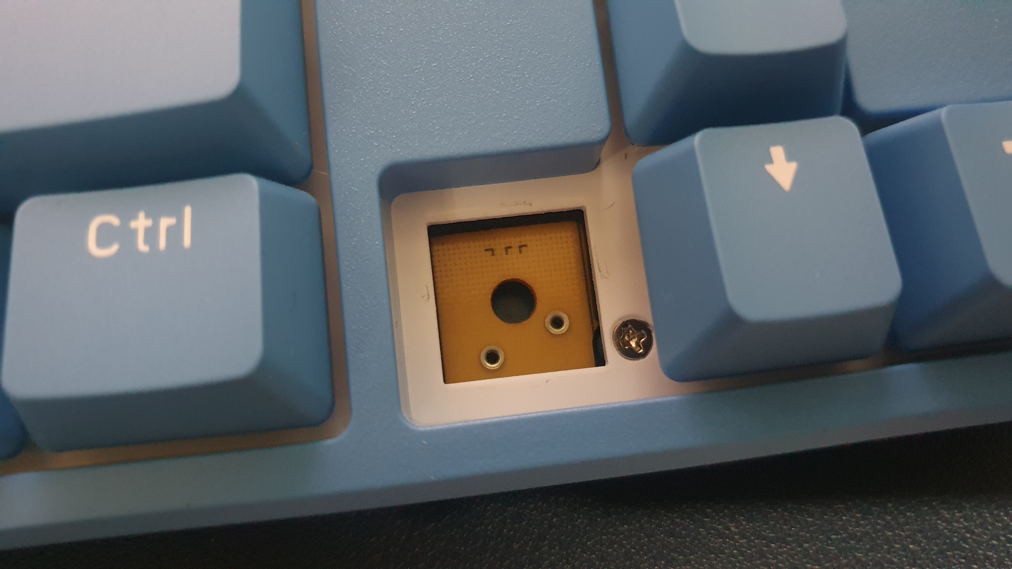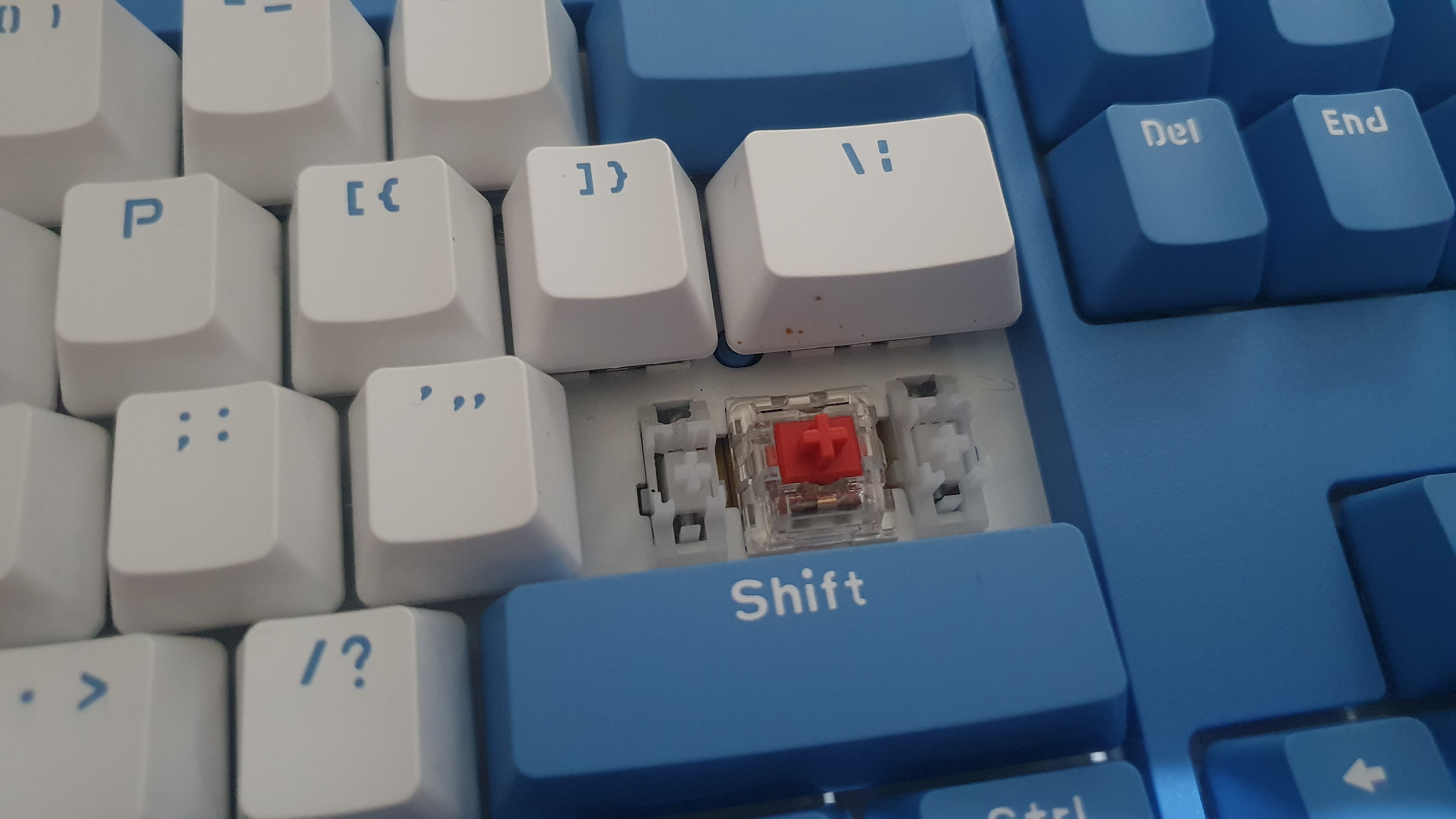 키캡을 뽑으니 이렇게 적축 스위치가 보인다. 눌러보니 클릭감이 없어 아무런 소리도 들리지 않는다.