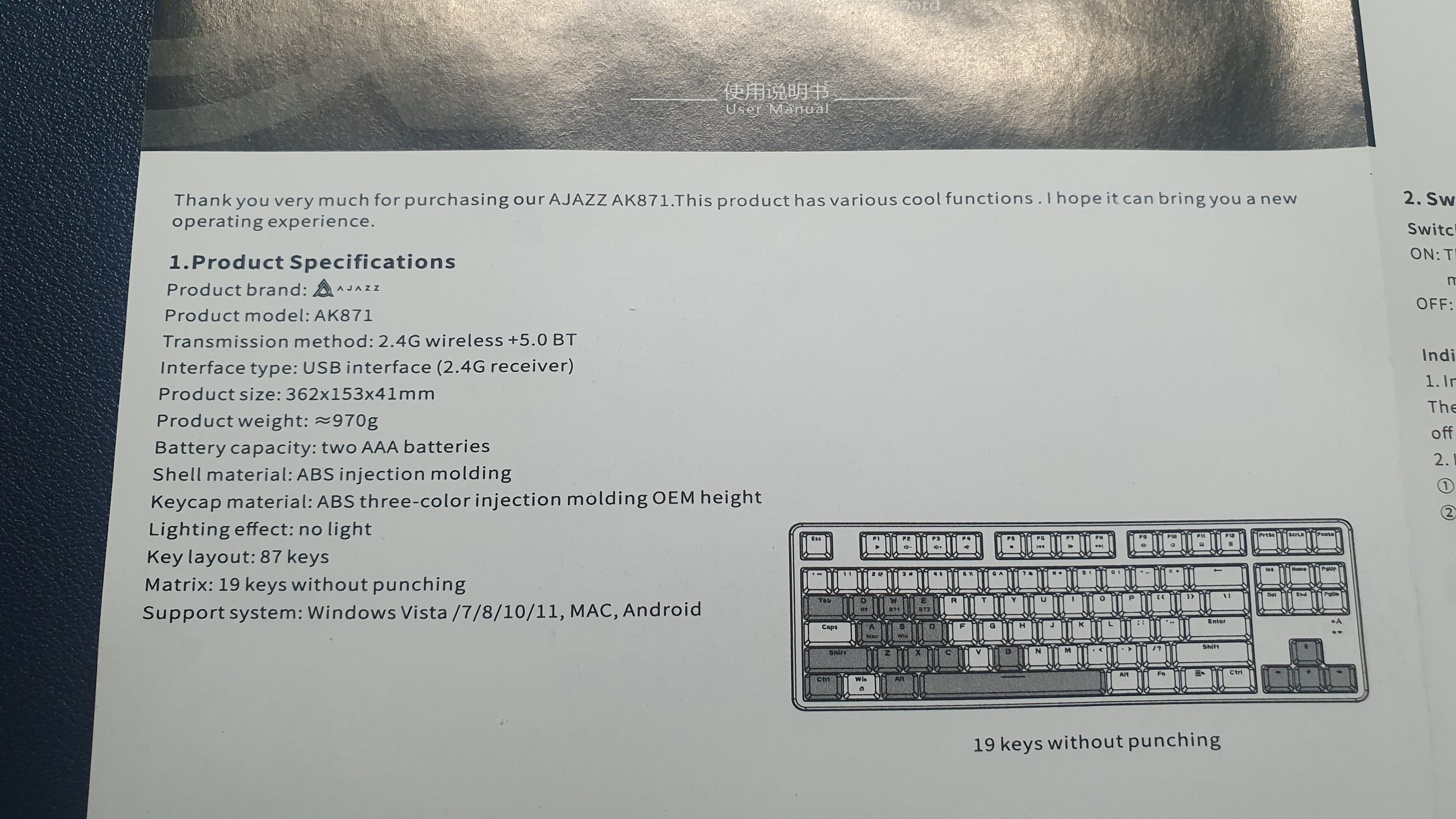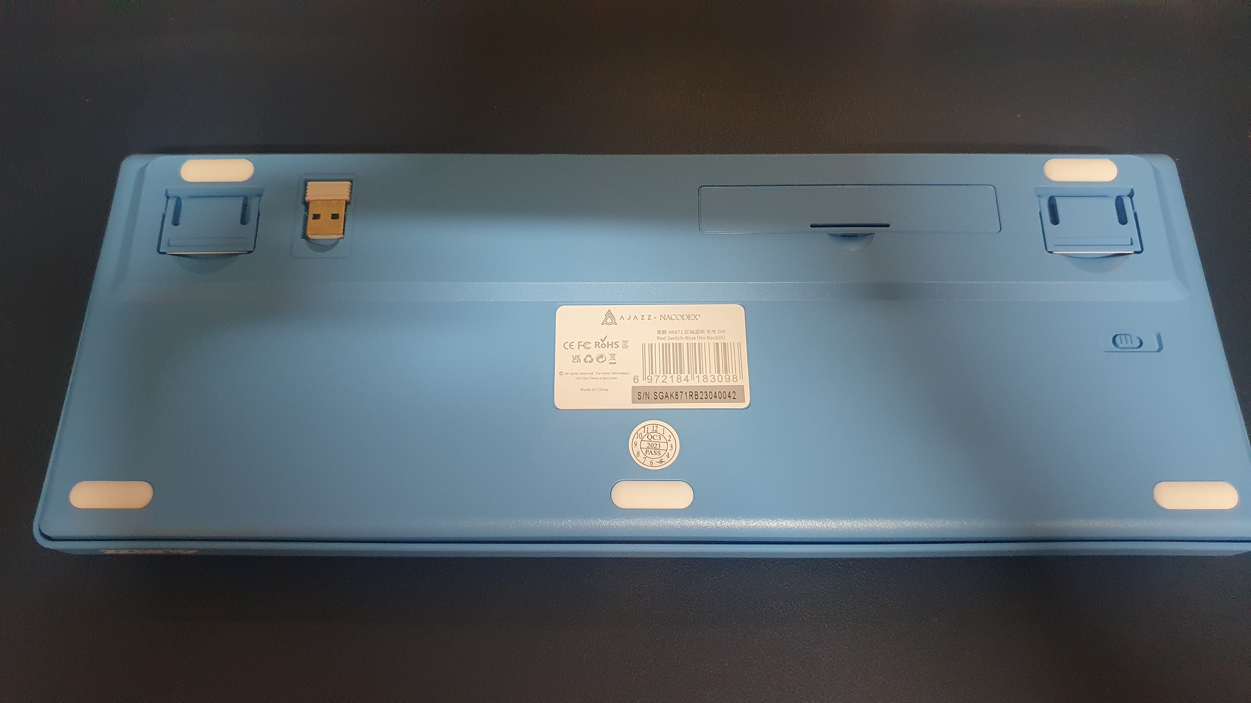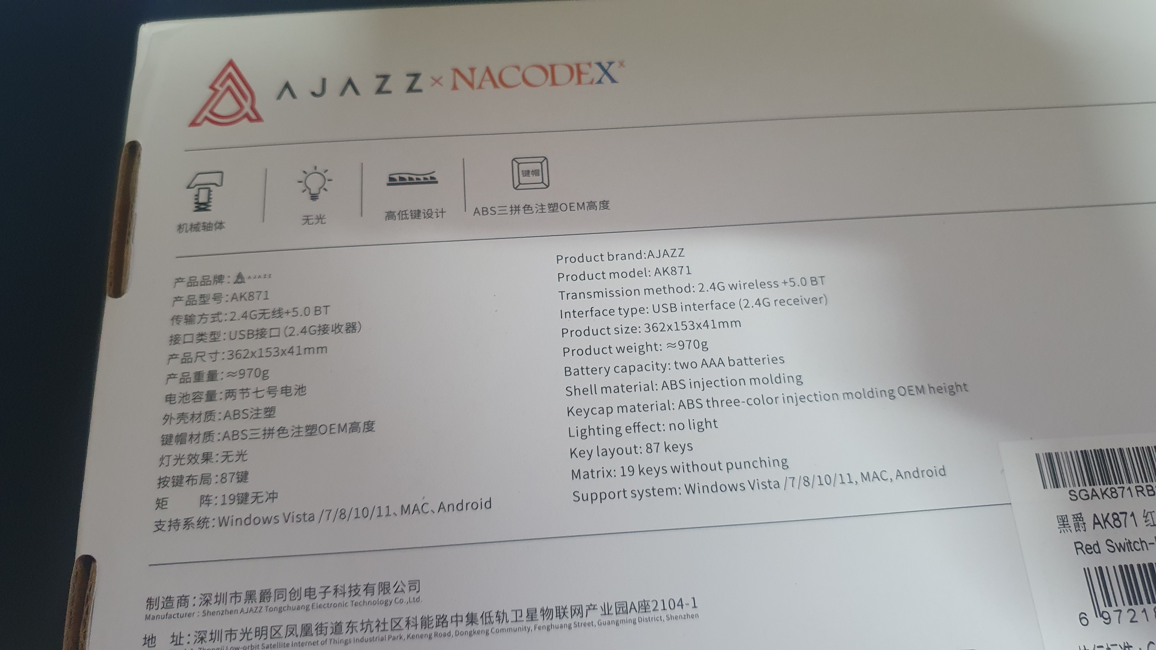 상자에 쓰여있는 간단한 스펙이다. 무선동글을 이용한 2.4G 무선 모드 그리고 블루투스 연결을 지원한다. 유선은 지원하지 않는다. 맥과 윈도 모드의 전환이 가능하여 모두 사용이 가능하다. AJAZZ x NACODEX라고 쓰여 있는데 NACODEX가 뭔지는 잘 모르겠다. 두 회사가 합작으로 만들었다는 뜻인가?