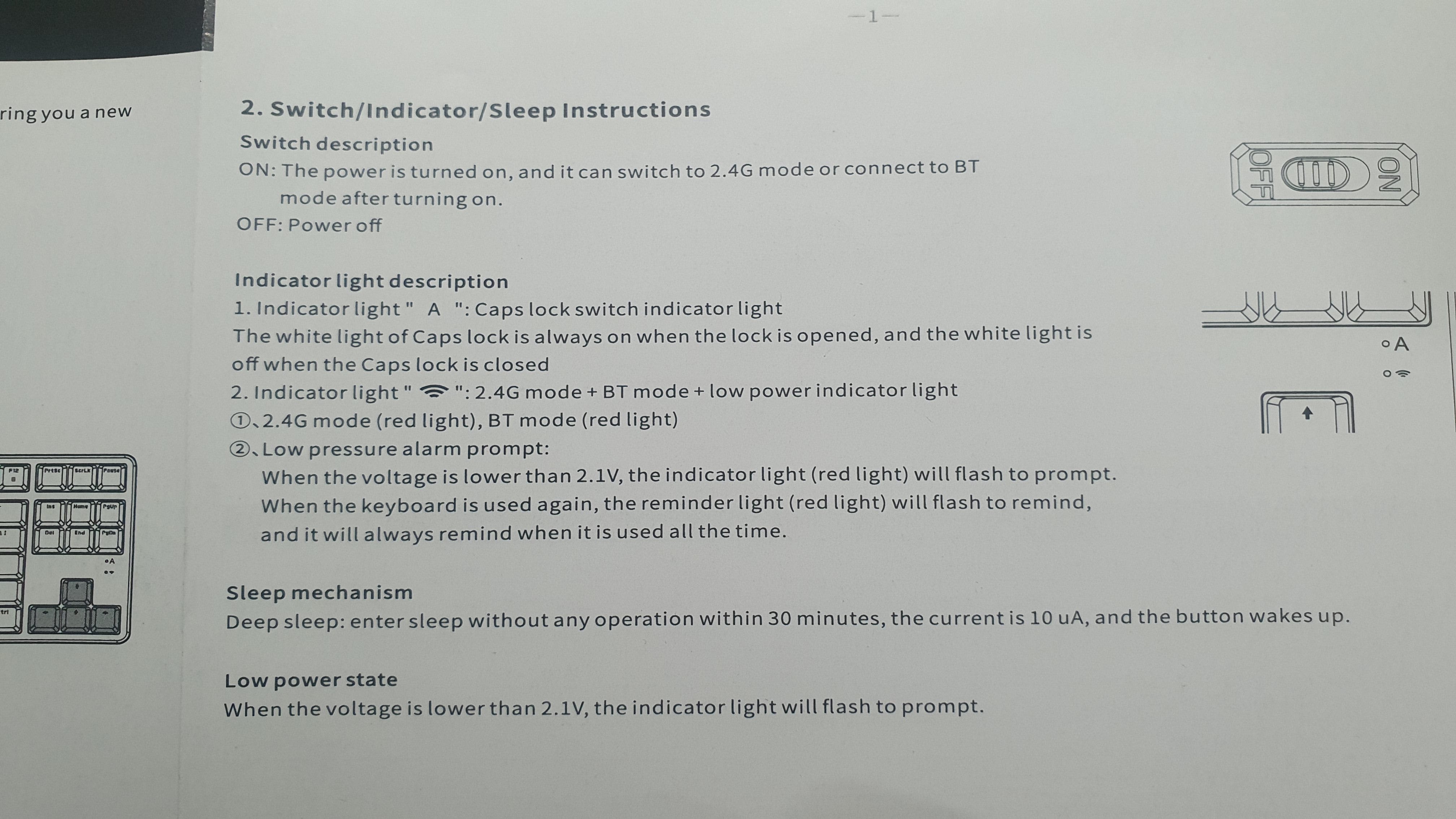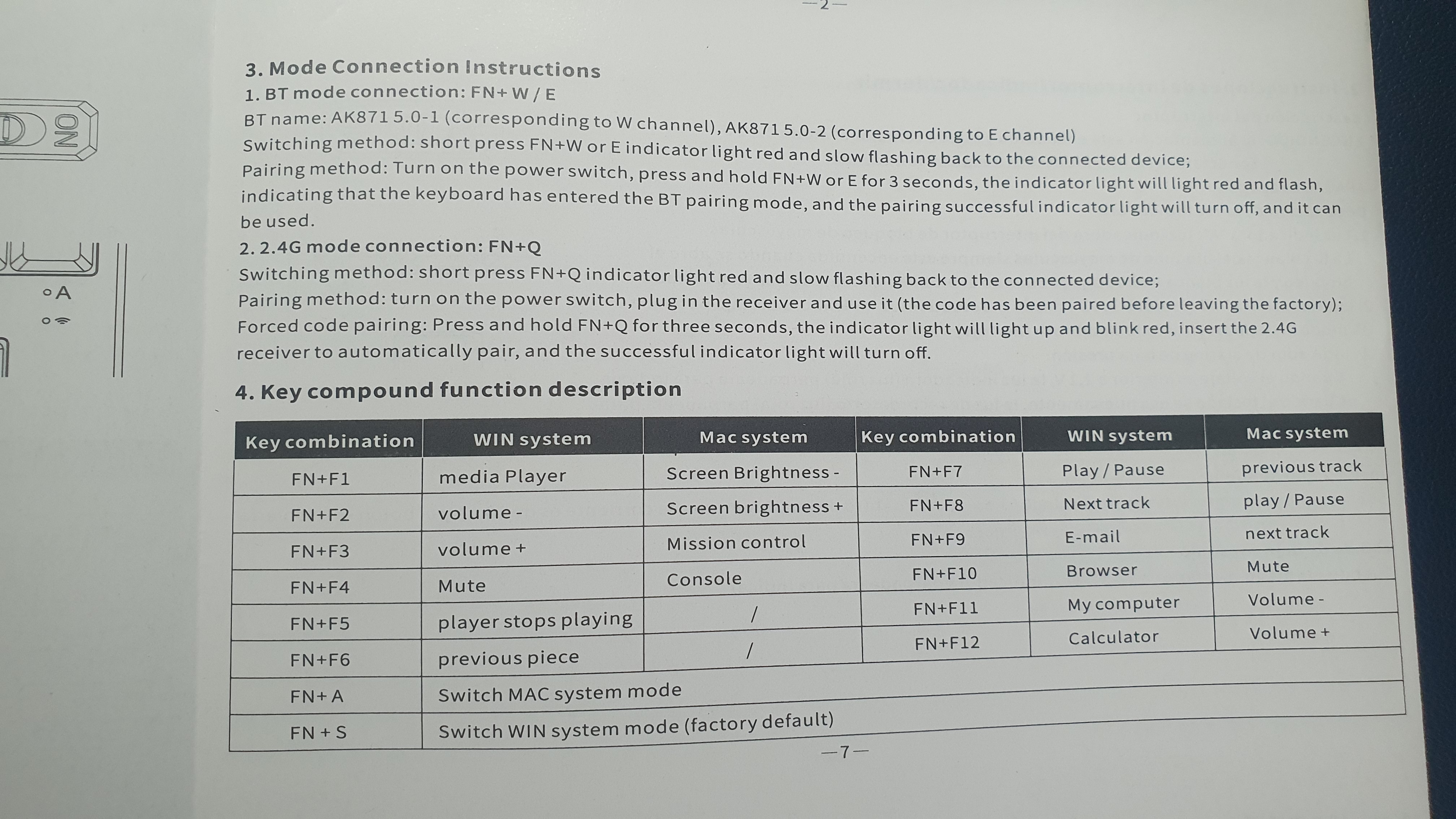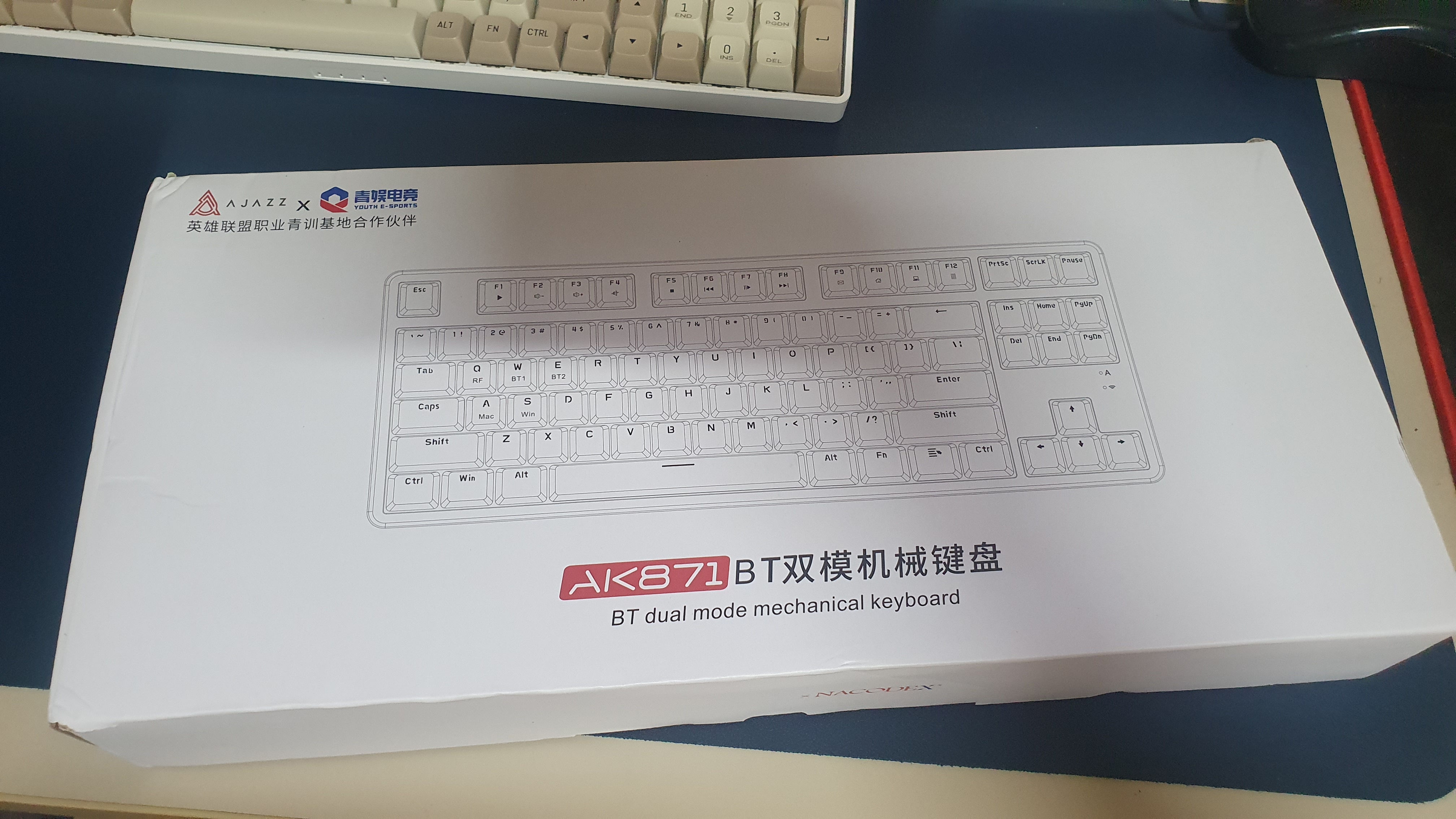 상자에 쓰여있는 간단한 스펙이다. 무선동글을 이용한 2.4G 무선 모드 그리고 블루투스 연결을 지원한다. 유선은 지원하지 않는다. 맥과 윈도 모드의 전환이 가능하여 모두 사용이 가능하다. AJAZZ x NACODEX라고 쓰여 있는데 NACODEX가 뭔지는 잘 모르겠다. 두 회사가 합작으로 만들었다는 뜻인가?