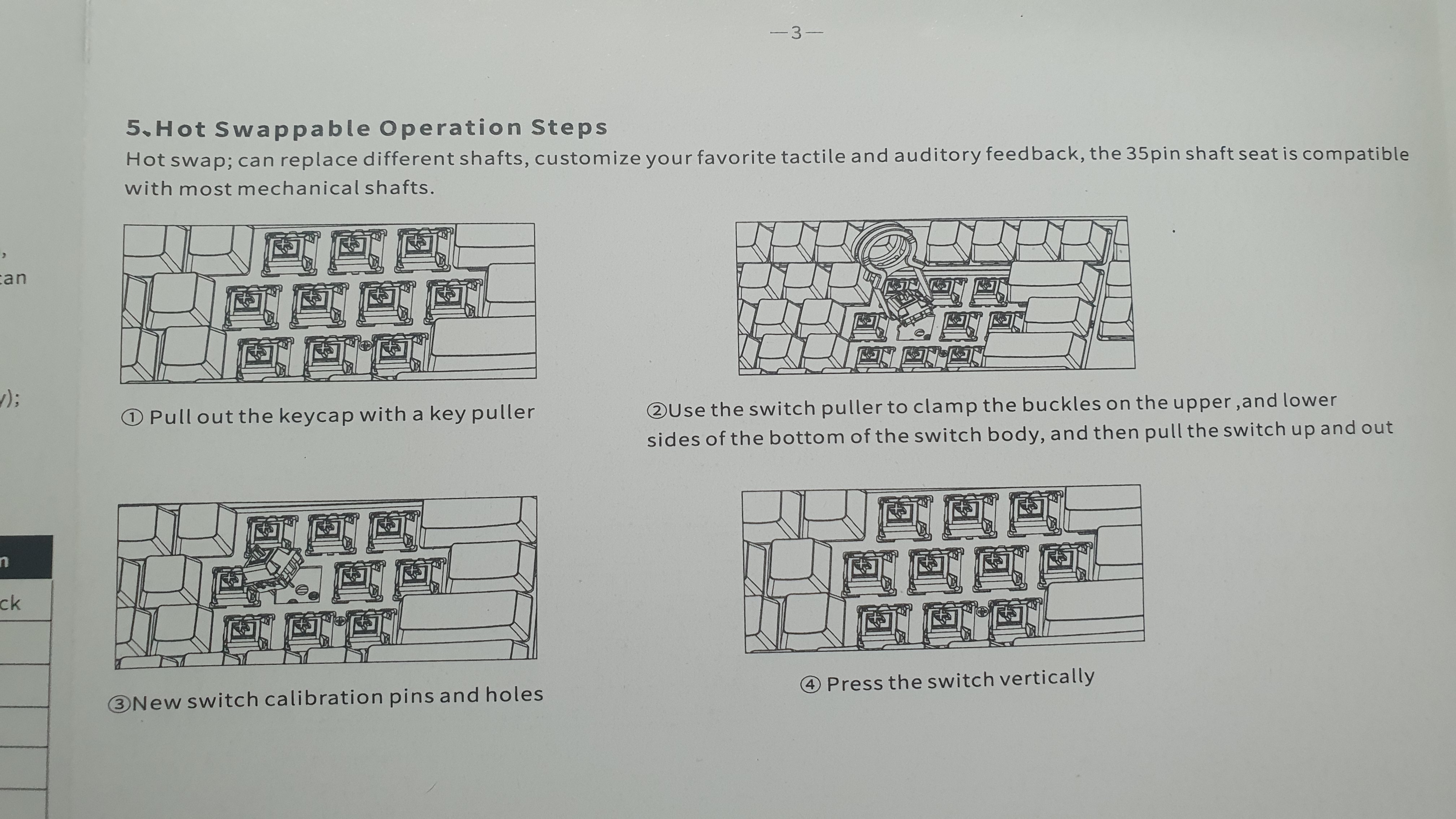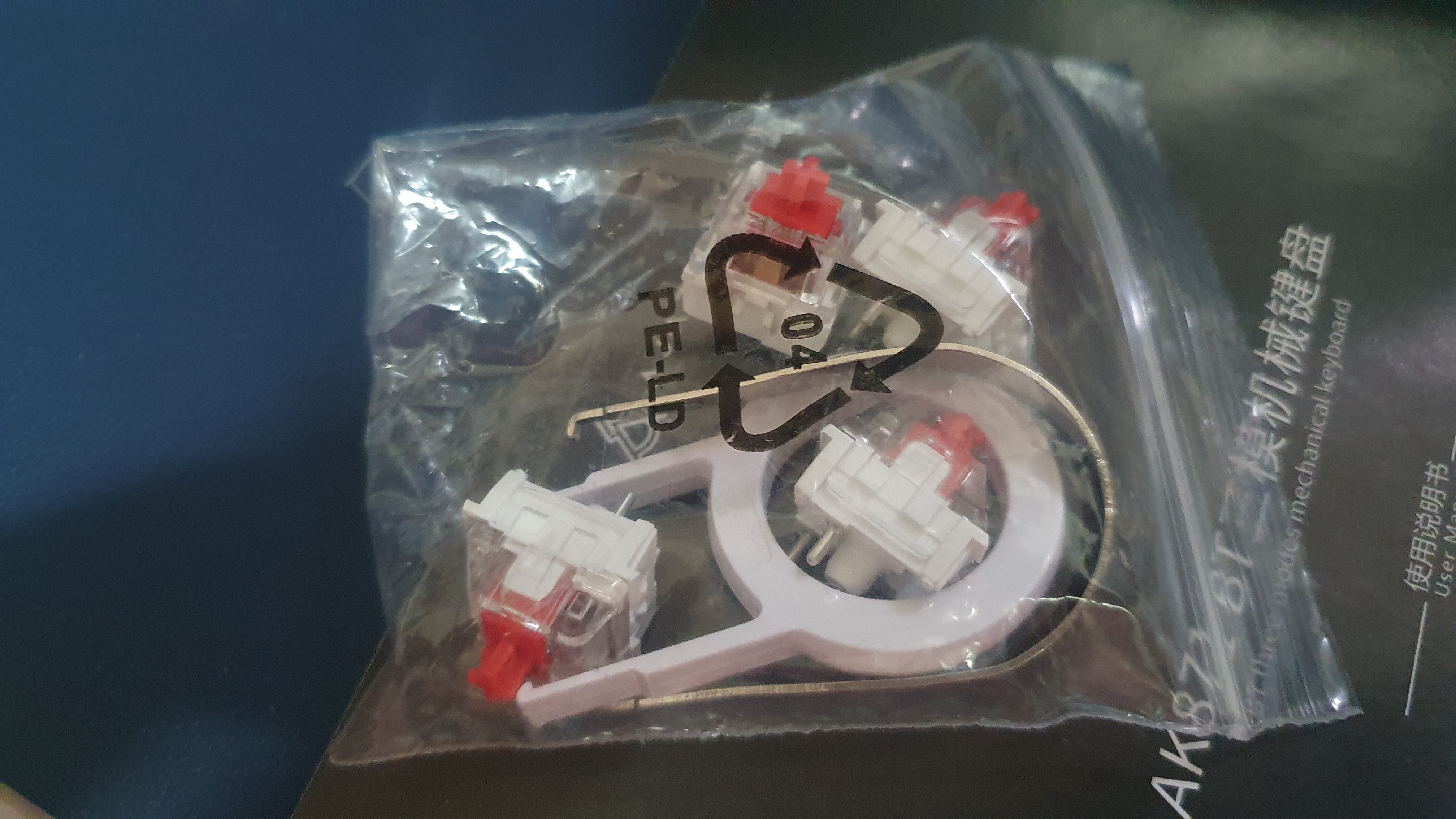 여분의 적축 스위치 4개와 키캡 리무버가 들어있다. 스위가 고장나도 새 걸 끼워주면 쓸 수 있는 핫스왑 방식이니 천년만년 쓸 수 있는 느낌?
