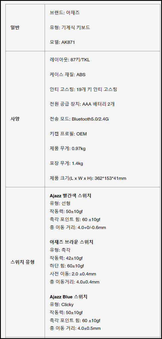 [24,260원](▼11%)💥국내 최초 출시💥AJAZZ 블루투스 무선 기계식 키보드 AK871/듀얼 페어링/핫스왑