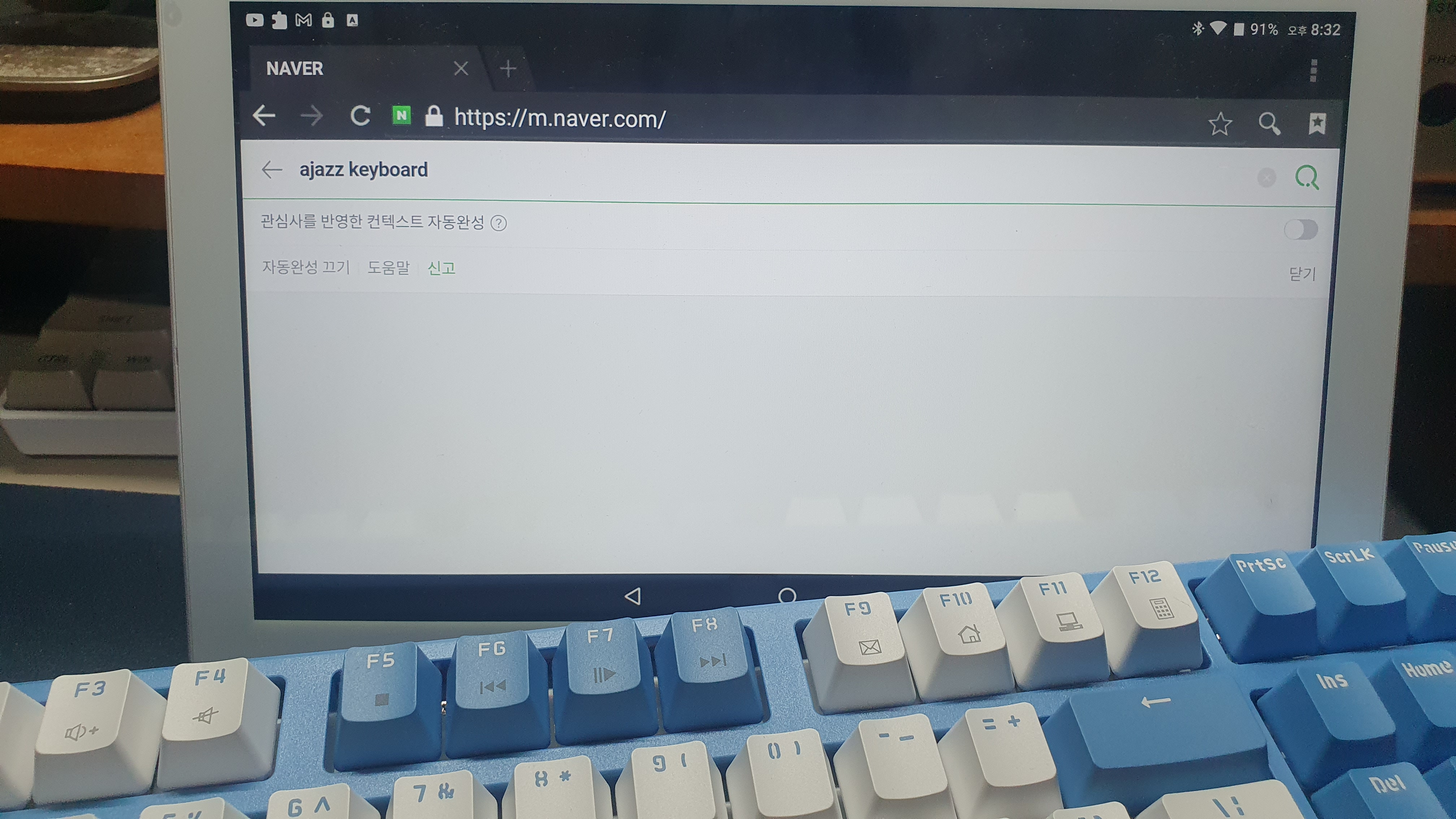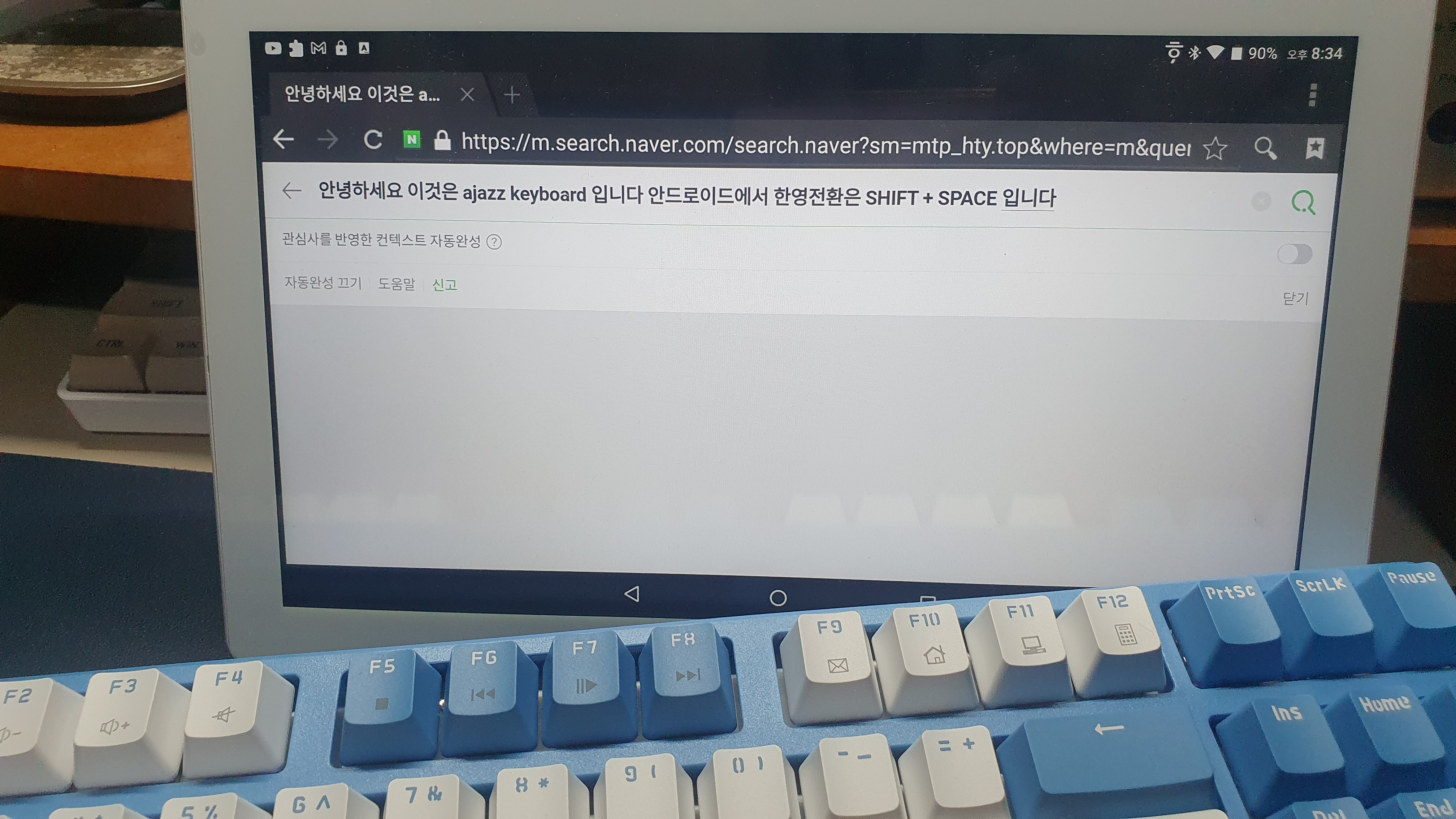 영문만 입력되길래 한글은 어떻게 입력하지? 하고 여러키를 눌러보니 Shift + Space를 누르니 한영전환이 되었다. 안드로이드 기기에서도 문제없이 사용이 가능했다.