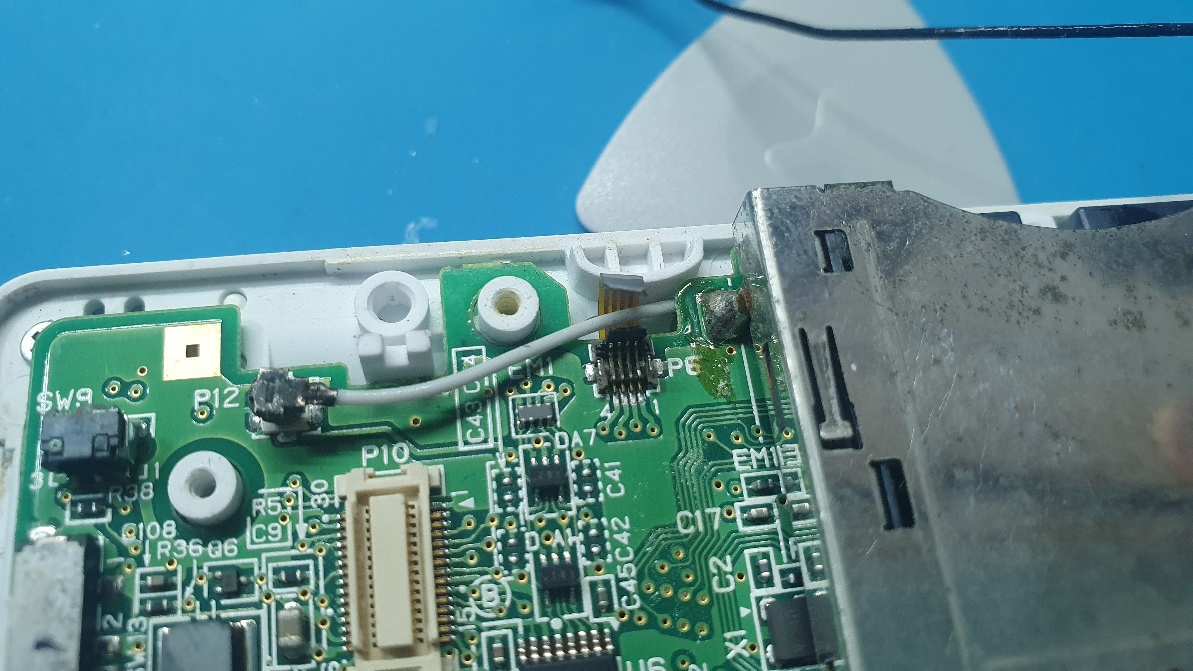 왼쪽을 보면 커넥터 2개와 와이파이 모듈(동그라미 부분)이 보인다. 와이파이 모듈에 꼽혀 있는 커넥터를 위로 들어 뽑아주고 와이파이 부품도 위로 조심스럽게 들어 뽑아준다. 기판에 꼽힌 커넥터도 뽑아준다. 손톱이나 작은 마이너스 드라이버를 이용하면 쉽게 뽑을 수 있다.