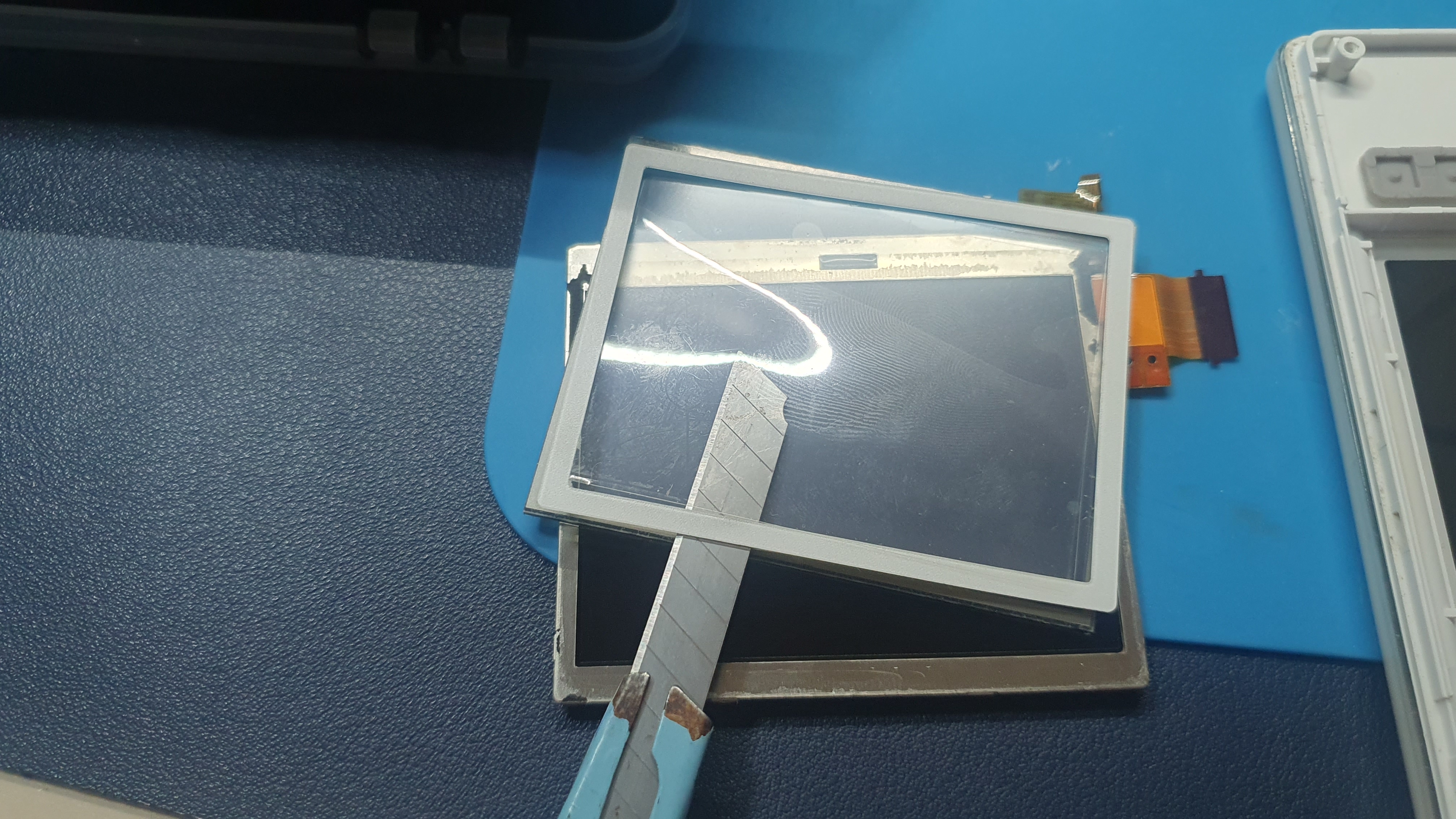 나의 경우 커터칼로 조심스럽게 터치스크린을 떼어냈다. 액정이 손상되지 않도록 최대한 천천히 칼을 넣어 떼어냈다.