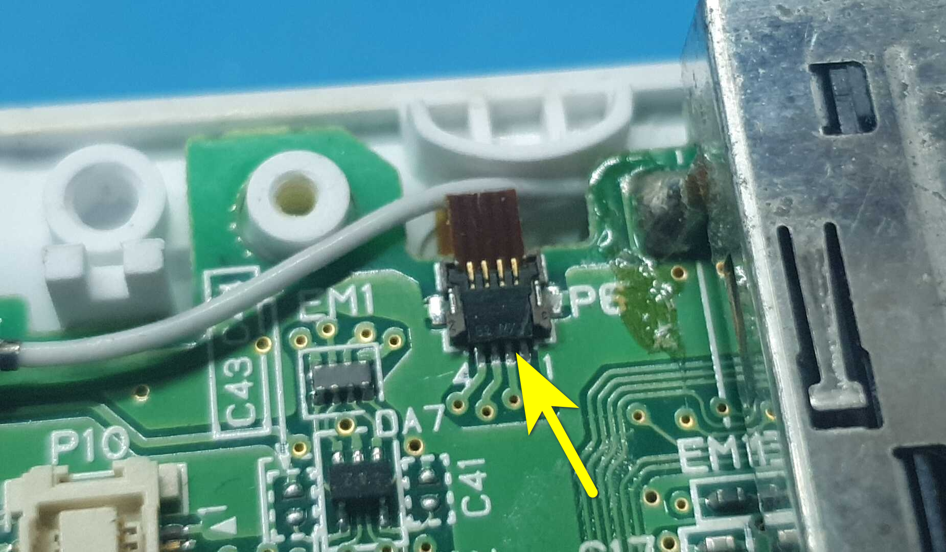 이 부분이 터치스크린이 연결되는 커넥터 부분이다. 핀셋이나 작은 드라이버로 살짝 들어올려주고 케이블을 당기면 케이블이 뽑힌다.