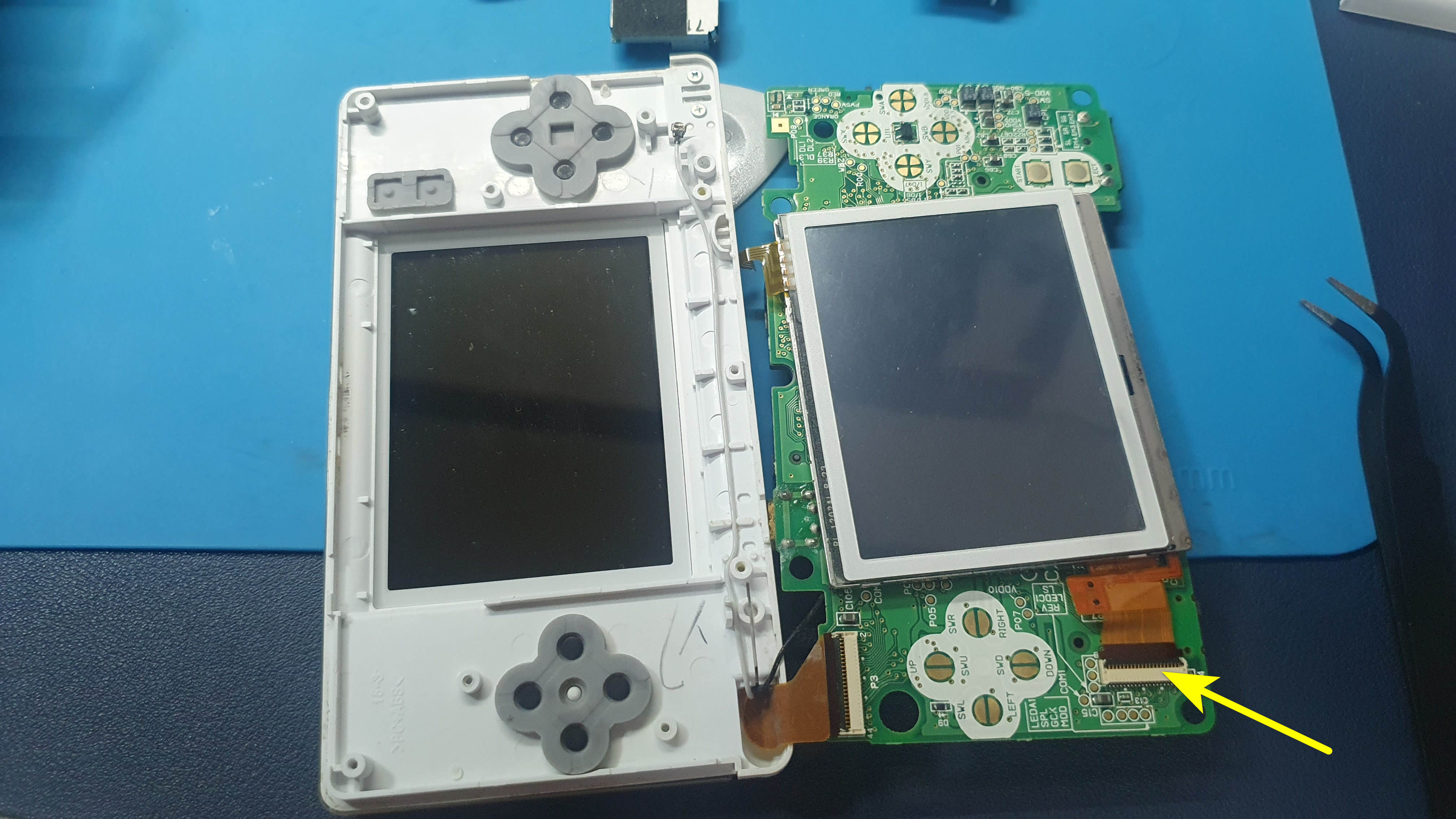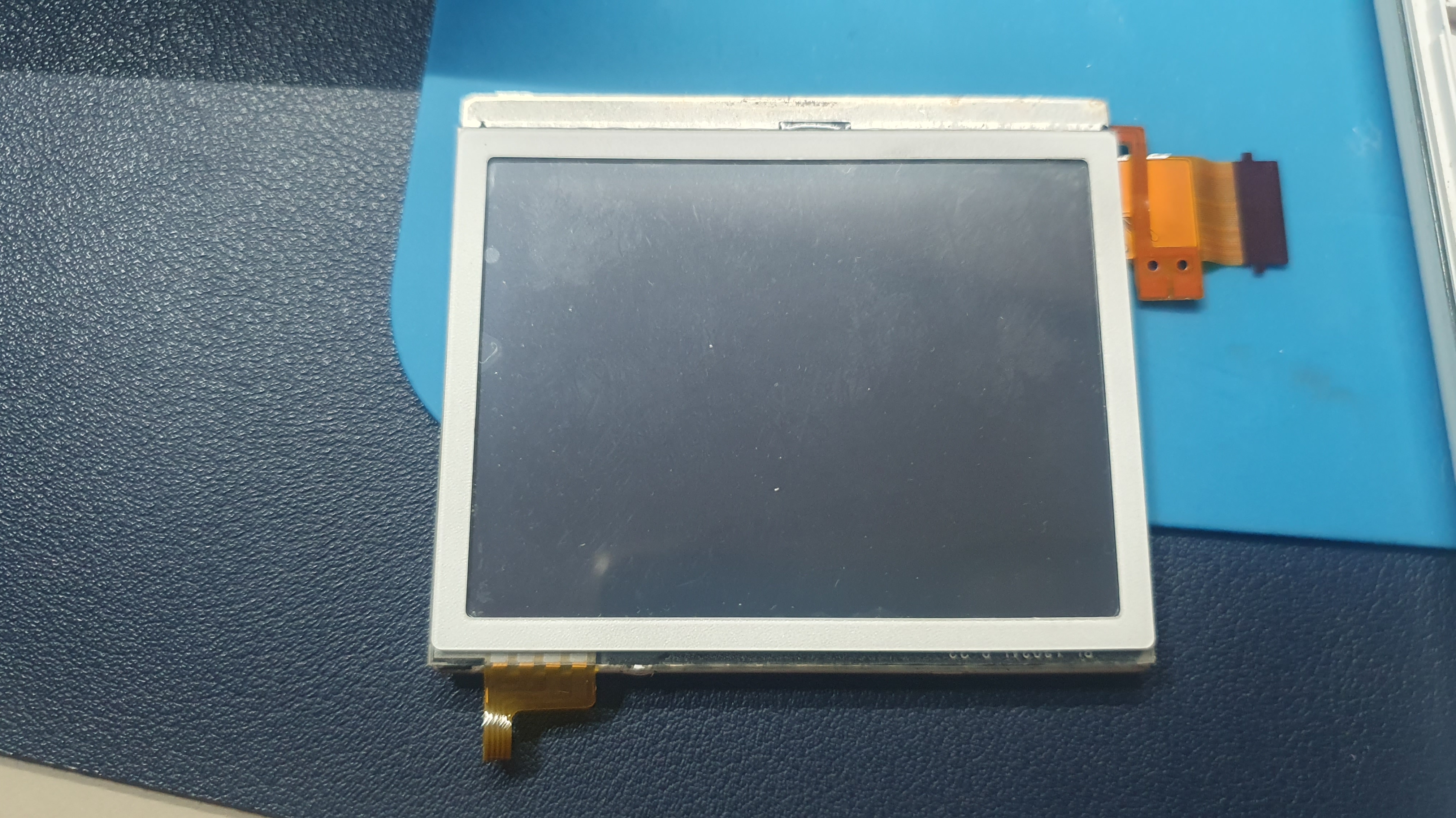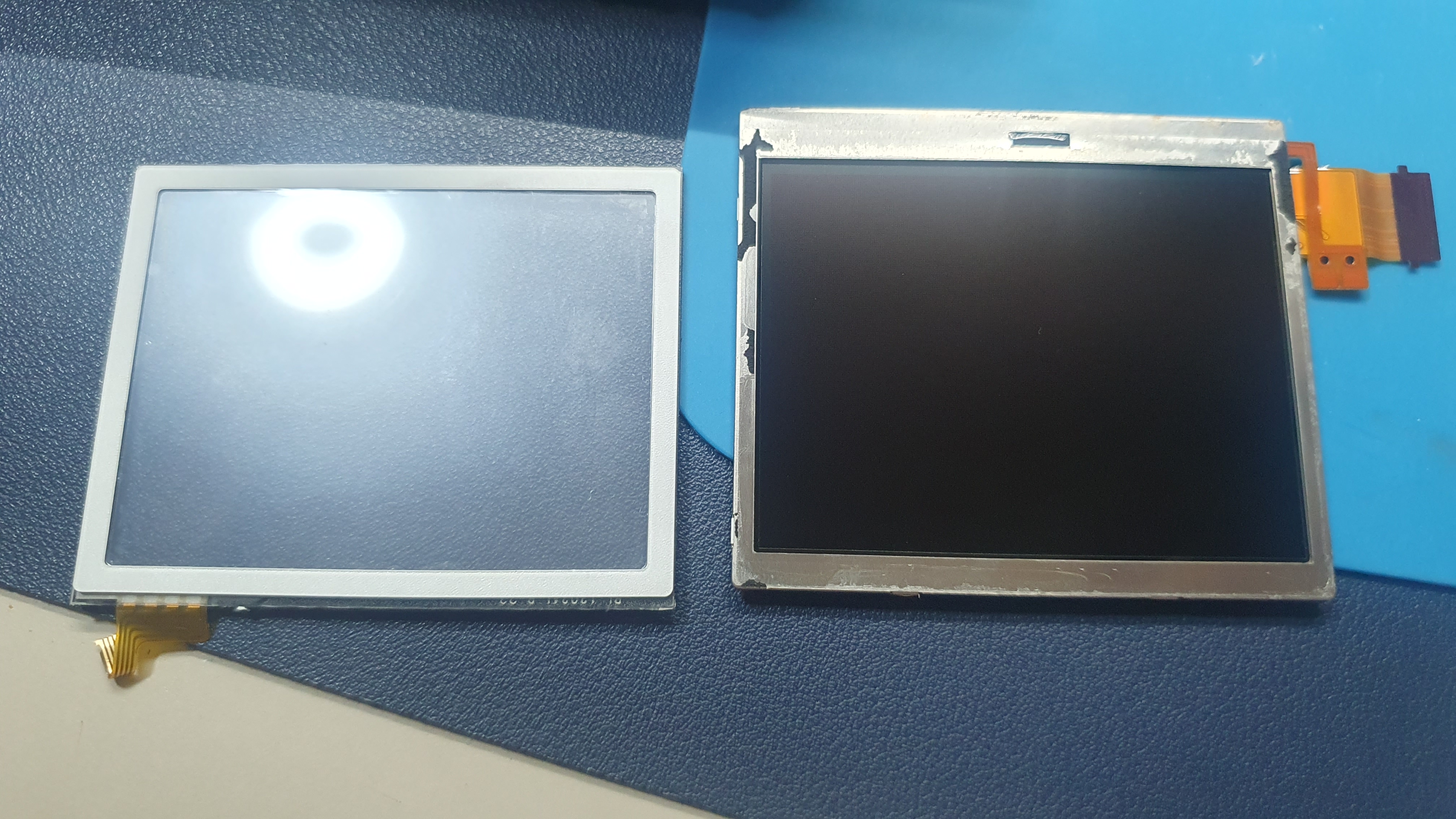 새로운 터치 스크린 부품을 액정에 부착했다. 부착을 쉽게 하는 방법은 게임기 상판(위 사진에서 왼쪽)에 액정 테두리와 터치스크린 그리고 액정을 겹쳐서 붙이면 깔끔하게 붙일 수 있다. 액정과 기판을 연결하는 케이블을 연결한다. 분해할 때와 마찬가지로 커넥터의 검은 부분을 위로 들어 올리고 케이블을 끝까지 잘 꼽아준 다음 커넥터 검은 부분을 꾹 눌러서 닫아주면 된다.