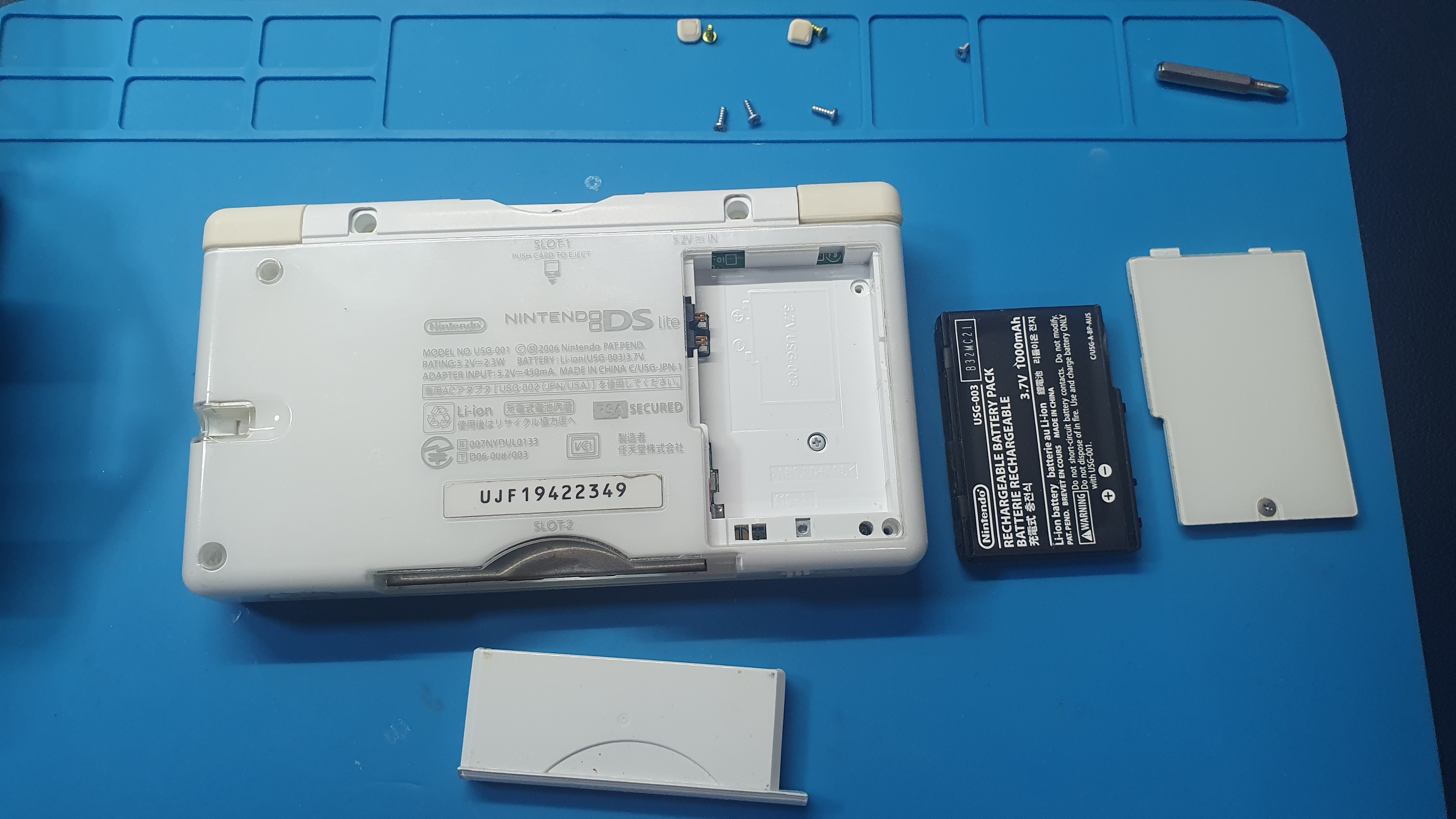 위의 사진과 같이 십자 드라이버와 Y자 드라이버 나사들이 따로 있으므로 모두 풀어준다. 당연하겠지만 배터리, 게임보이팩 덮개, 게임팩이 꼽혀 있다면 모두 제거해야 한다.